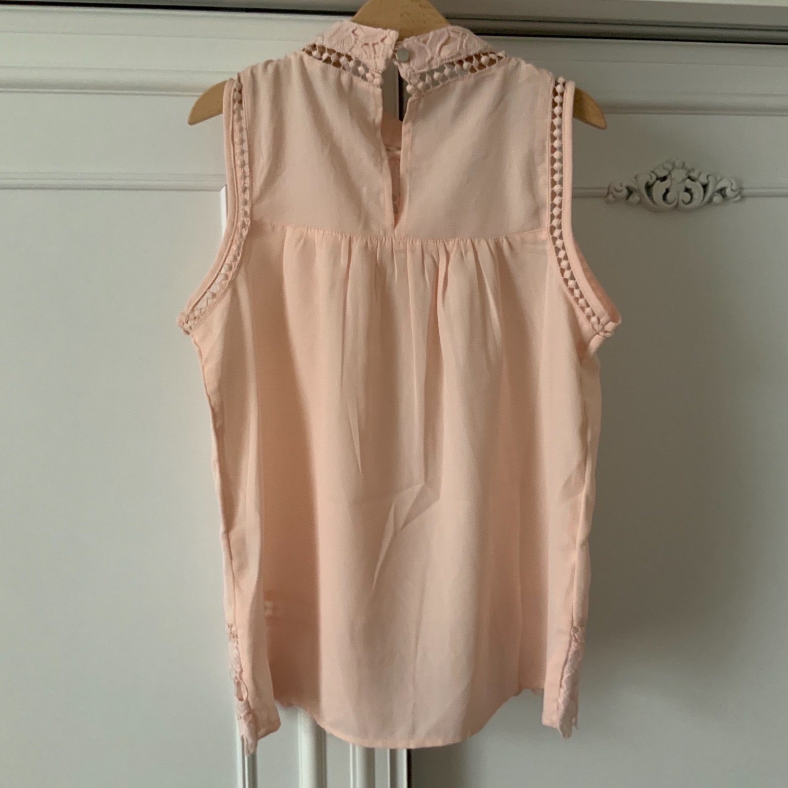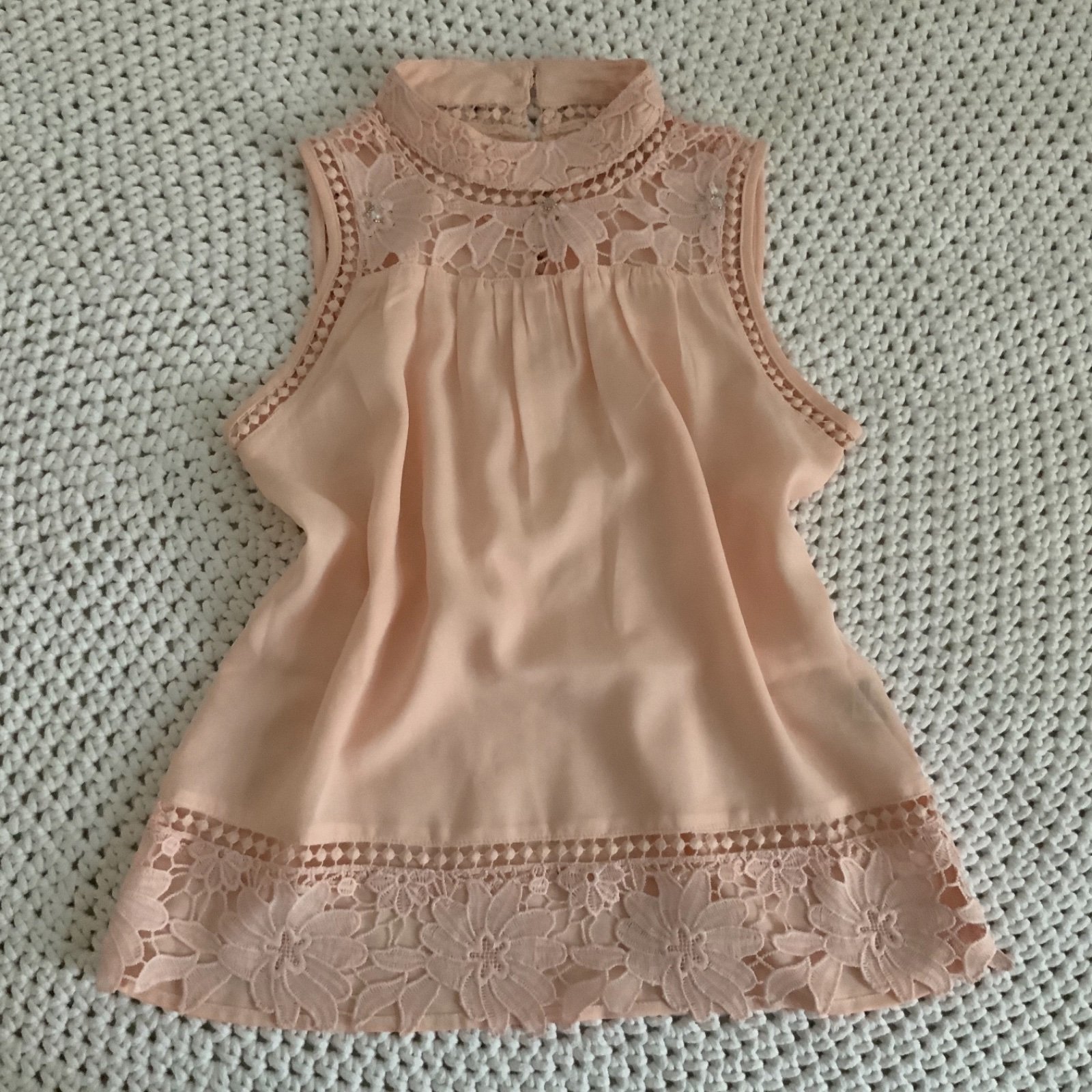 Ľahučká blúzka River Island č. 140, nosiť sa dá cca od 8 rokov v top stave, dcérka mala príležitostne, sedela jej ako 128/134, teraz ešte oblečie ako približne 140, ale je už tesná pod pazuchami. Krásna marhuľkovo-ružová farba, krajkové detaily.