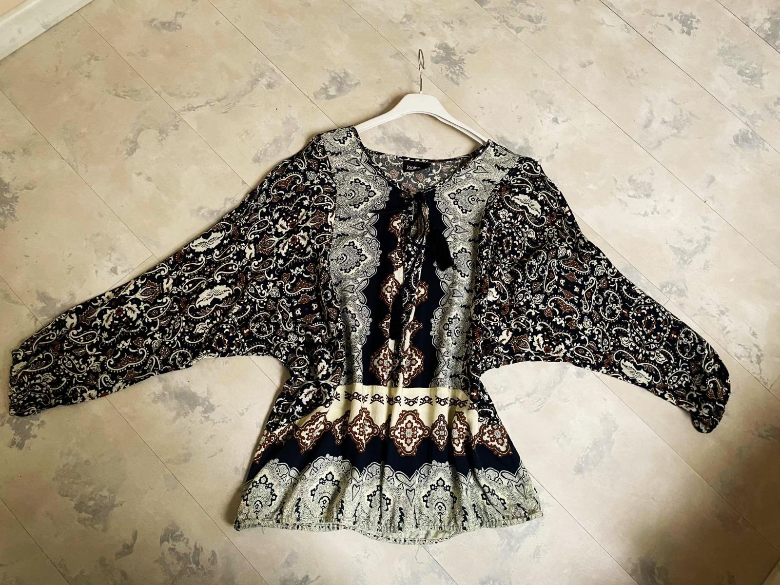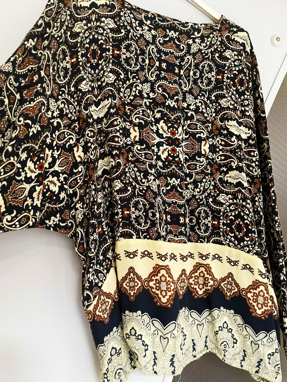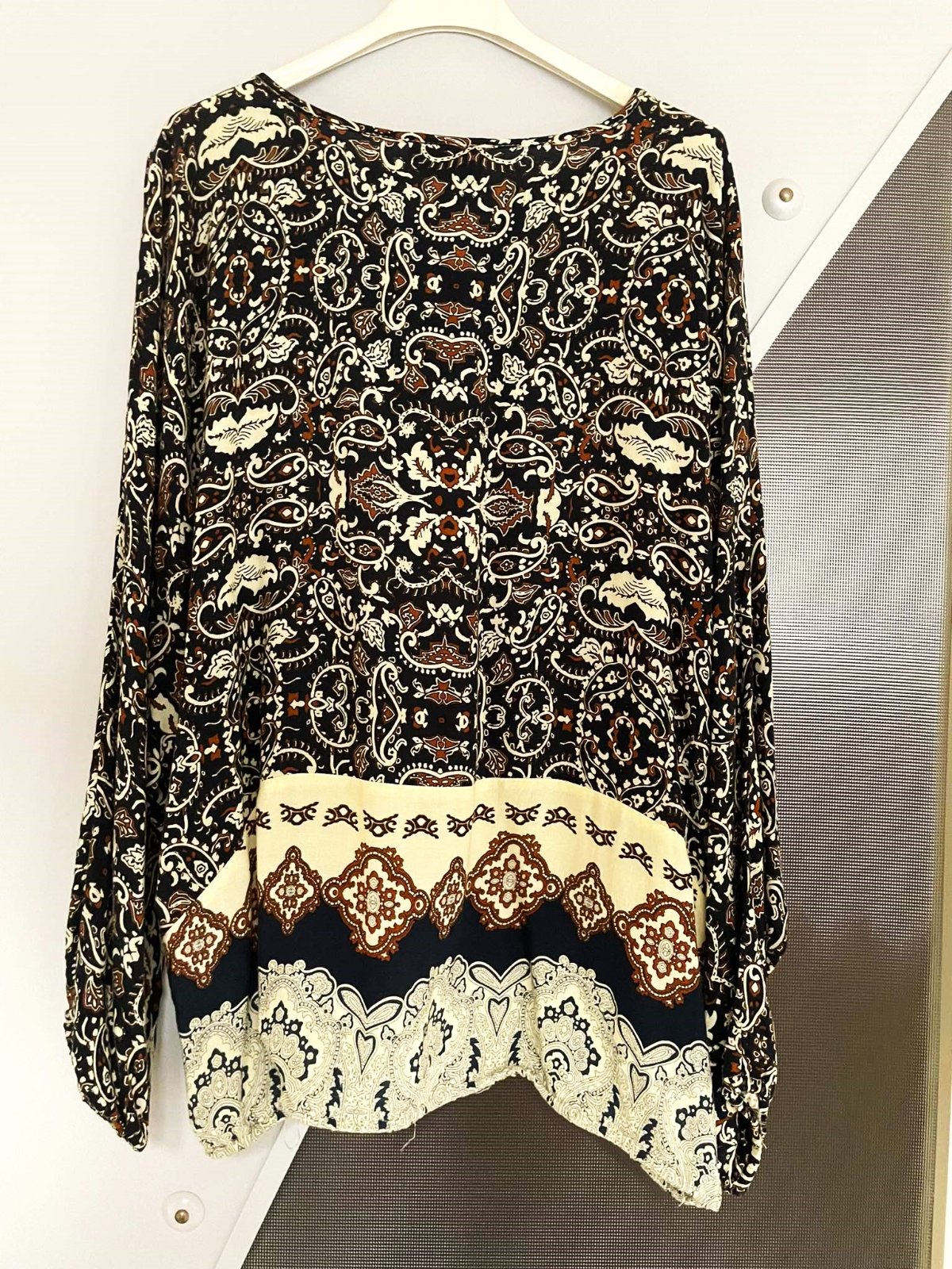 neznosená kvalitná blúzka zo 100% viskózy, rukávy a spodný obvod do jemnej gumičky,super k rifliam,ale aj inak,na pláž a na dovolenky,je veľmi vzdušná a ľahká,nosí sa voľná,rukávy netopierové,pekne zakryjú väčšie prsia, ak sa vykášu,vhodná aj na horúce leto,dlžka = 68 cm,rukáv = 62 cm,šírka = 57/58 x 2 cm