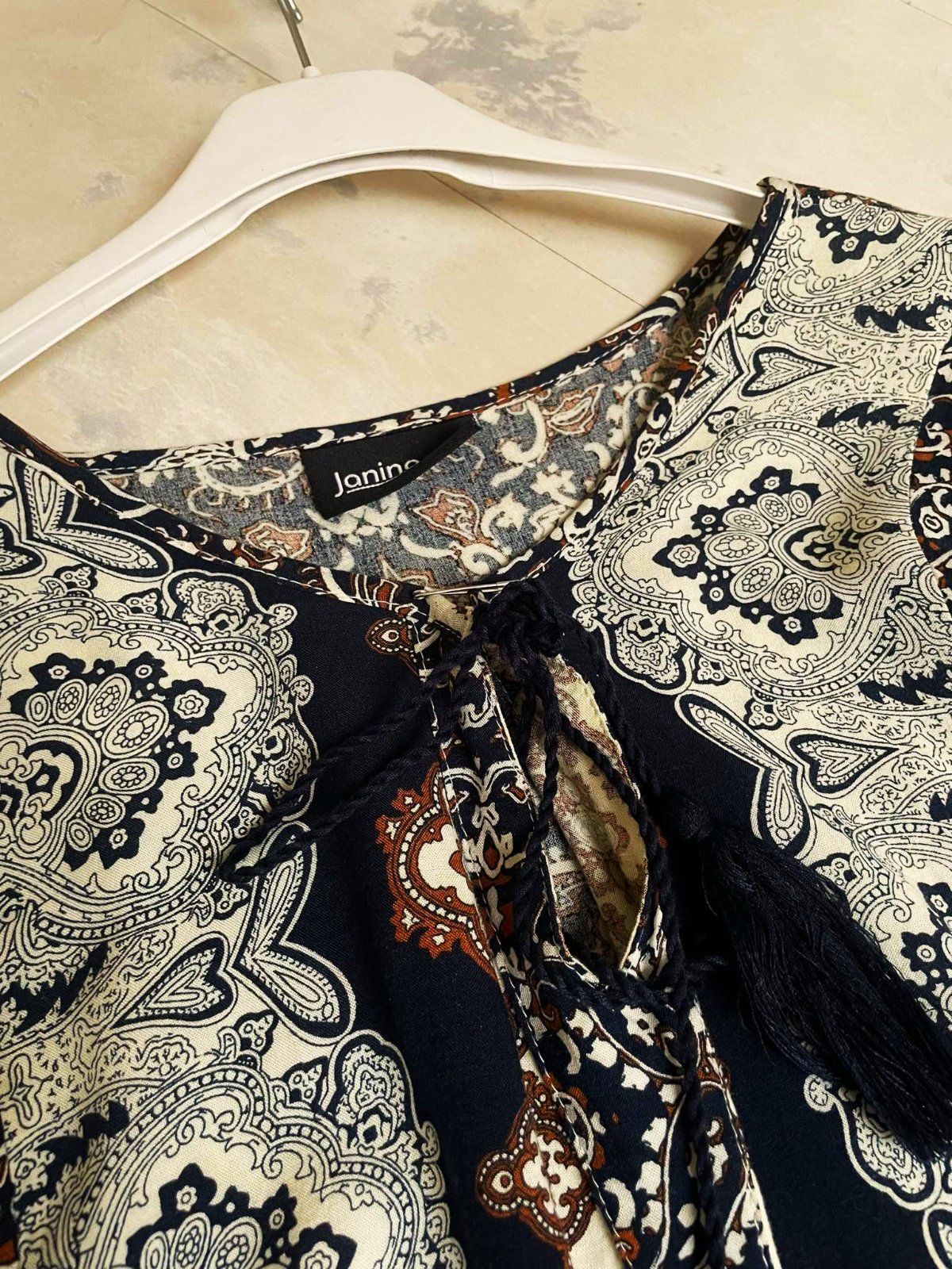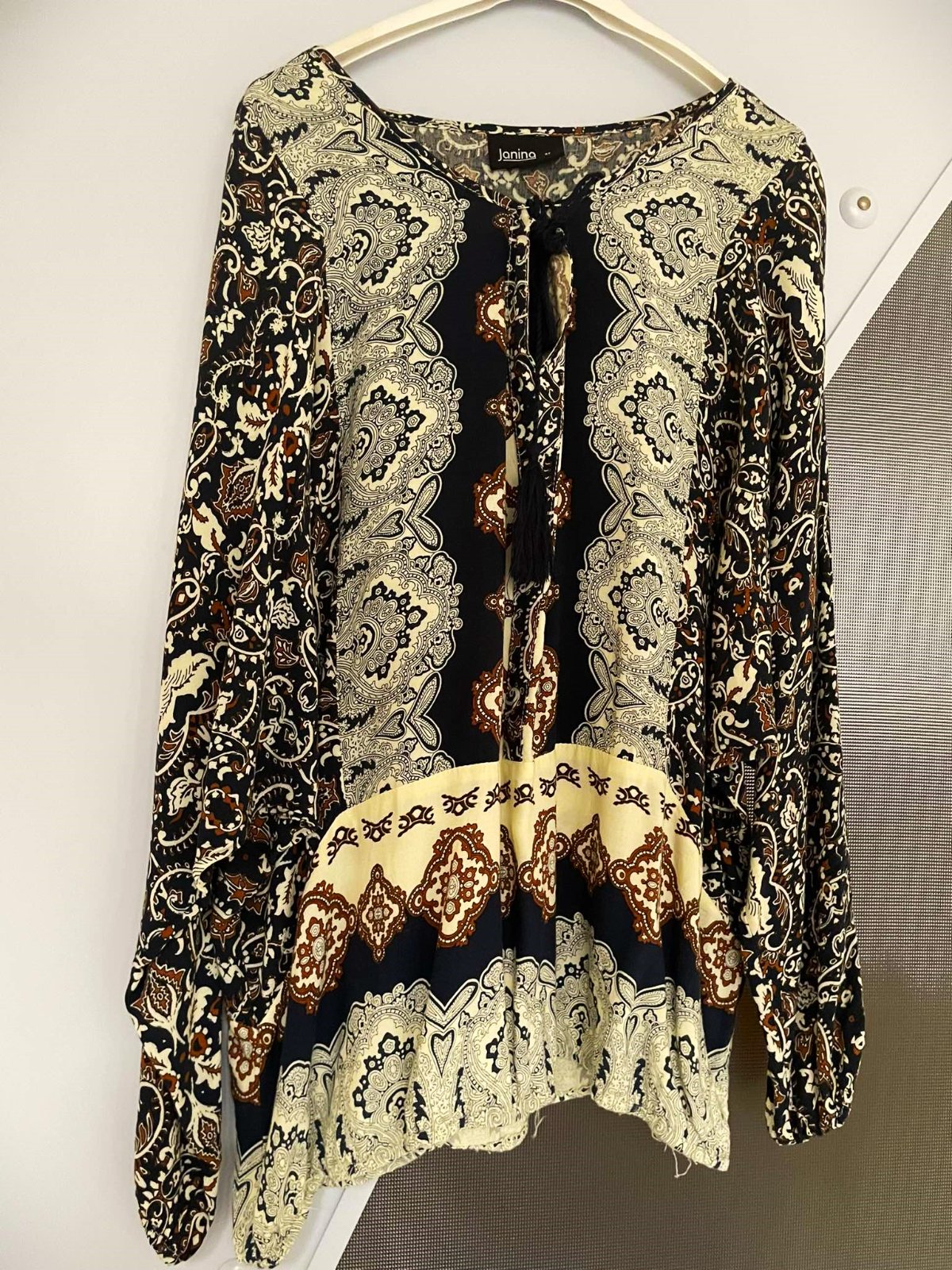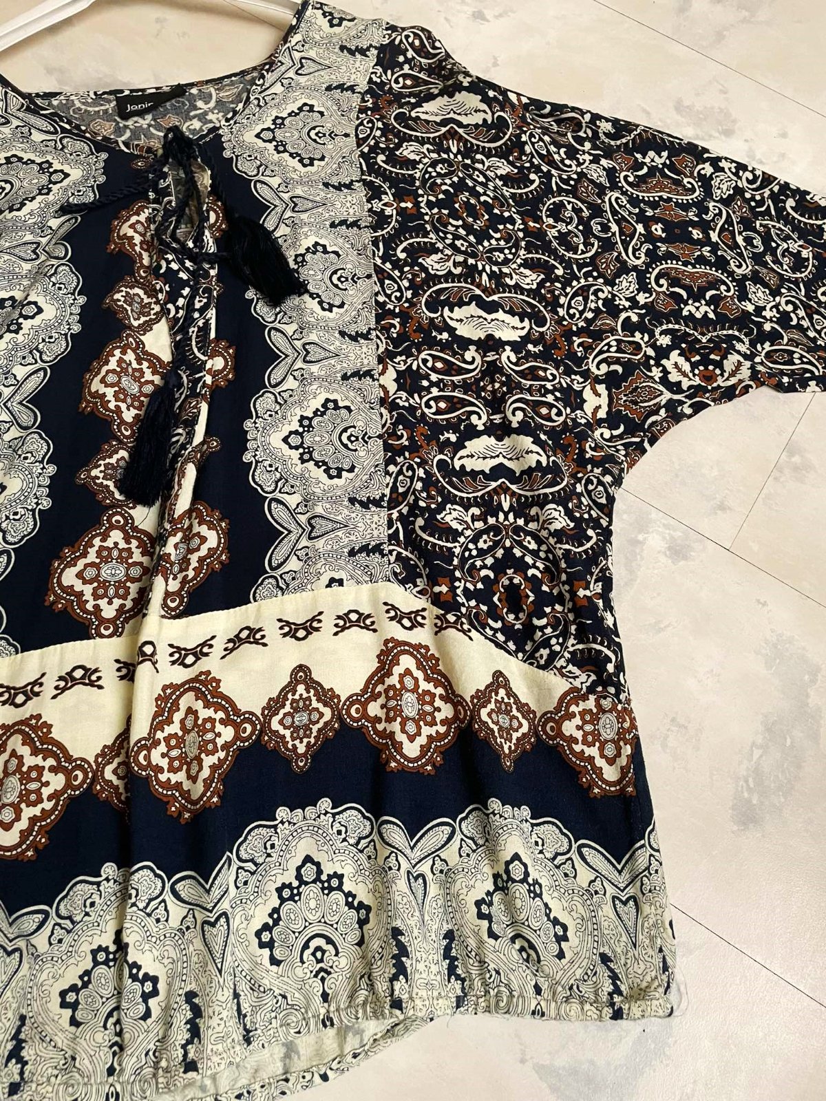 neznosená kvalitná blúzka zo 100% viskózy, rukávy a spodný obvod do jemnej gumičky,super k rifliam,ale aj inak,na pláž a na dovolenky,je veľmi vzdušná a ľahká,nosí sa voľná,rukávy netopierové,pekne zakryjú väčšie prsia, ak sa vykášu,vhodná aj na horúce leto,dlžka = 68 cm,rukáv = 62 cm,šírka = 57/58 x 2 cm