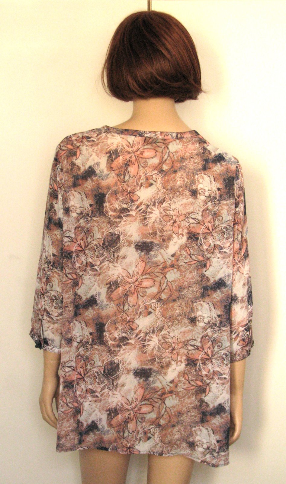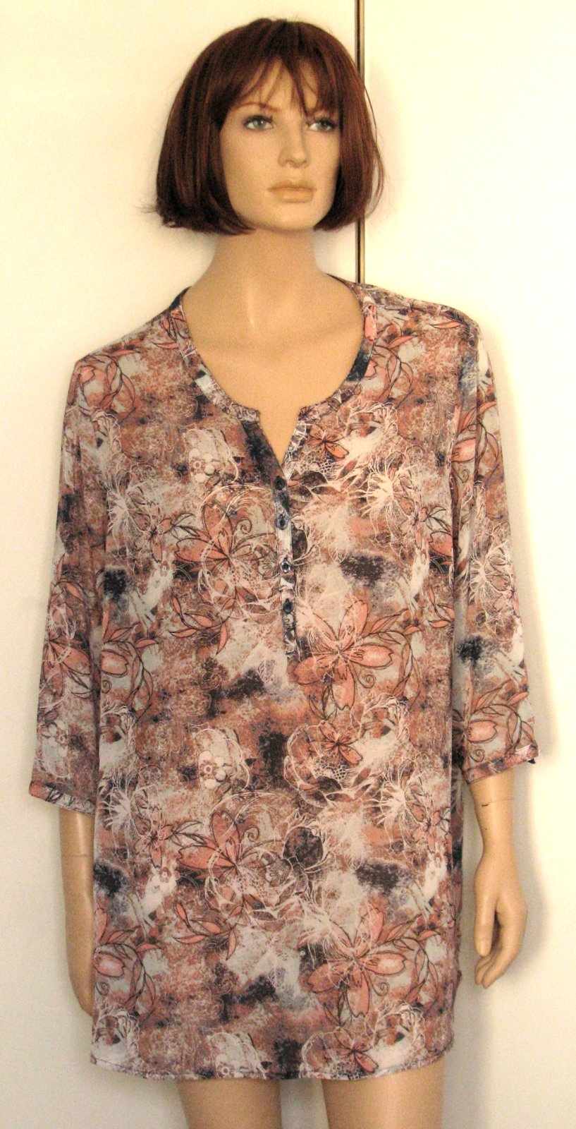 Vzorovaná blúzka z ľahkého tenkého šifónu, dlhšieho strihu, s trojštvrťovými rukávmi. Materiál je polyester. Je jemne transparentná, ale vďaka vzoru nič nevidno. Výborne zachovalá, bez poškodení. Veľkosť uvedená 48, ako oversize by ale mohla byť aj na menšie veľkosti. Šírka od podpazušia k podpazušiu je 65 cm.