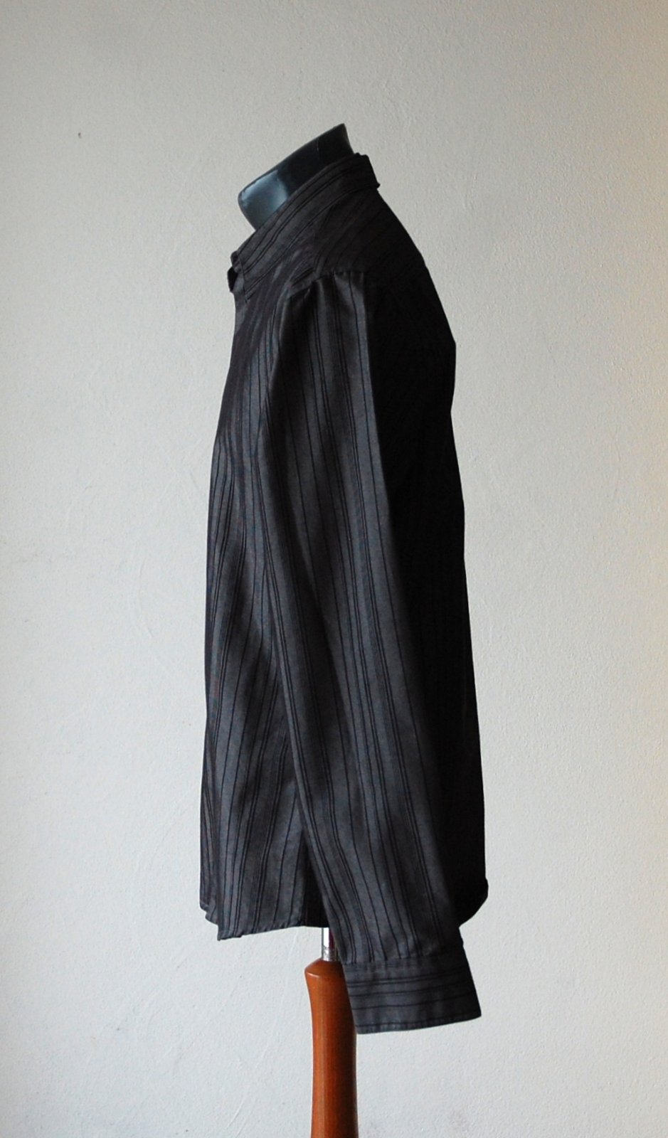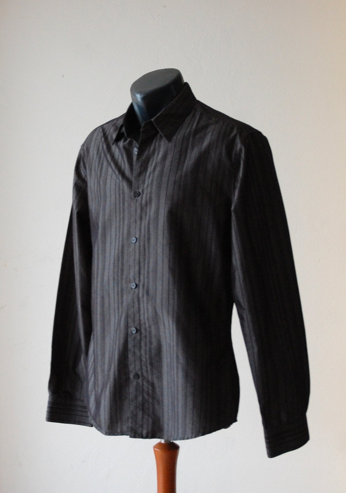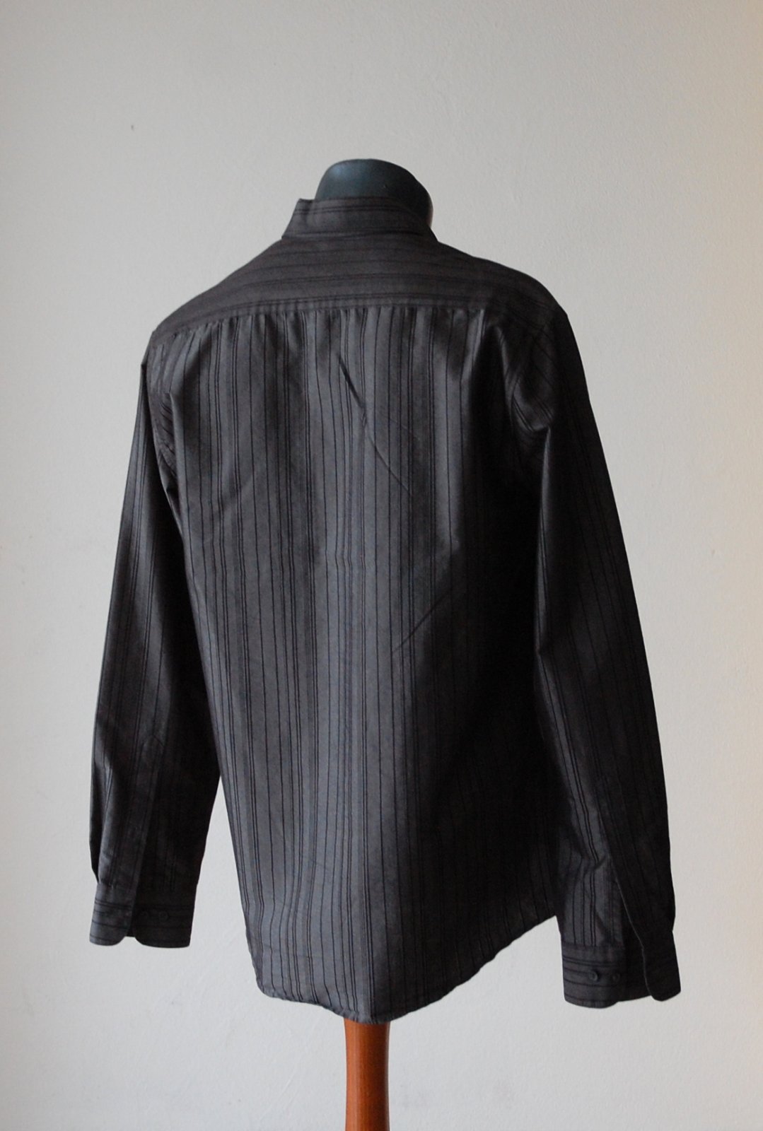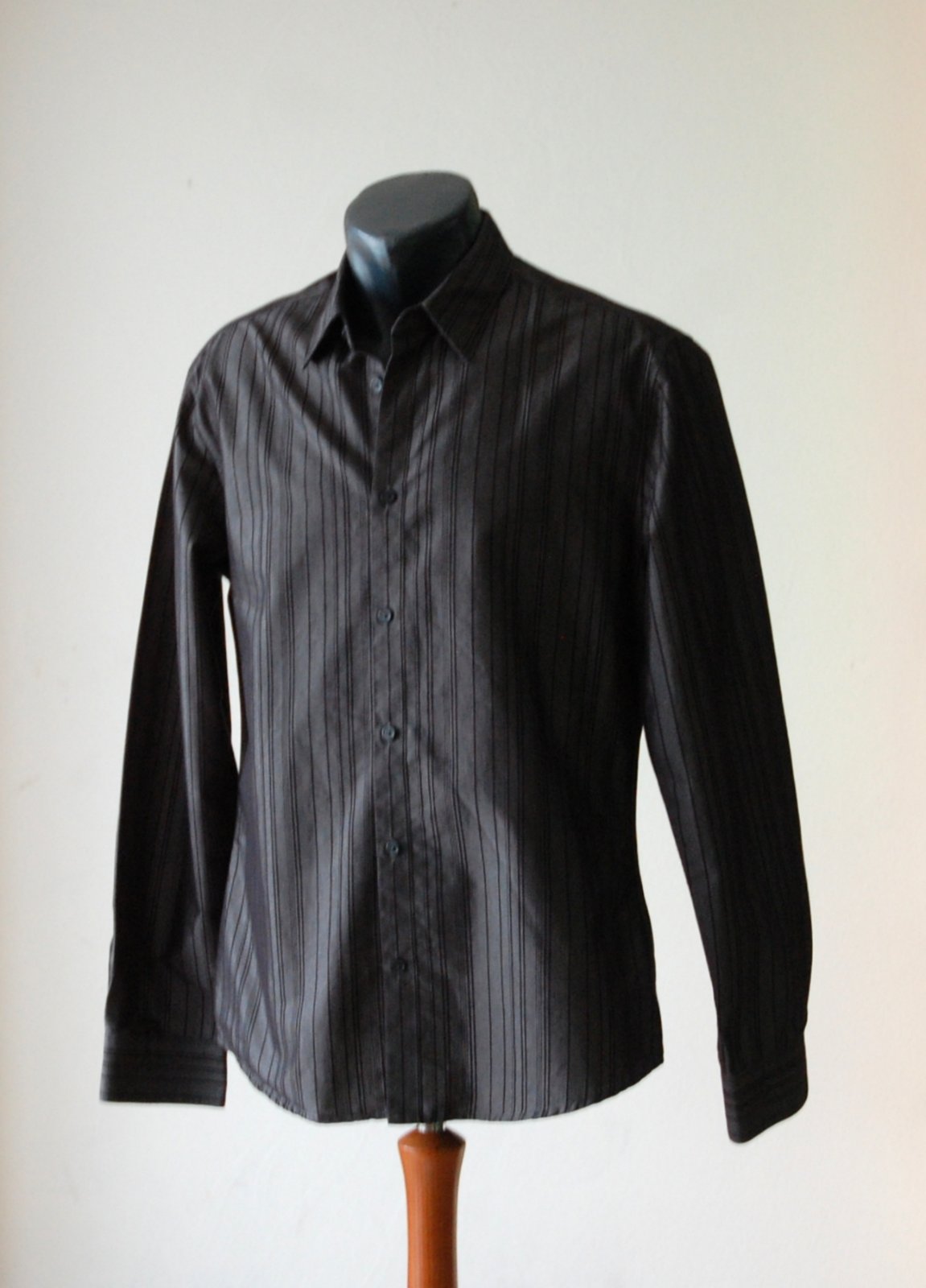 Predám elegantnú pánsku košeľu značky H&M v tmavosivej až čiernej farbe s jemným zvislým prúžkom. Košeľa má klasický golier a dlhý rukáv. Materiál je príjemný na dotyk, mierne štruktúrovaný. Ideálna na spoločenské udalosti, svadby alebo do práce k obleku.