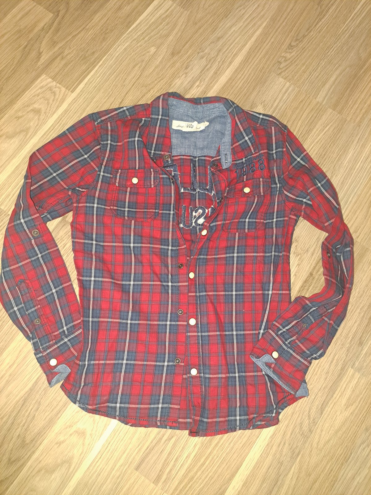 Károvaná košeľa pre malého frajera na 8 - 9 rokov, zapínanie na cvoky. Na pleci a chrbte vyšitá značka.