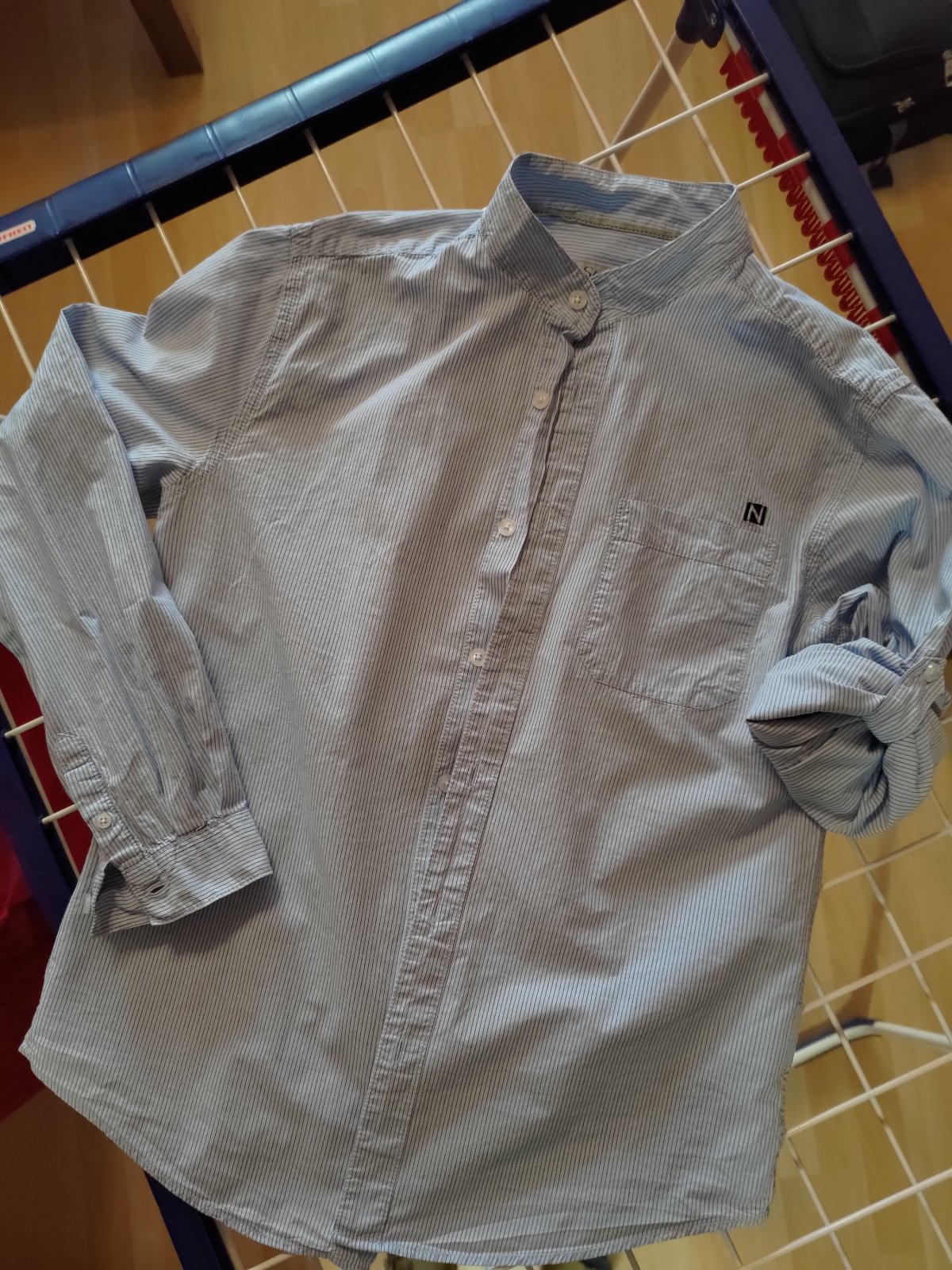 Ľahká letná košeľa značka Nukutavake, veľkosť písaná 16 / 166, ale myslím si, že je menšia. Tenké pásiky bledomodrá-biela. Na spodnom okraji je strihaná do oblúka.
