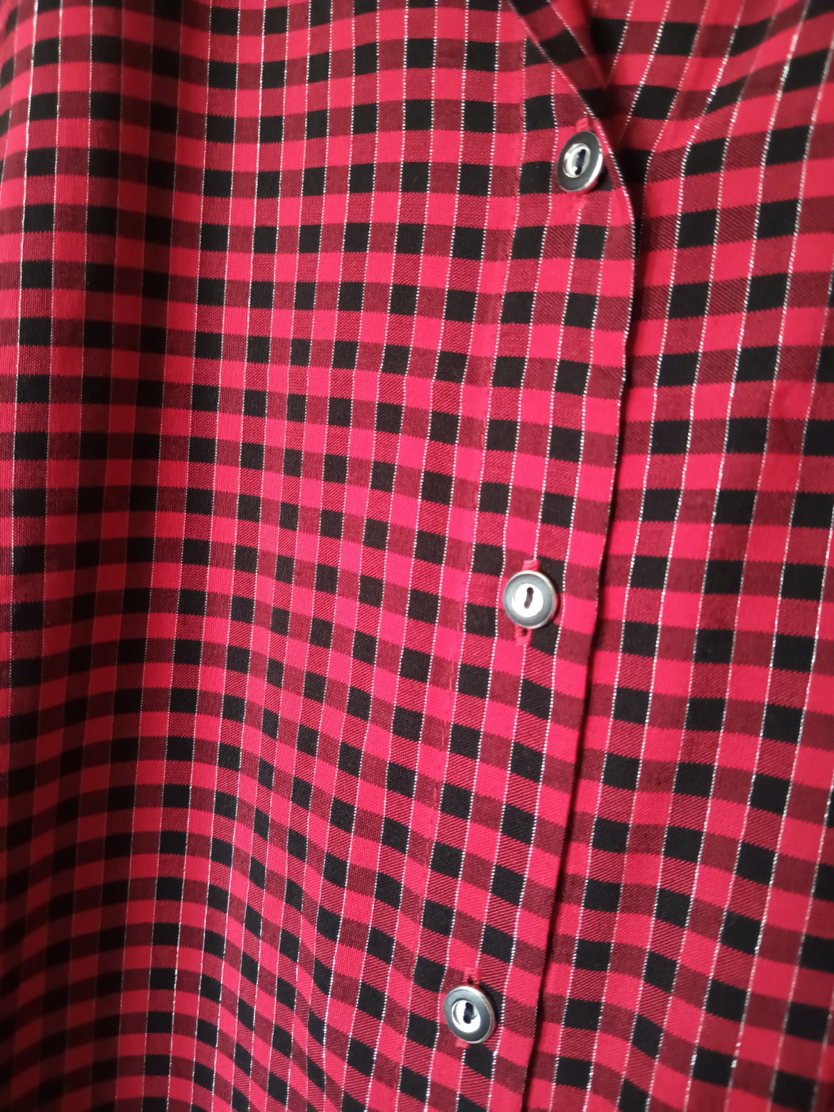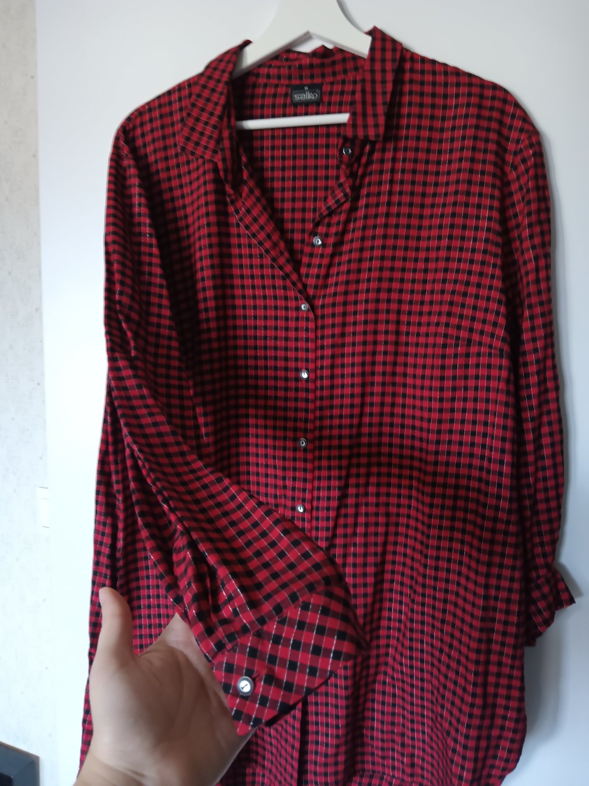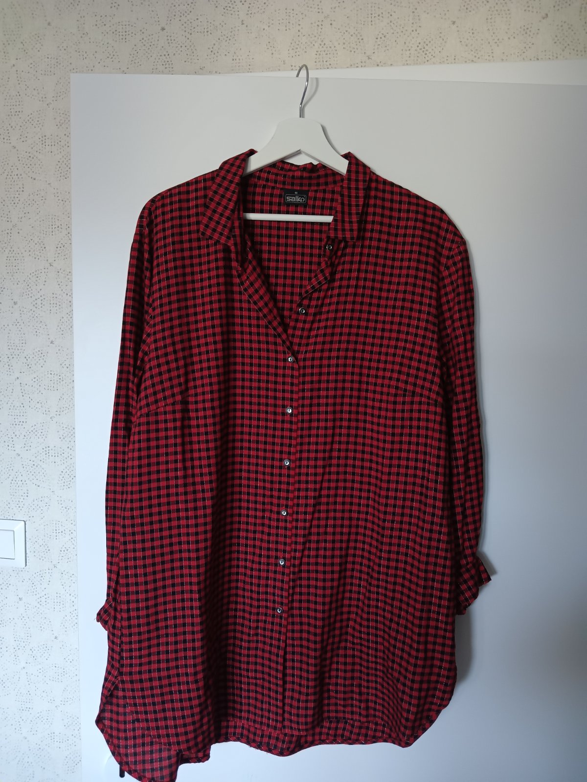 Predĺžená nová košeľa značky Salko, veľkosť 44/46, farba červená výrazná taká Vianočná, s čiernou a jemniu kesklou struebornou nitkou. Látka jemná ľahká, neelastické. Mäkká látka. Pekné detaily, zaujímavé gombíky.