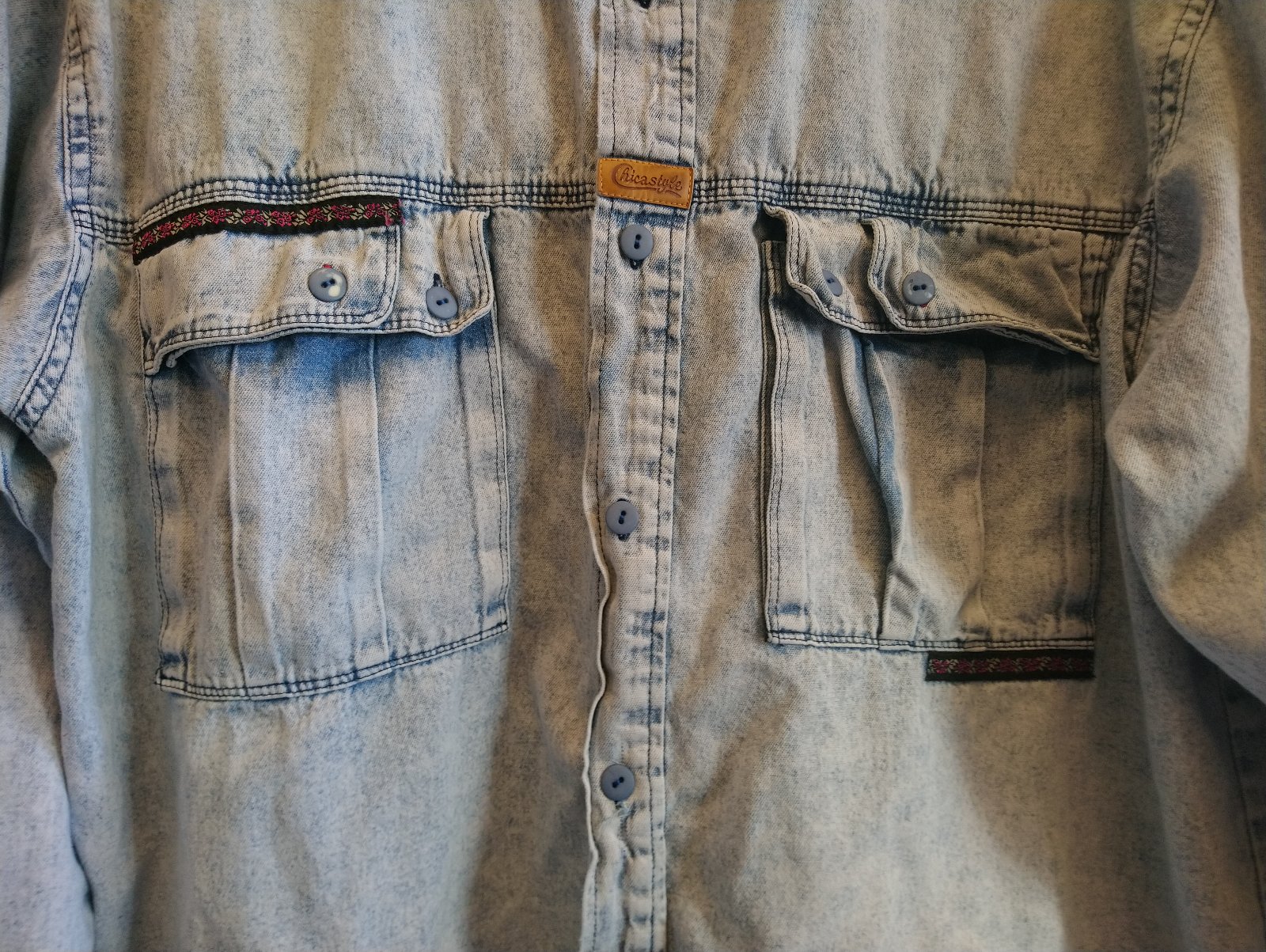 pánska svetlo modrá riflová košeľa, zapínanie na gombíky, náprsné vrecká,