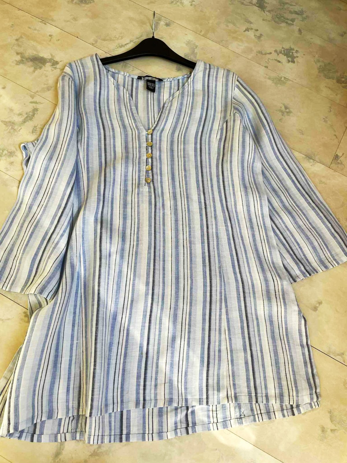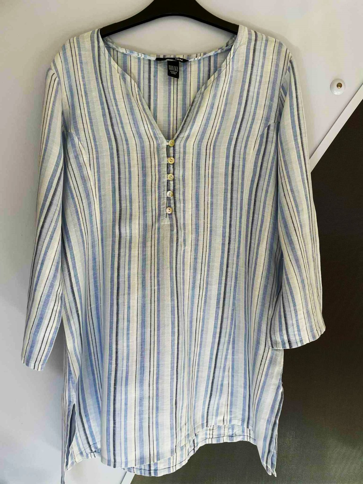 krásna ľahká vzdušná - skoro nenosená / použitá na 1 dovolenke/ ľanová tunika,v prírodnej naturálnej zastretej farbe, na velkosti M/L/XL,nosí sa voľná, padavá,vykrčená,po bokoch rozporky,super aj na pláž na plavky ako minišaty - lebo je ľahká,skladná a nevadí jej vykrčenie,perleťové gombíky,je strihaná nie vcelku,ale po bokoch vytvarovaná,rozmery :