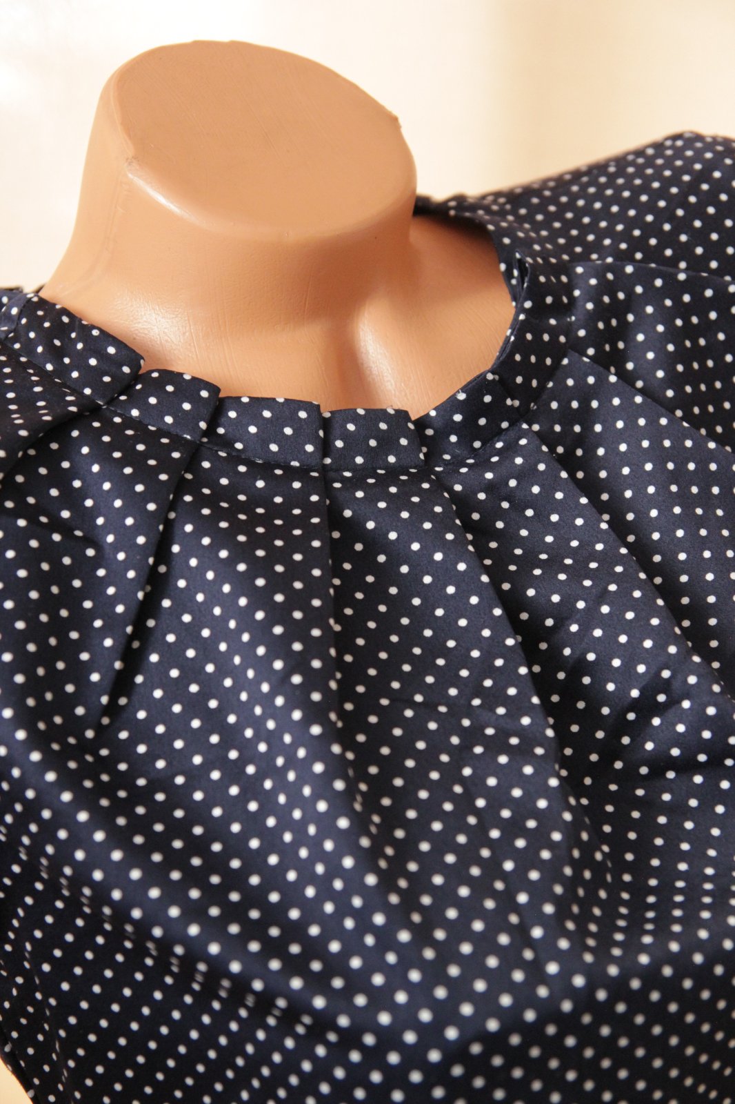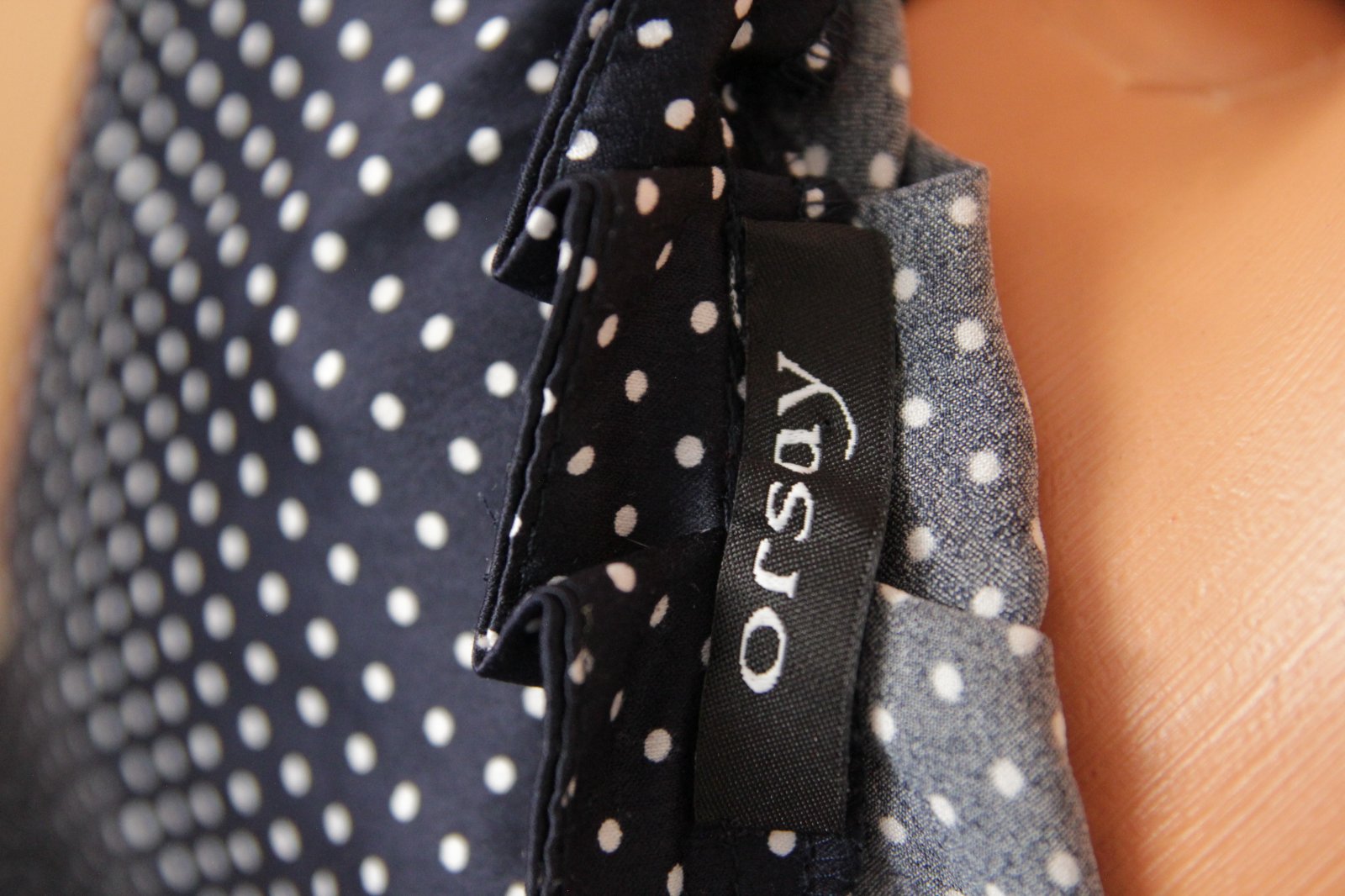 Modrá bodkovaná saténová elegantná blúzka, veľkosť S. Značka Orsay. Vpredu má pár zatiahnutí.