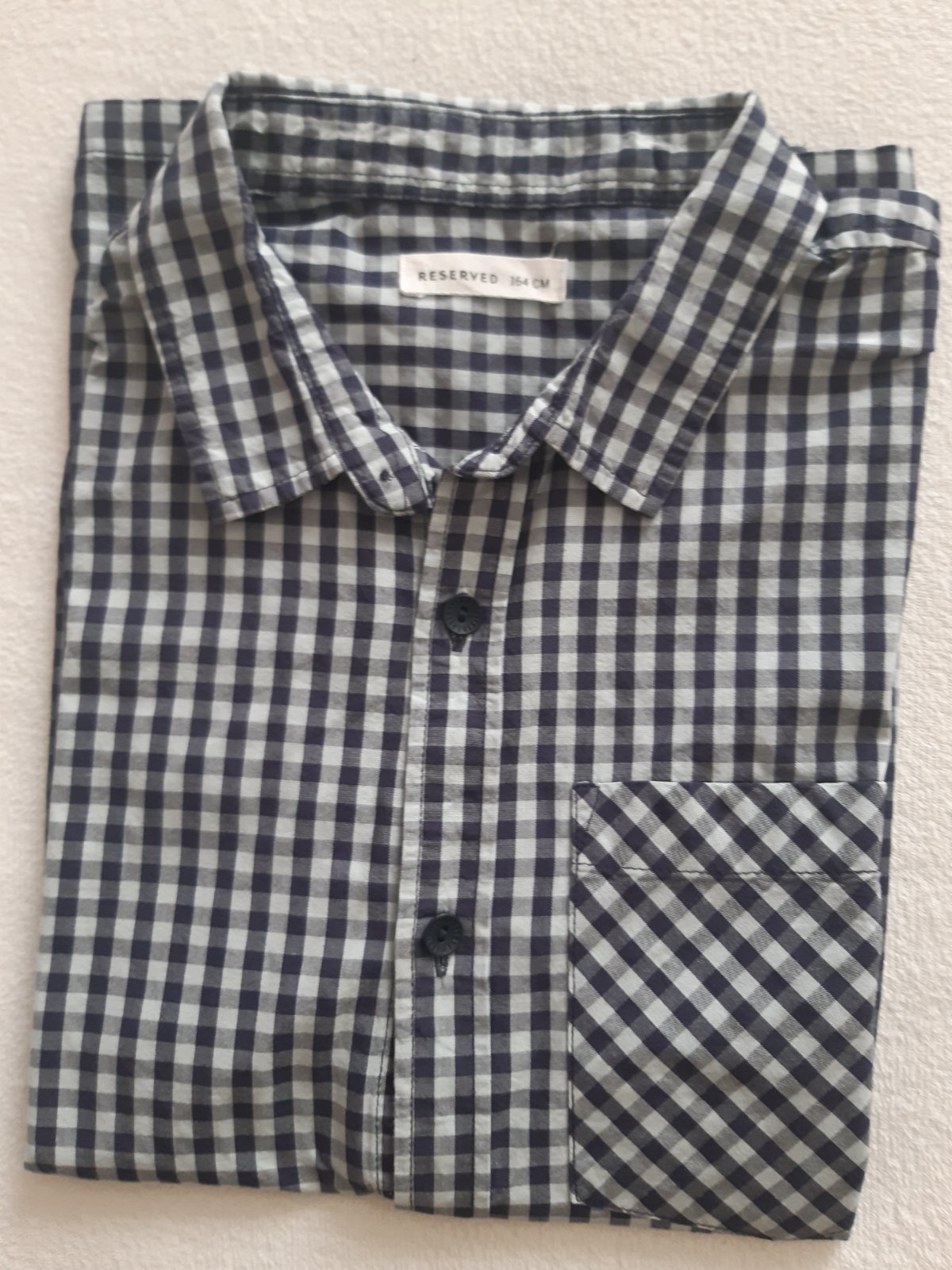 Kvalitná kockovaná (košeľa-bledomodrý základ,tmavomodré kocky)pre pevnejšieho chlapca. Pôvodná veľkosť 164, ale bola skracovaná preto písem 152. Šírka je cez prsia 45, dĺžka je 46 cm.