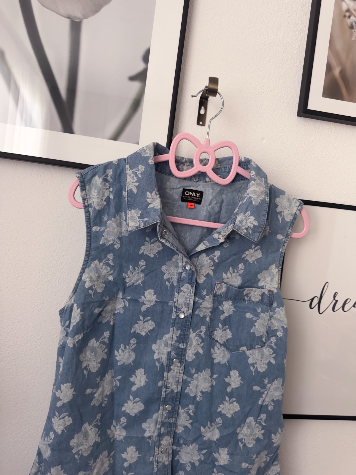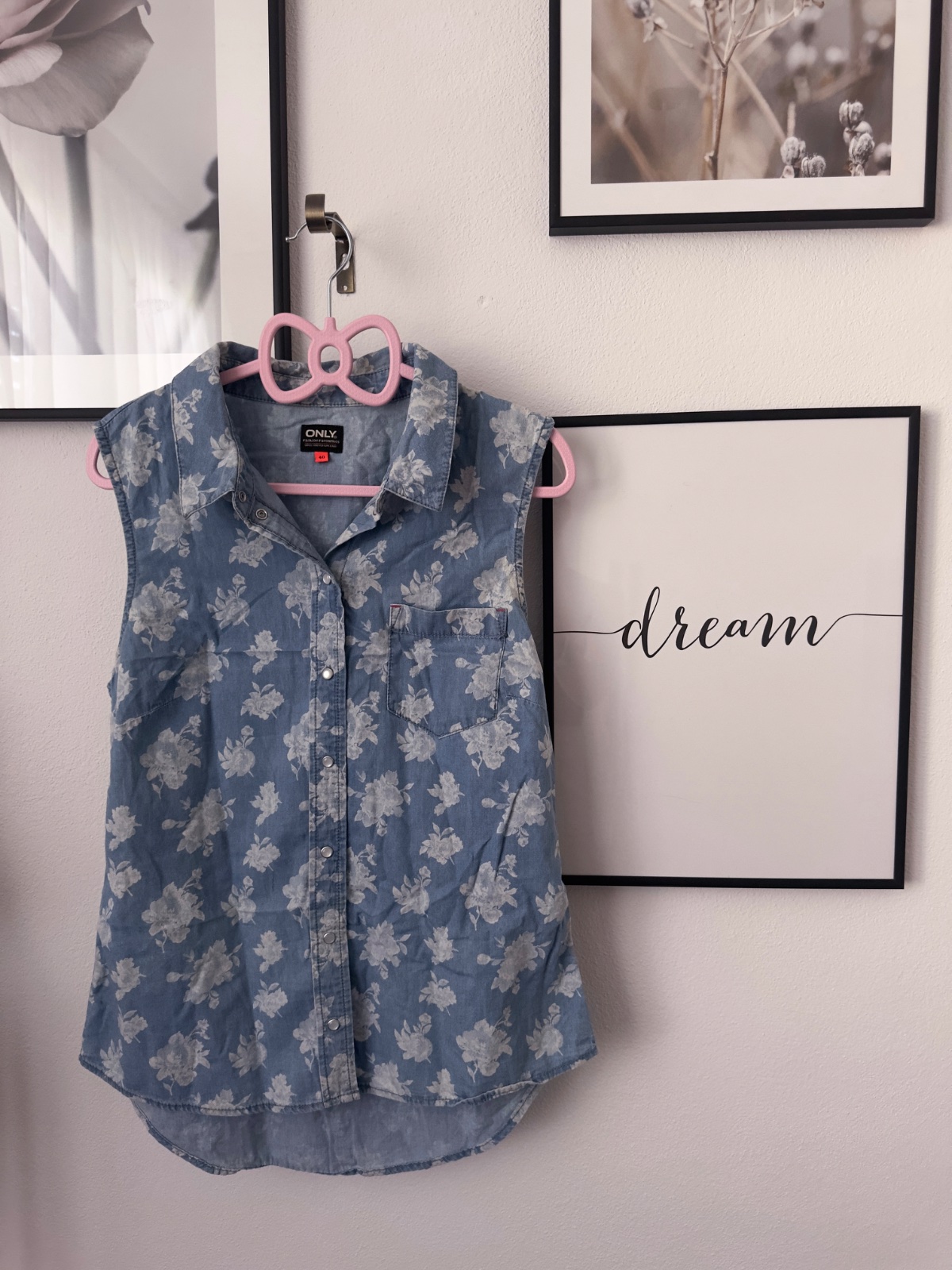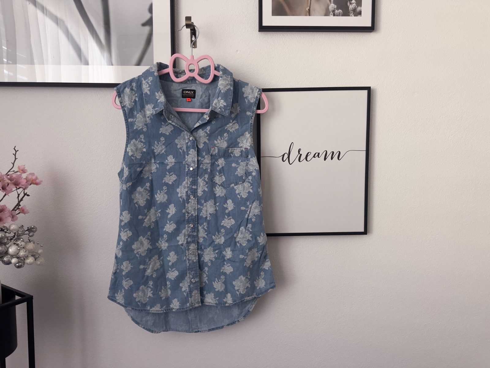 Romantická denim košeľa s motívom kvetov, top stav bez chyby.