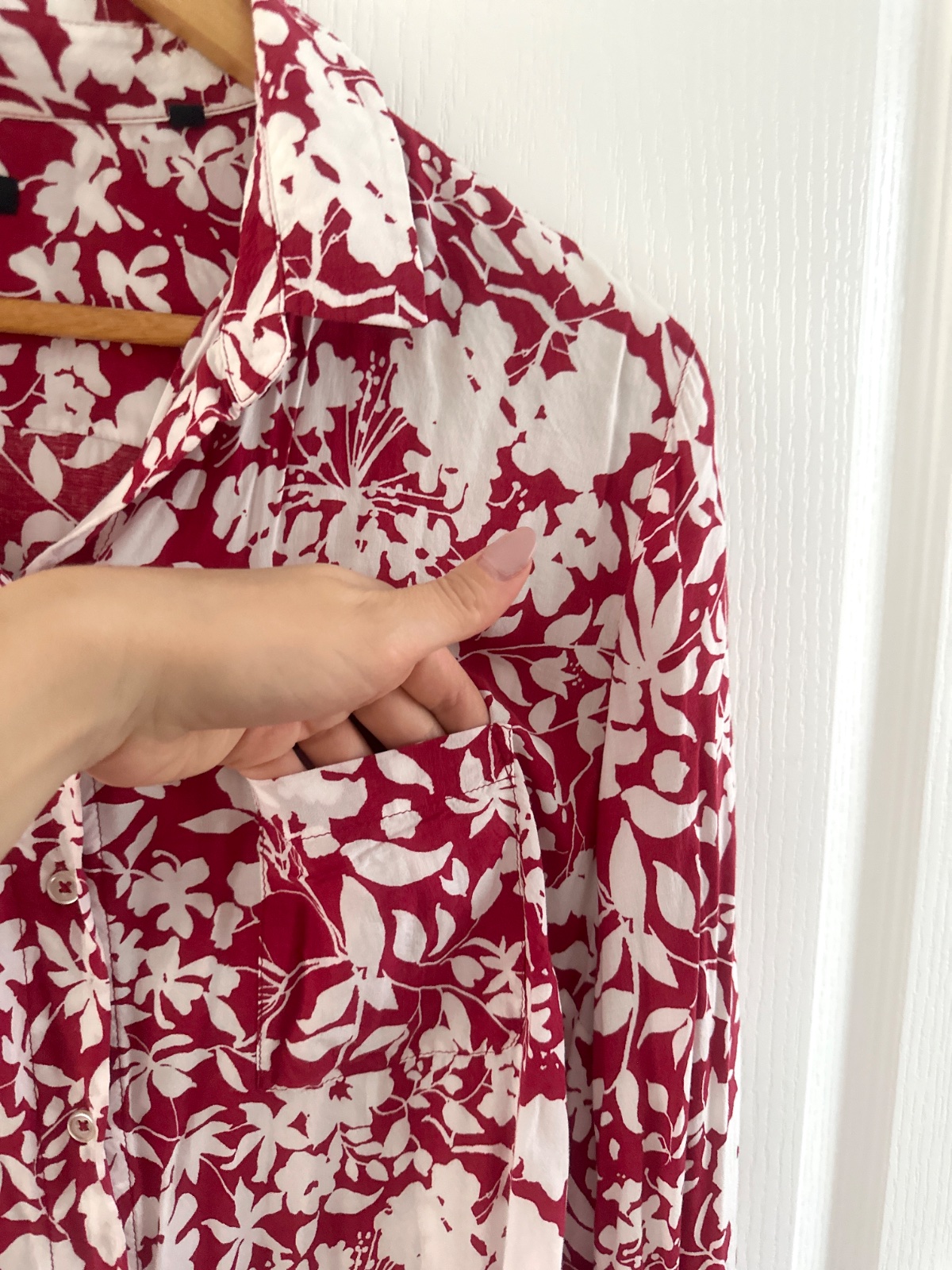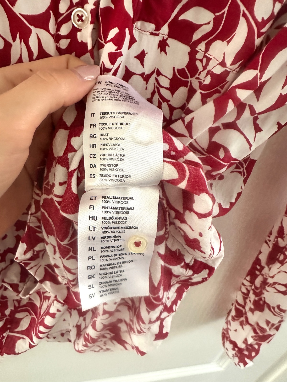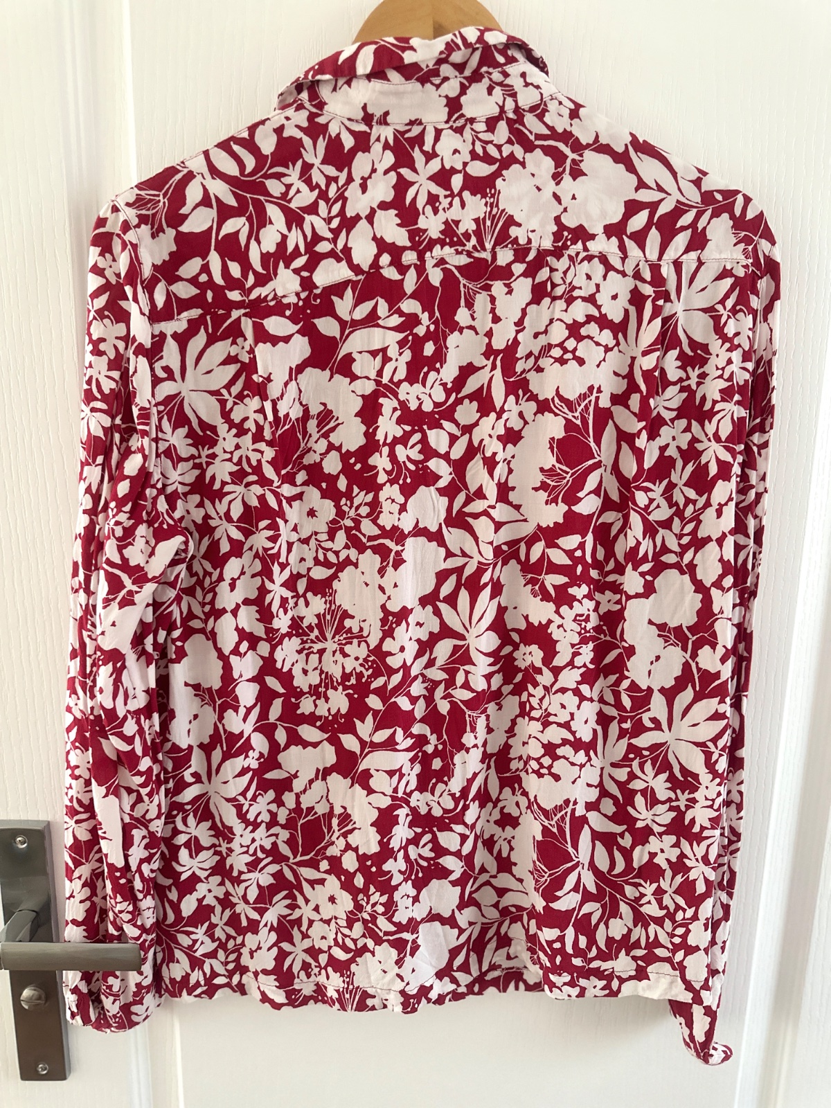 Táto prémiová košeľa Marc O'Polo je v krásnej bordovej farbe s bielym kvetinovým vzorom. Má predné vrecko a široké elastické manžety. Košeľa má rovný strih a je vyrobená zo 100 % viskózy. Veľkosť na etikete je 42. Je to krásny kúsok, ideálny na mnoho príležitostí.