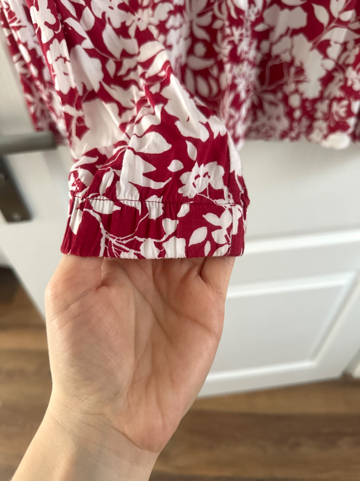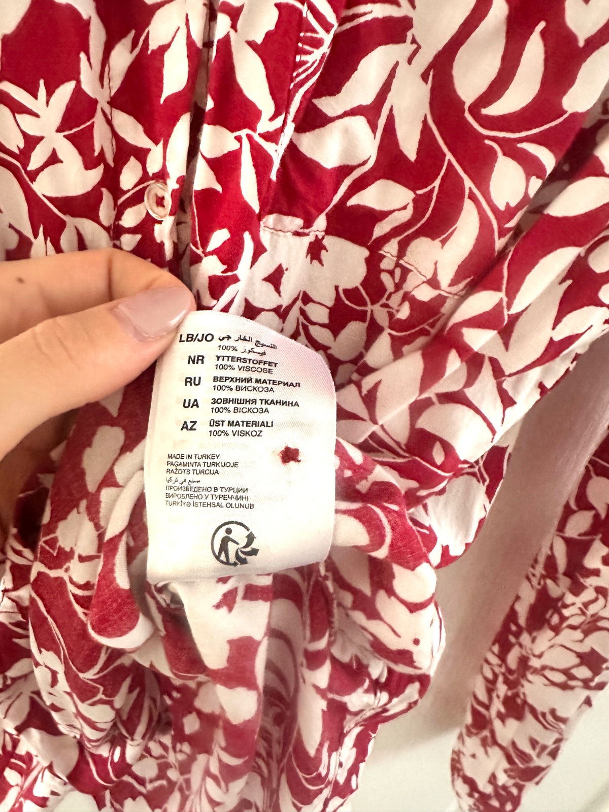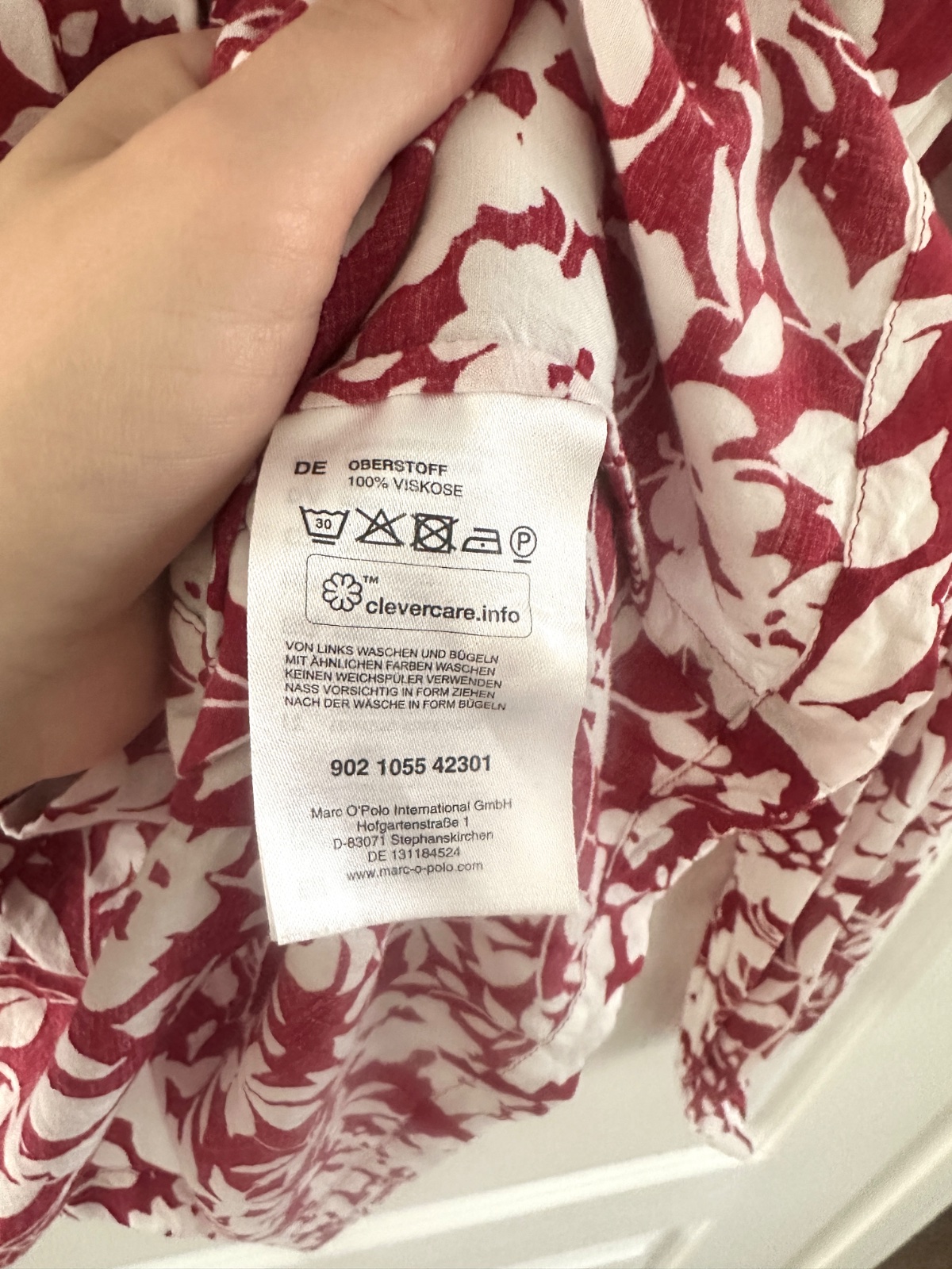 Táto prémiová košeľa Marc O'Polo je v krásnej bordovej farbe s bielym kvetinovým vzorom. Má predné vrecko a široké elastické manžety. Košeľa má rovný strih a je vyrobená zo 100 % viskózy. Veľkosť na etikete je 42. Je to krásny kúsok, ideálny na mnoho príležitostí.