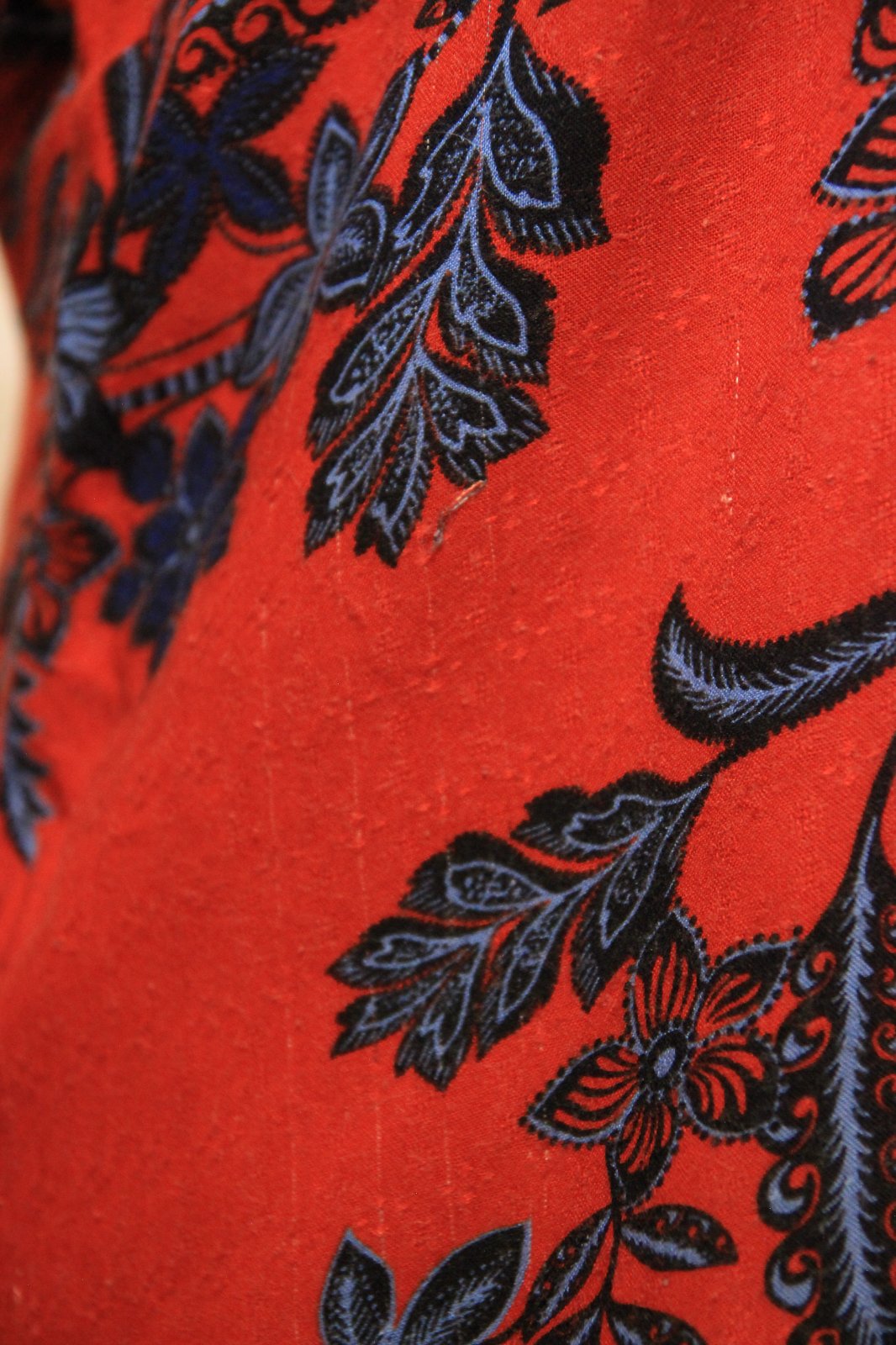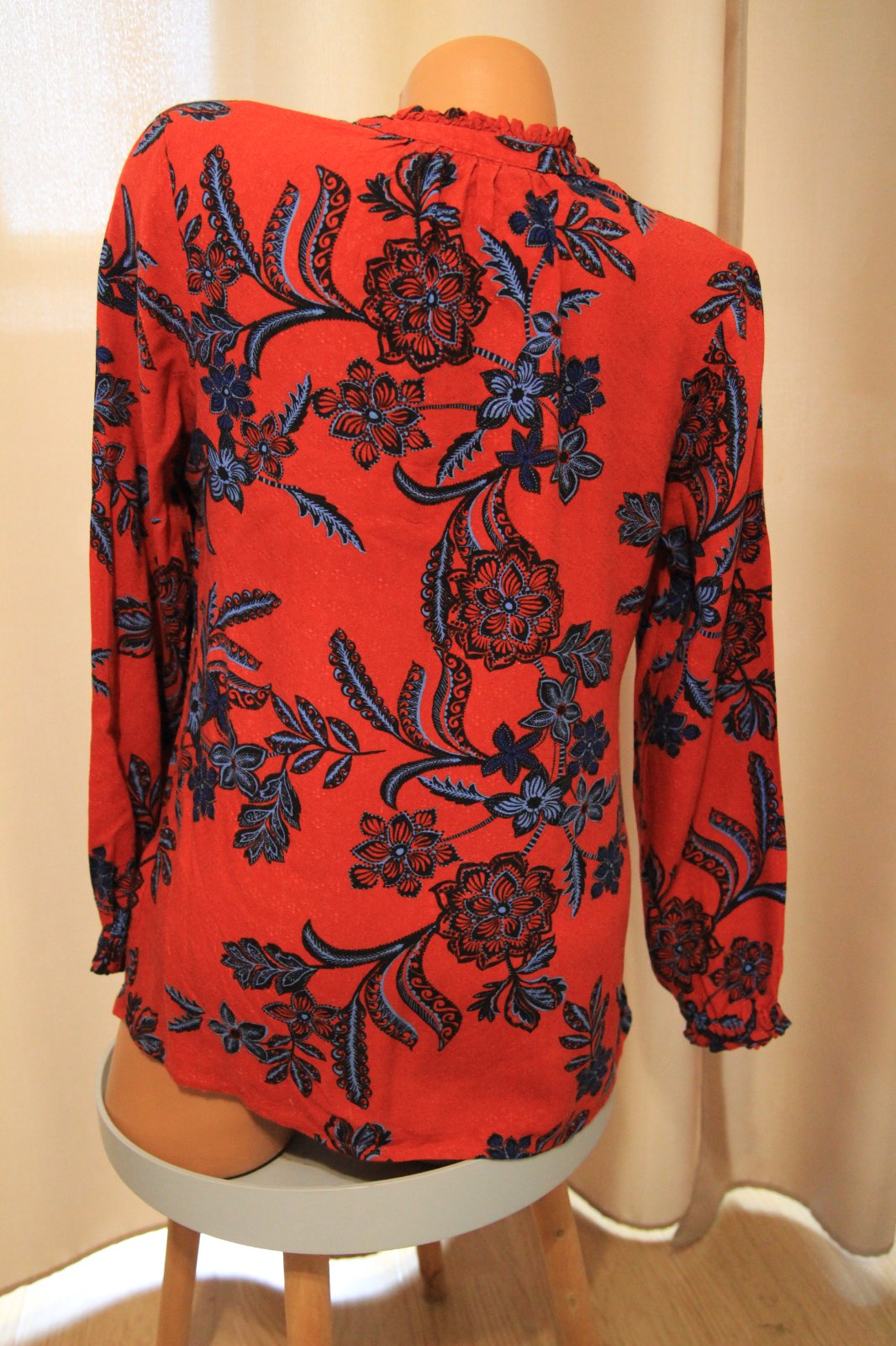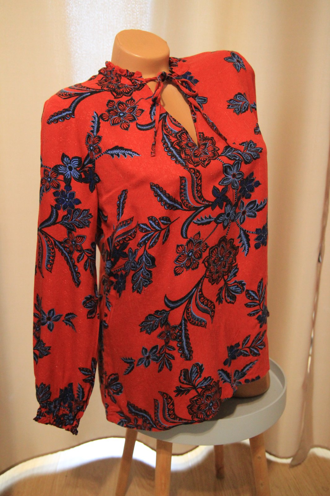 Červeno modrá kvietkovaná blúzka, veľkosť M, vpredu má pár zatiahnutí - pozri foto. Materiál je 100% viskóza.