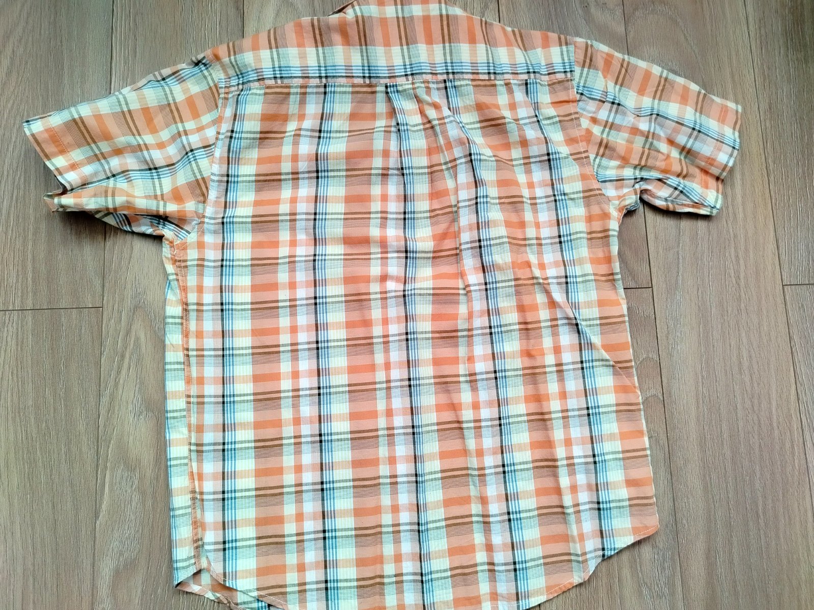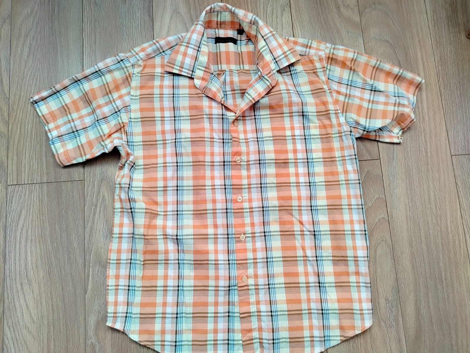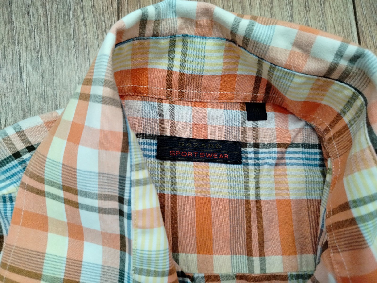 Predám minimálne používanú pánsku košeľu značky Hazard Sportswear, veľkosť M. Je vyrobená z 100% bavlny, v pastelových farbách (oranžová, biela, modrá, žltá s čiernymi linkami) v kockovanom vzore. Krátky rukáv, camp golier, zapínanie na gombíky, vpredu vrecko. Rozmery: šírka ramien 46 cm, šírka pod pazuchami 56 cm, dĺžka 70 cm. Stav ako nová, bez poškodení. Ideálna na leto alebo bežné nosenie.