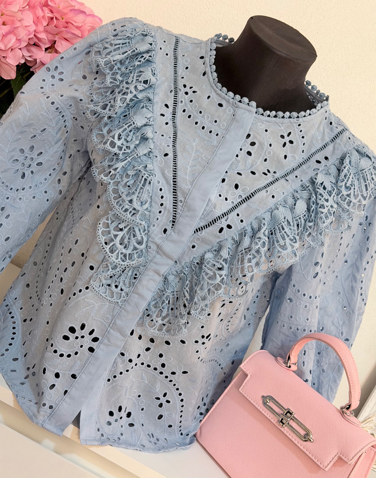 Luxusná madeirová blúzka značky ZARA v nádhernom jemne modrom odtieni s bohato zdobenou čipkou a romantickými volánmi.
