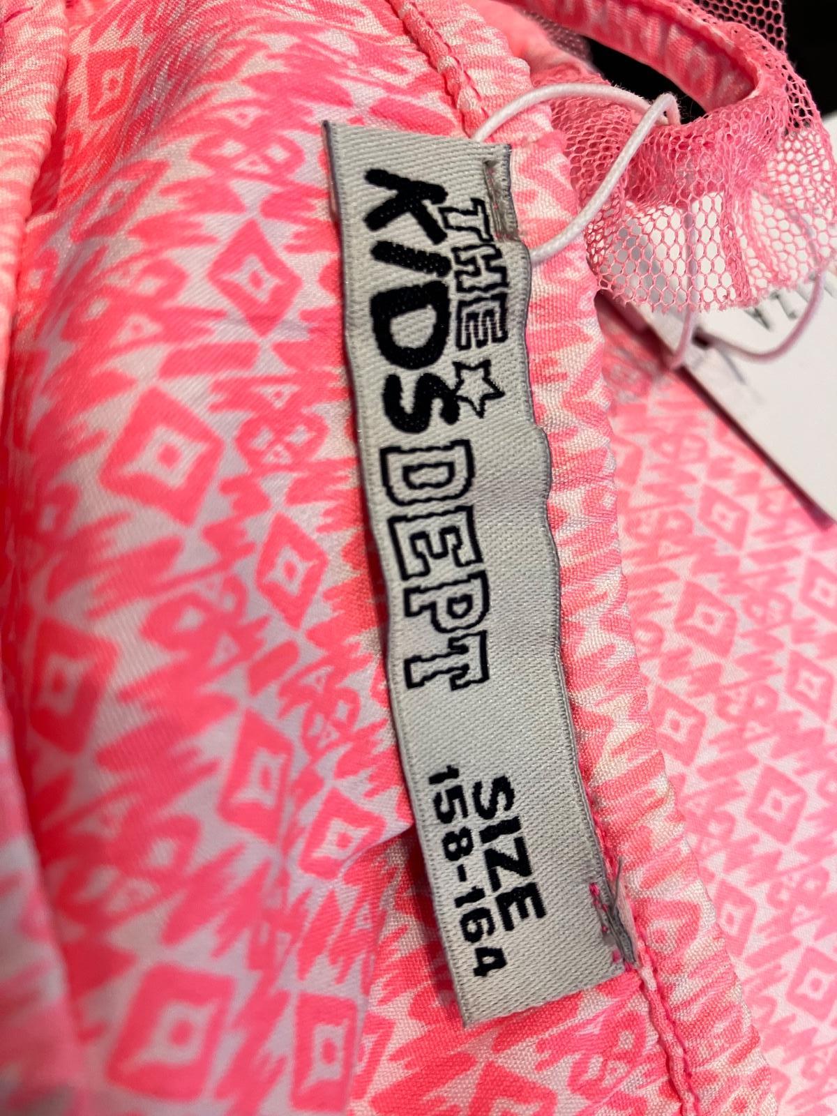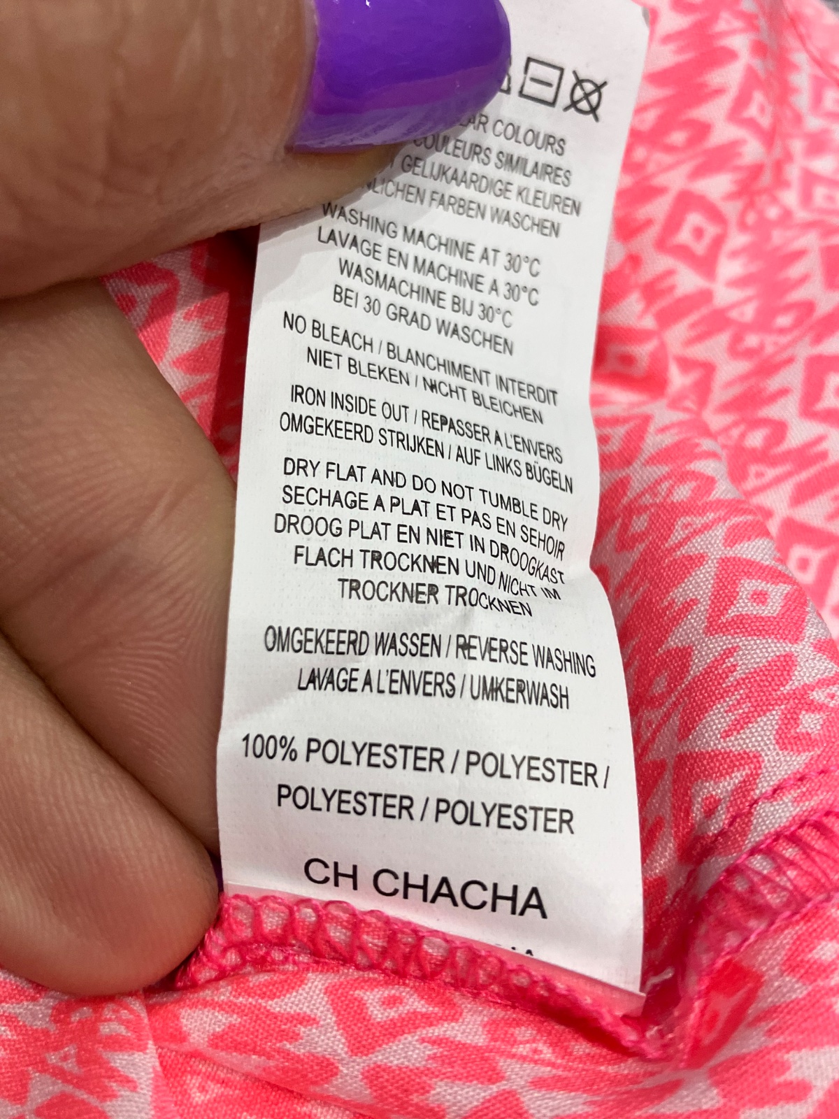 Dievčenská ľahká blúzka s tylovým rukávom, voľný strih, ležérna, špagetové ramienka s tylom, výstrih na gumičku, tenká, vzorovaná, jemne elastická, dvojité číslovanie, farba neónovo ružová, biela, materiál 100%polyester.