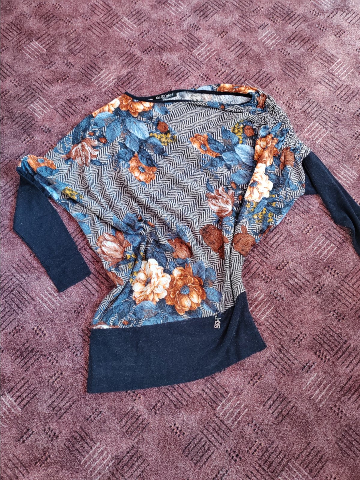 Krásna dámska blúzka asymetrického strihu. S nazberkaným rukávom a padnutým plecom. Hrejivý materiál. Kupovaná v butiku.