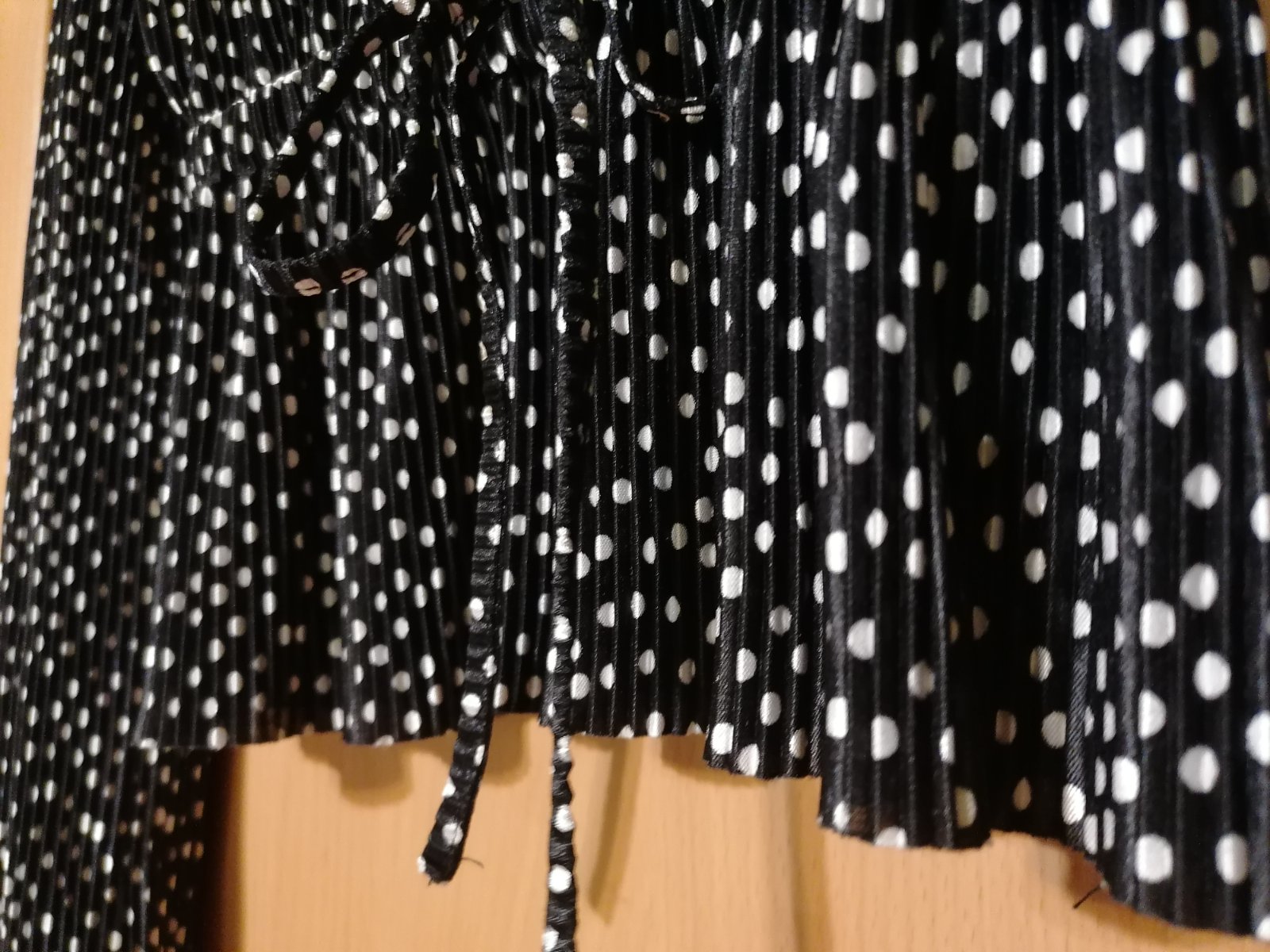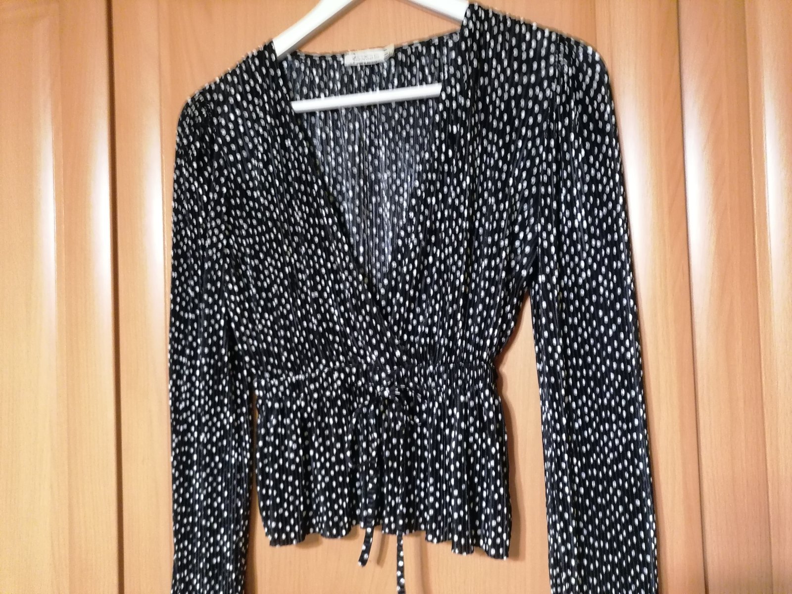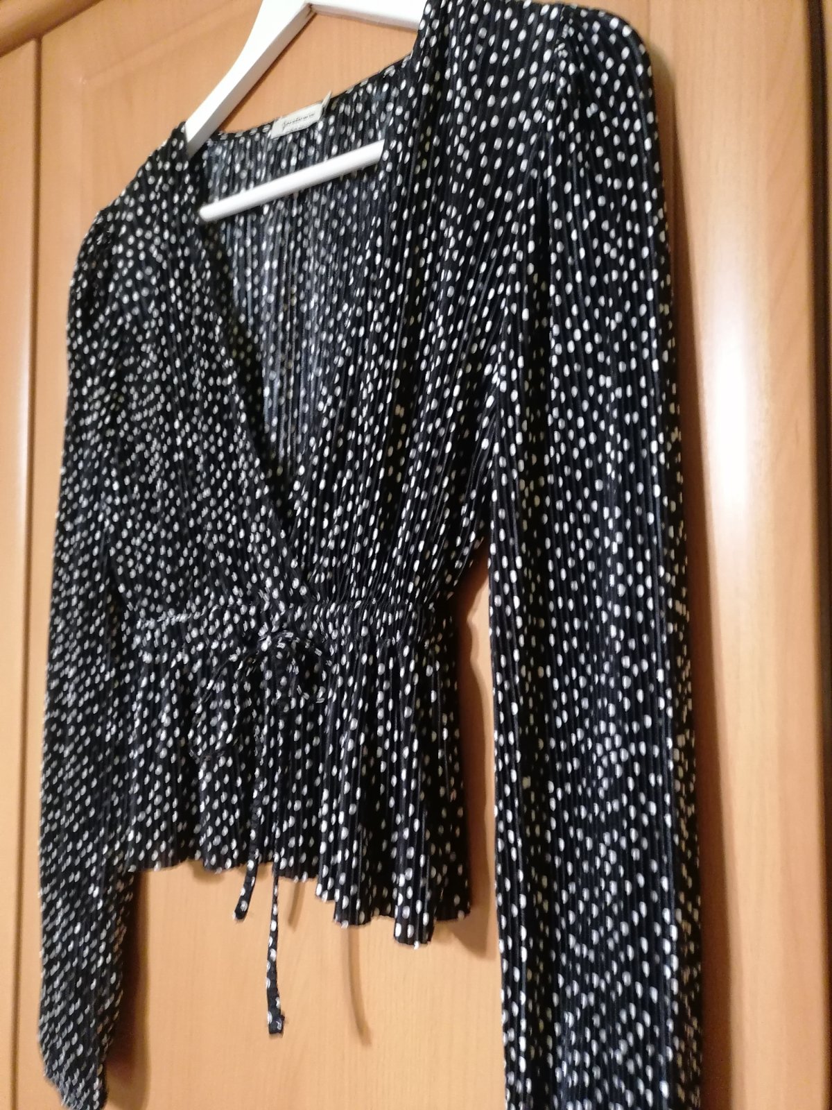 Lahučká blúza veľ. 36,cje krásna, celá akoby plisovaná. Absolútne nekrčivá. Celková dĺžka od ramena dole je 48cm, v páse guma, prispôsobí sa. Rukáv ukončený gumičkou.