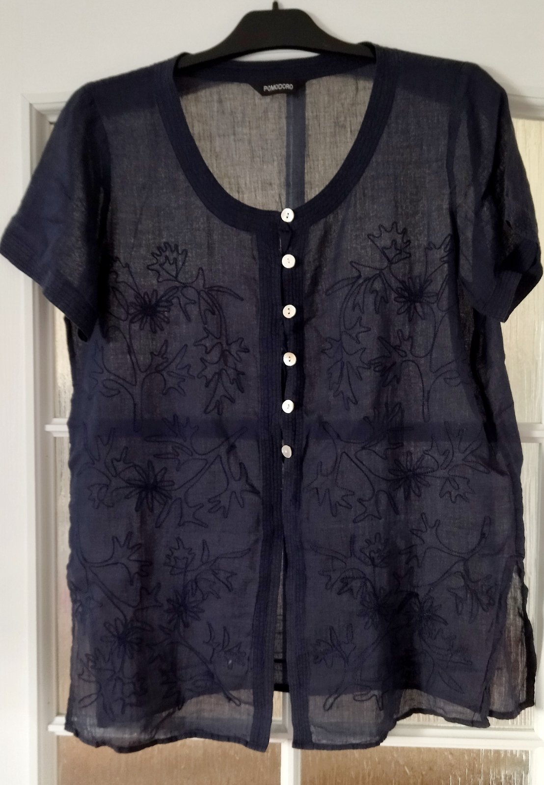 Krásny značkový top Taifun so zaujímavo riešeným golierikom. Vzadu zapínanie na zips. Veľkosť L. Rozmery - Dĺžka od pleca - 66 cm. Šírka pod pazuchami - 59cm x 2.