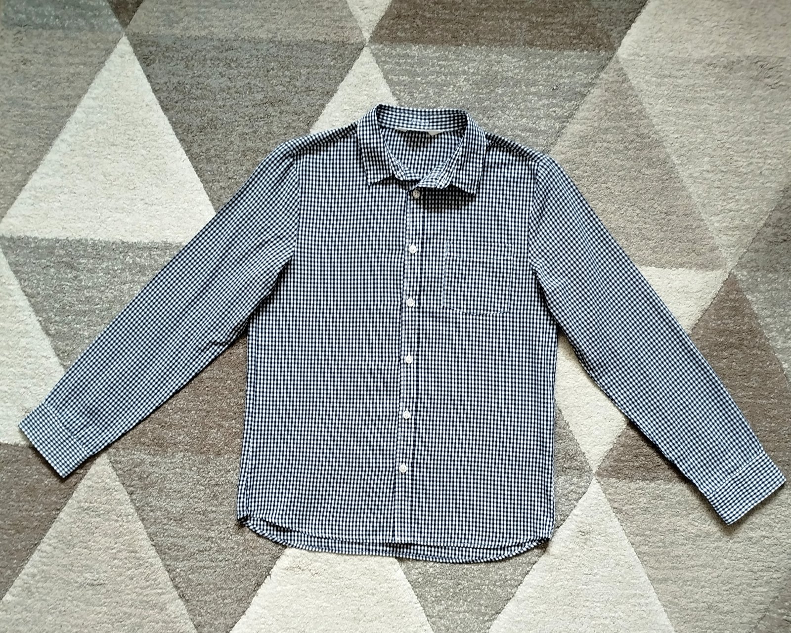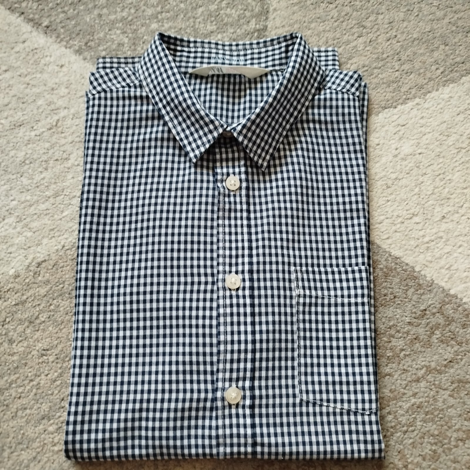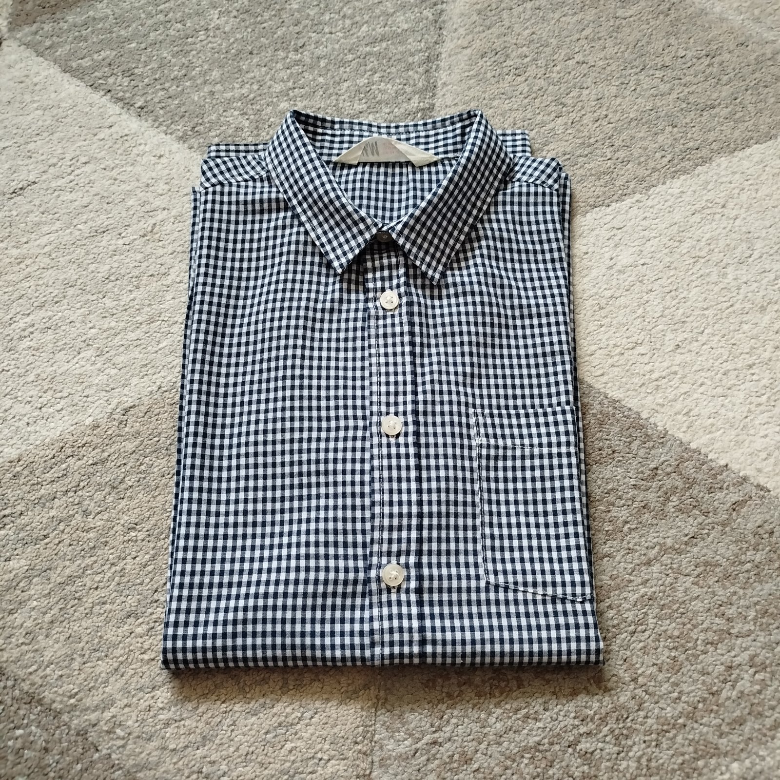 Perfektná nekrčivá košeľa H&M v top stave, raz použitá. Veľkosť 164, dĺžka 64cm, prsia 46cm, rukáv od krku 73cm, rukáv od pleca 60cm. Farba tmavomodrá s bielou. Cena + pošta.