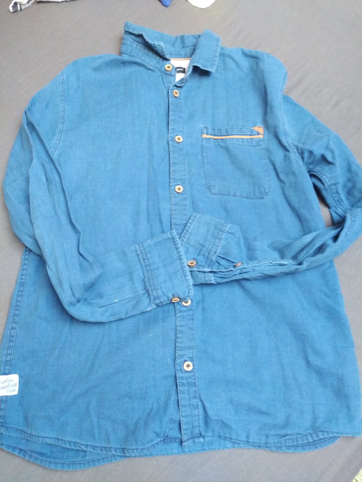 Košeľa je vo výbornom nosenom stave. Zapínanie na pukačky. V predu dve vrecká, zapínanie taktiež na pukačku. Dá sa nosiť aj z ohrnutými rukávami- na oboch rukávoch sa dá krásne pripnúť. Zo zadu v s...