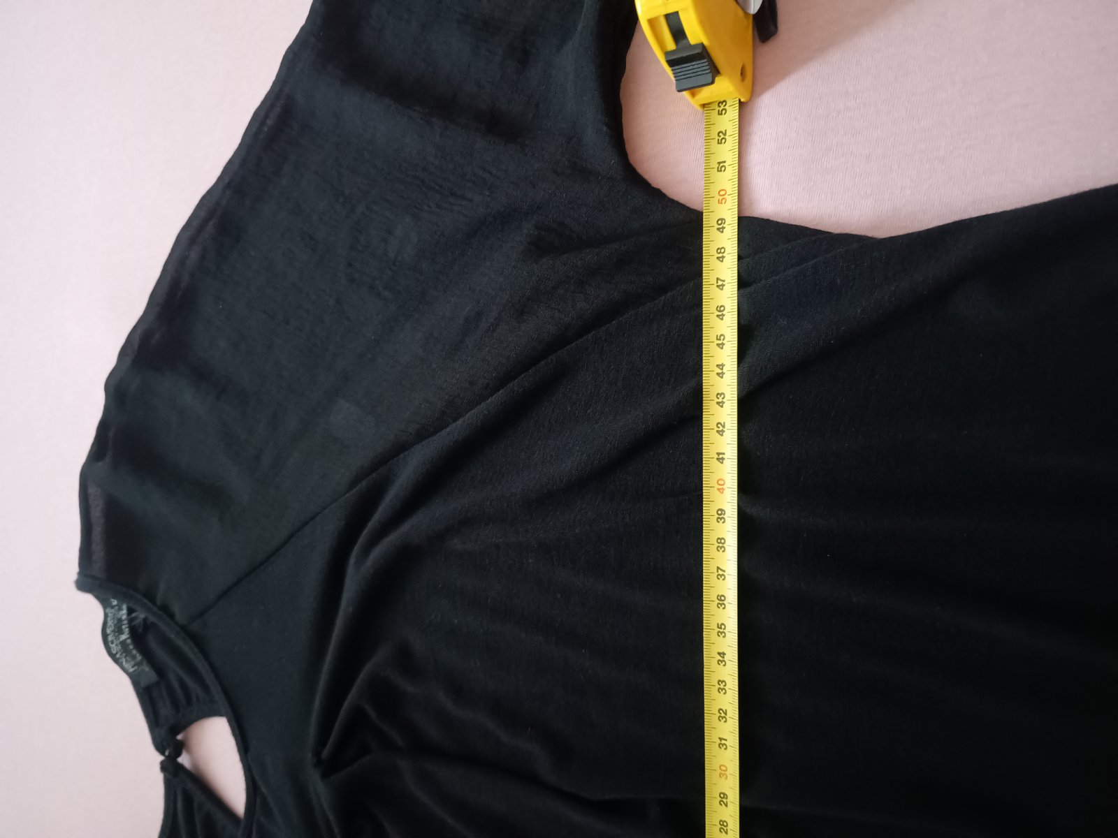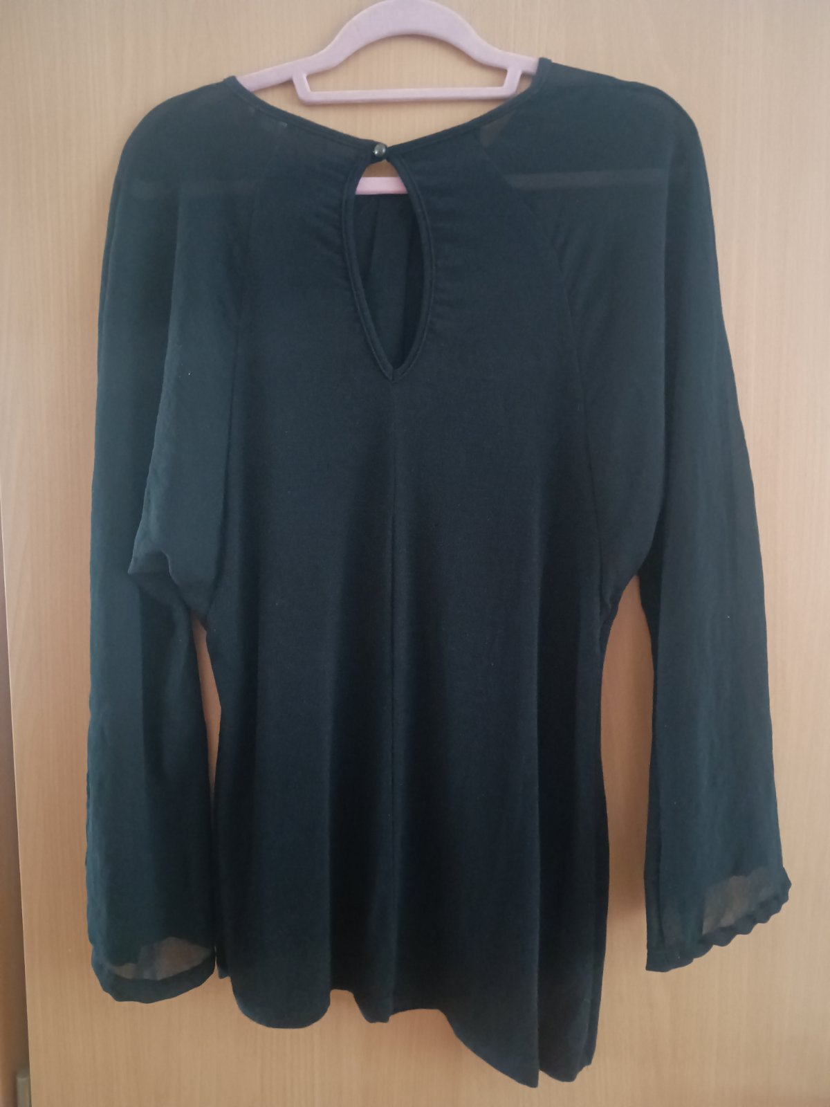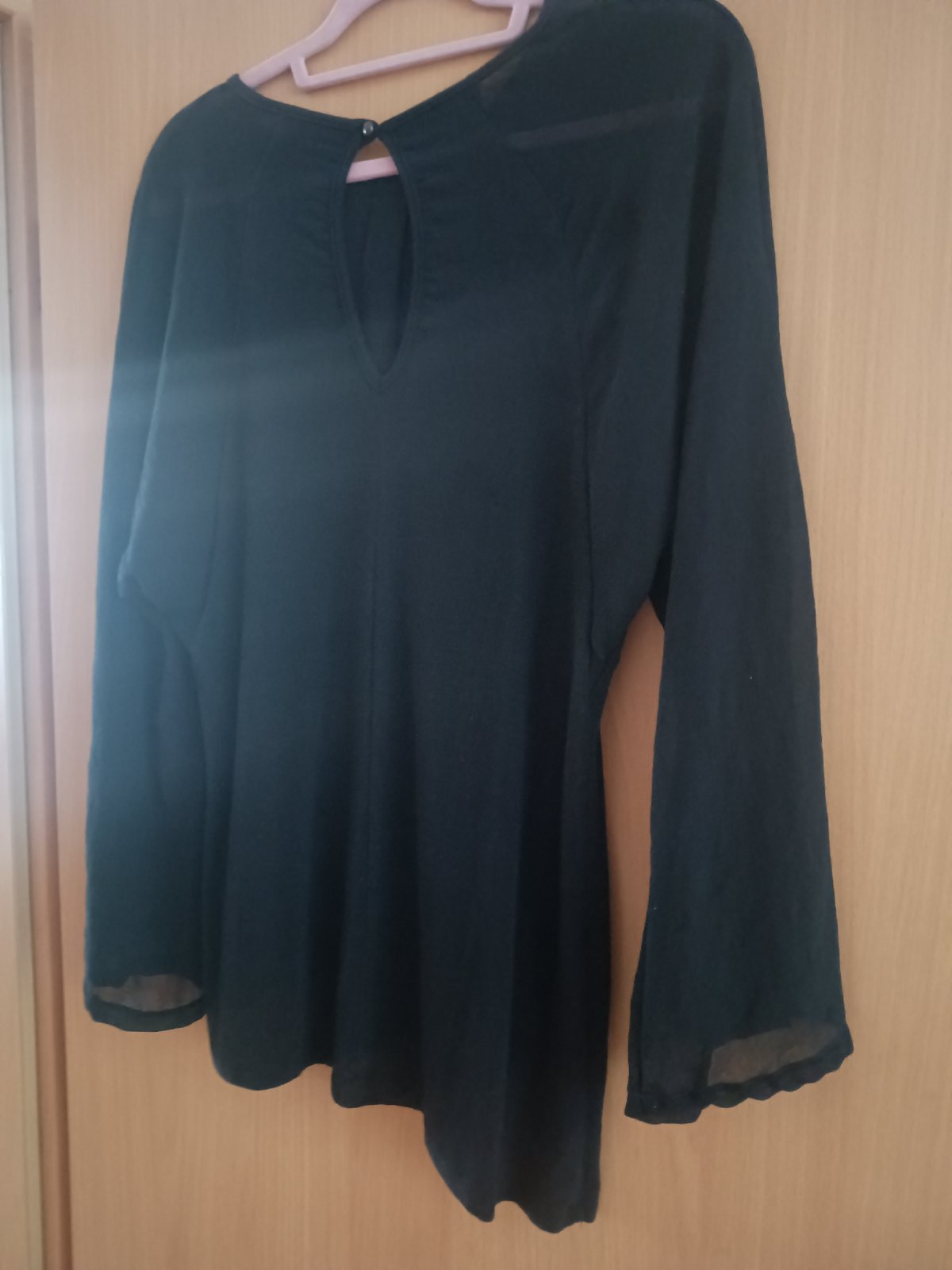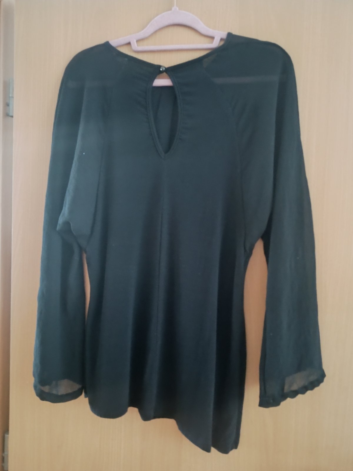 Asymetrická blúzka, priehľadné jemne zvonové rukávy, vzadu pri krku zapínanie na gombík, jemná padavá látka veľ.písaná 48 ake skôr 46, miery sú na fotkách, nenosená, rukávy polyester, telo viskoza + elastan
