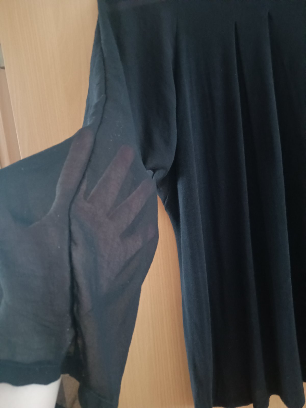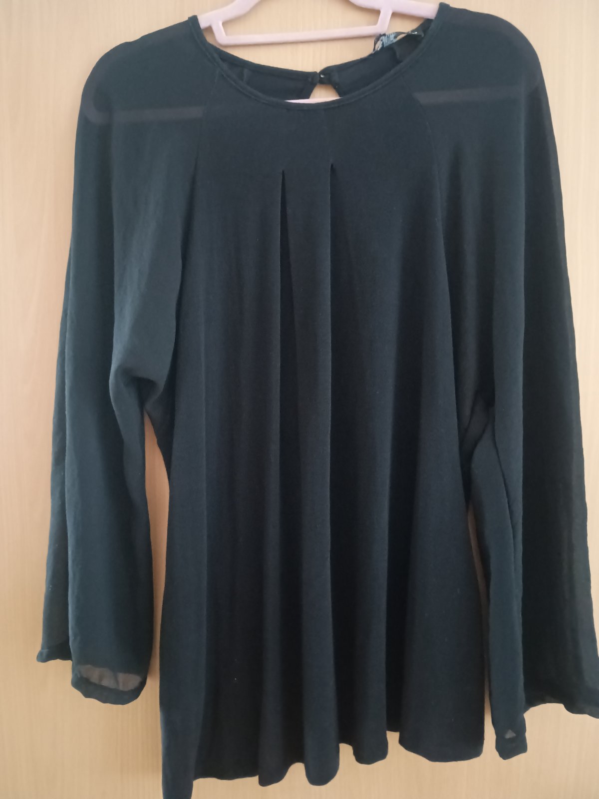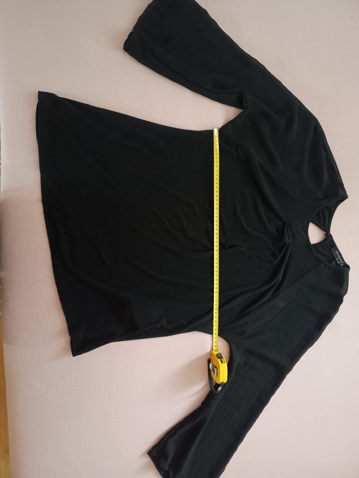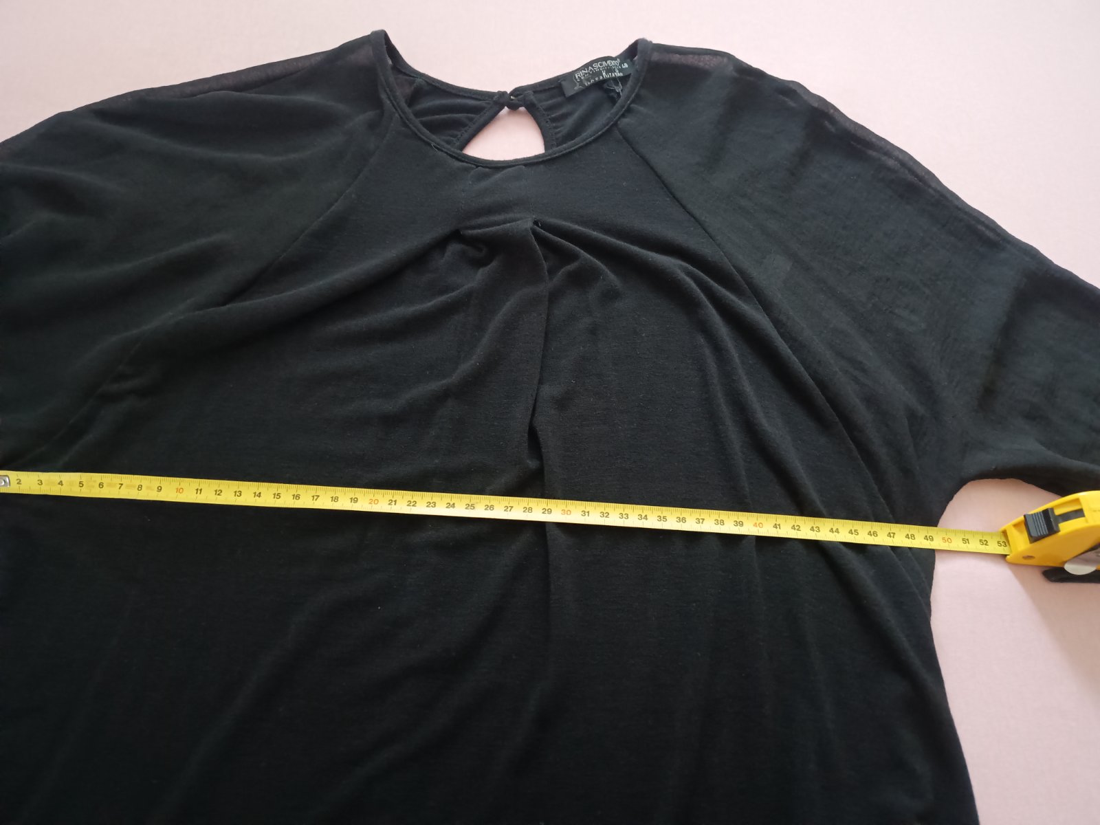 Asymetrická blúzka, priehľadné jemne zvonové rukávy, vzadu pri krku zapínanie na gombík, jemná padavá látka veľ.písaná 48 ake skôr 46, miery sú na fotkách, nenosená, rukávy polyester, telo viskoza + elastan
