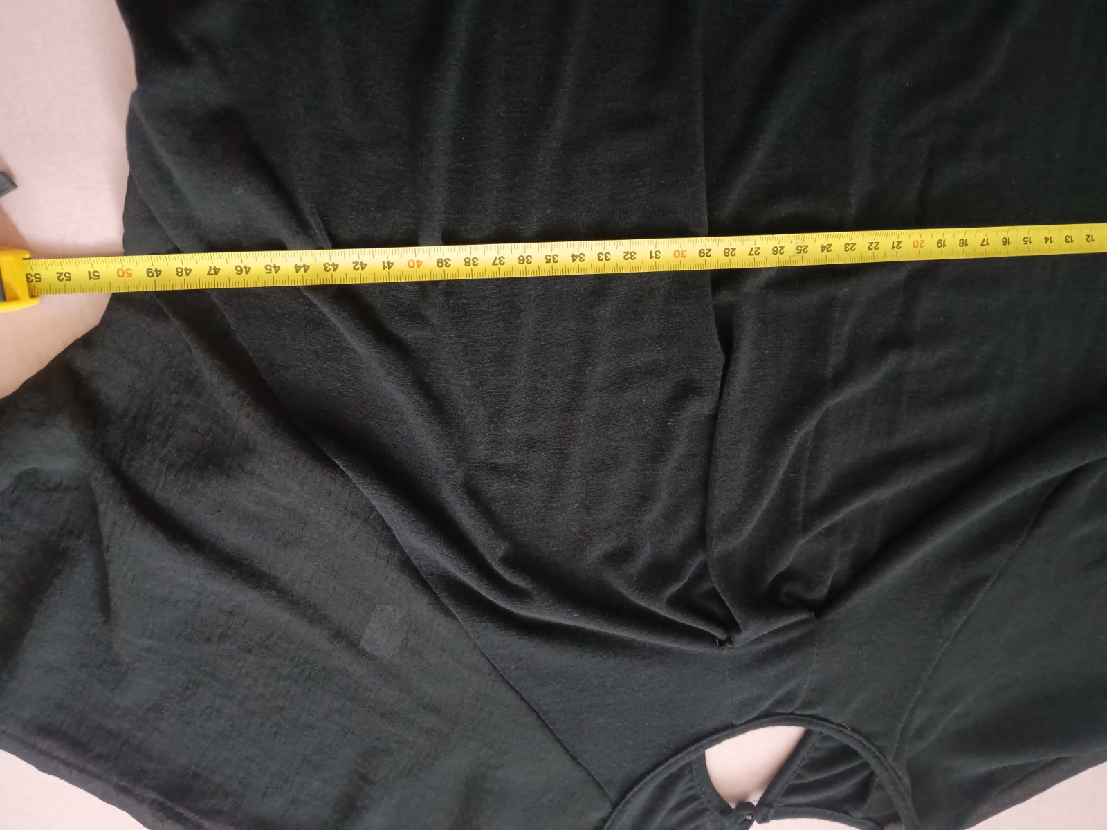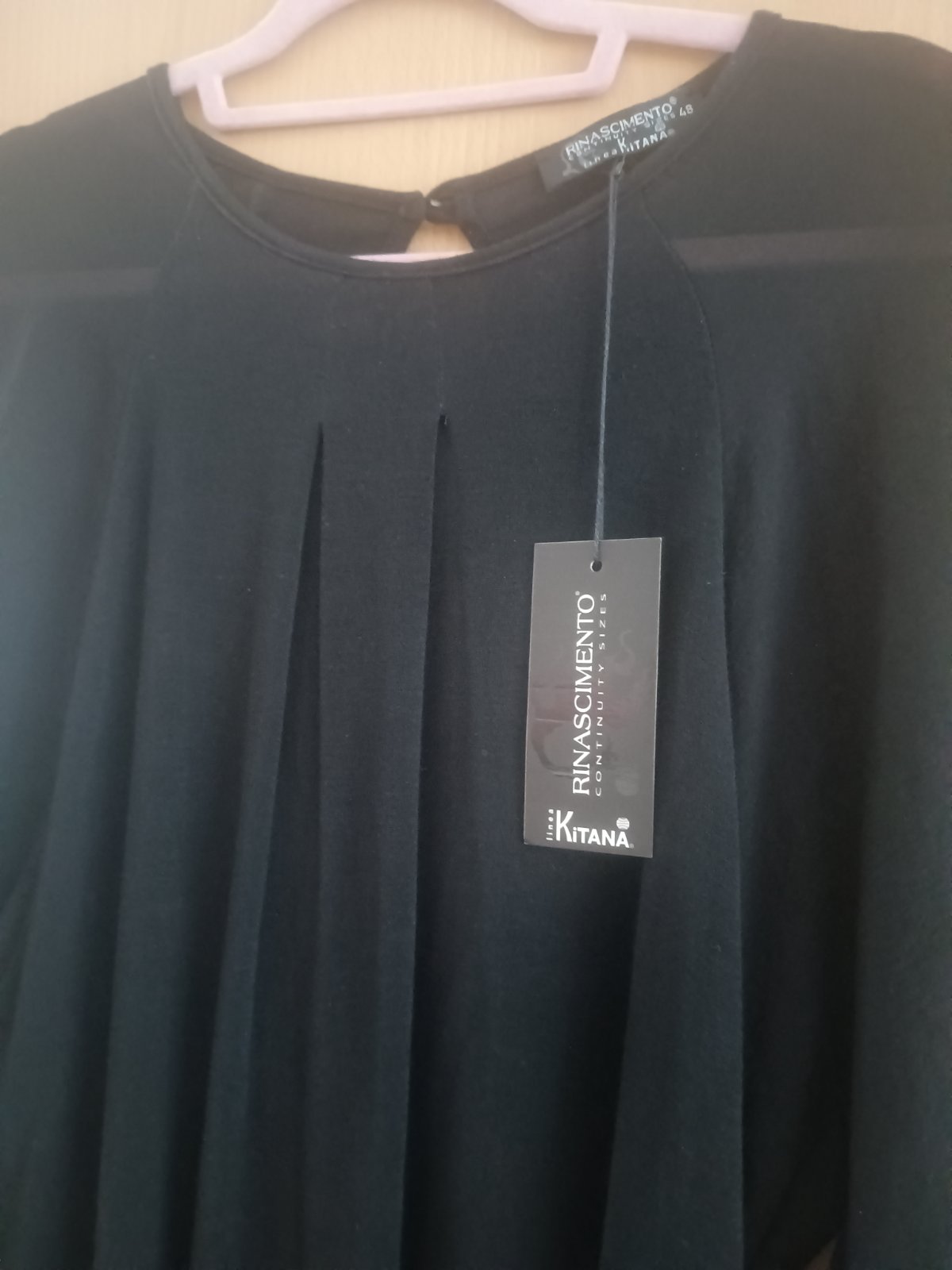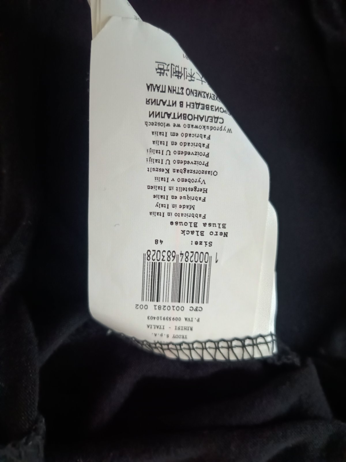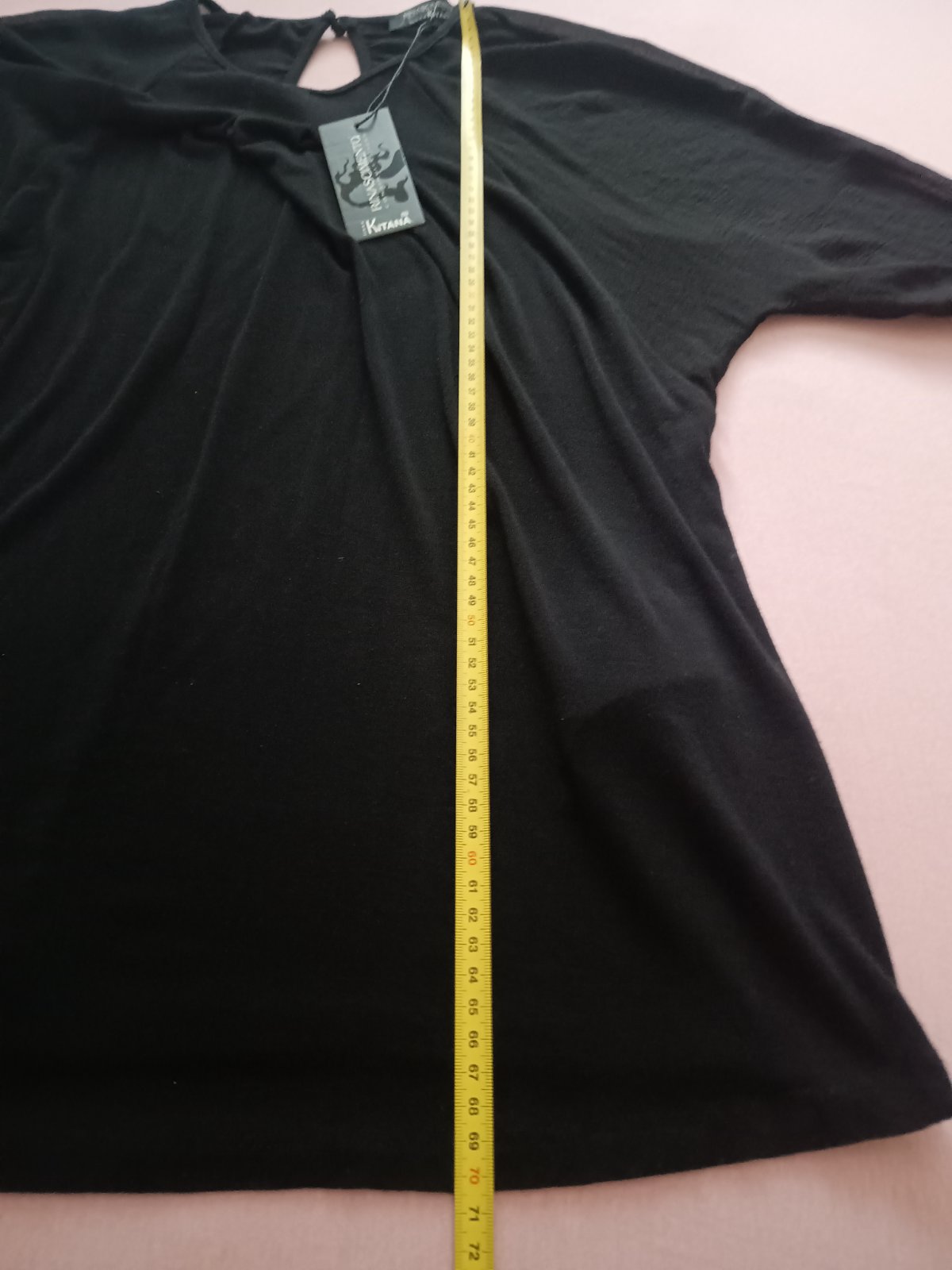 Asymetrická blúzka, priehľadné jemne zvonové rukávy, vzadu pri krku zapínanie na gombík, jemná padavá látka veľ.písaná 48 ake skôr 46, miery sú na fotkách, nenosená, rukávy polyester, telo viskoza + elastan
