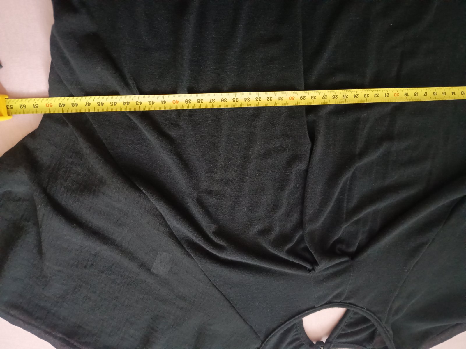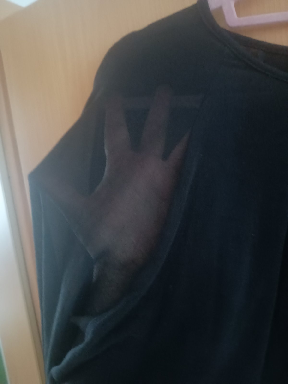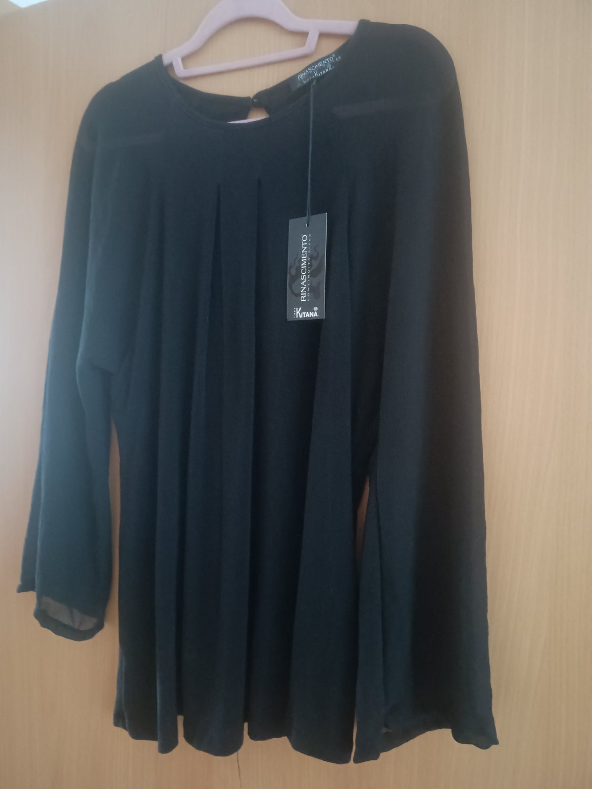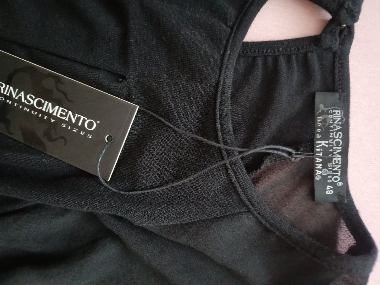 Asymetrická blúzka, priehľadné jemne zvonové rukávy, vzadu pri krku zapínanie na gombík, jemná padavá látka veľ.písaná 48 ake skôr 46, miery sú na fotkách, nenosená, rukávy polyester, telo viskoza + elastan