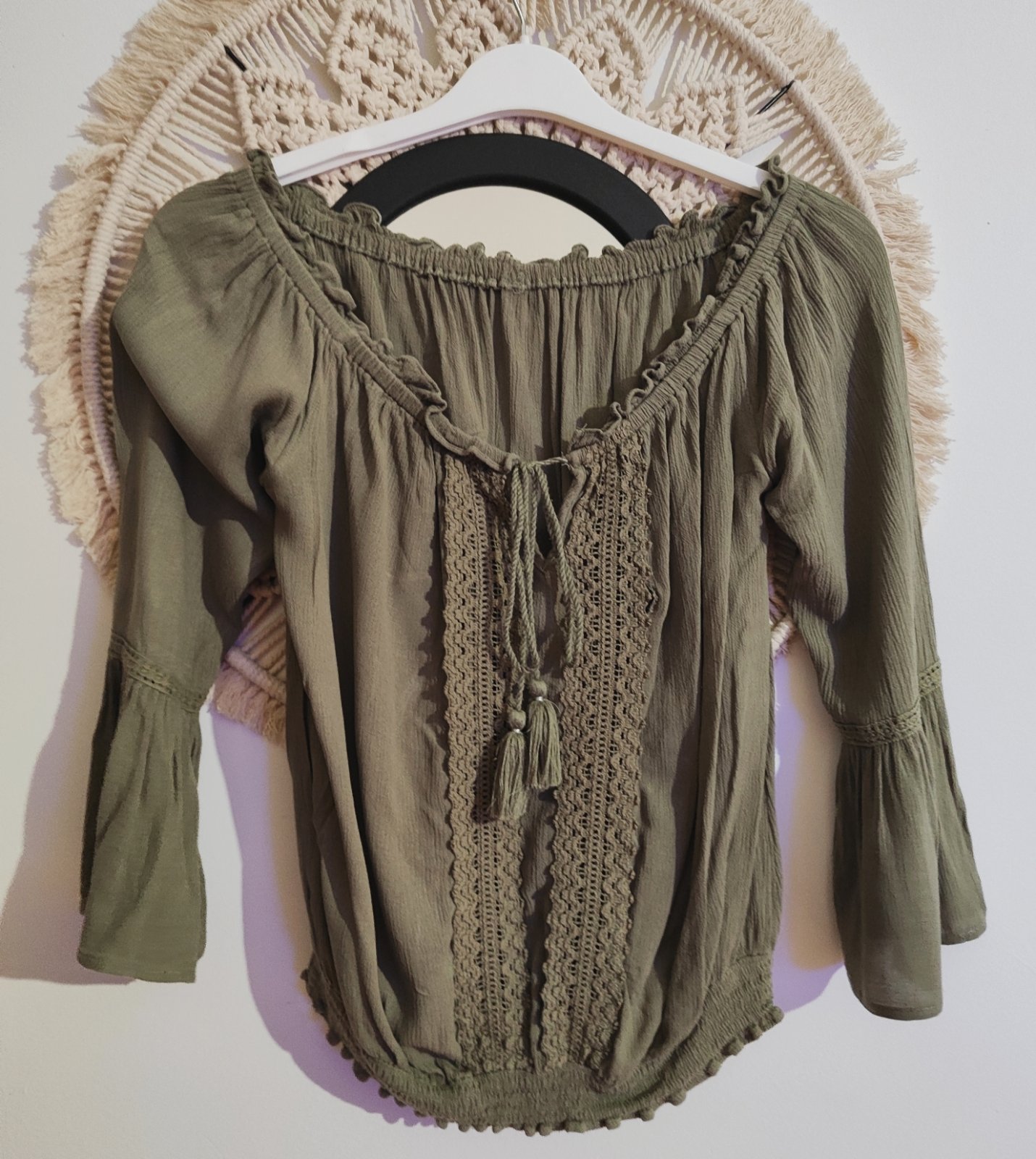 Khaki zelená (olivová) ľahká blúzka, top z balvlny, ideálna na leto. Padnuté ramená, dekolt na prispôsobenie šnúrkou. 3/4 volánové rukávy. Veľkosť 38-40 Mám ju aj v bielom, ale vo väčšej veľkosti....