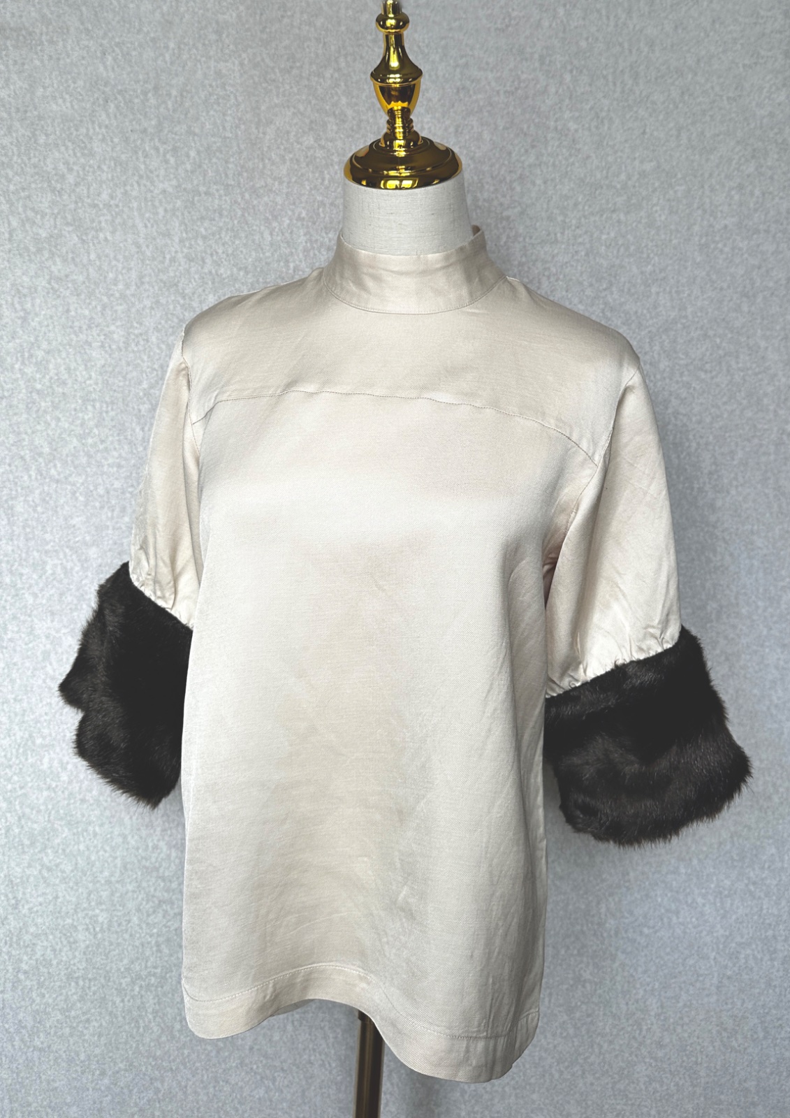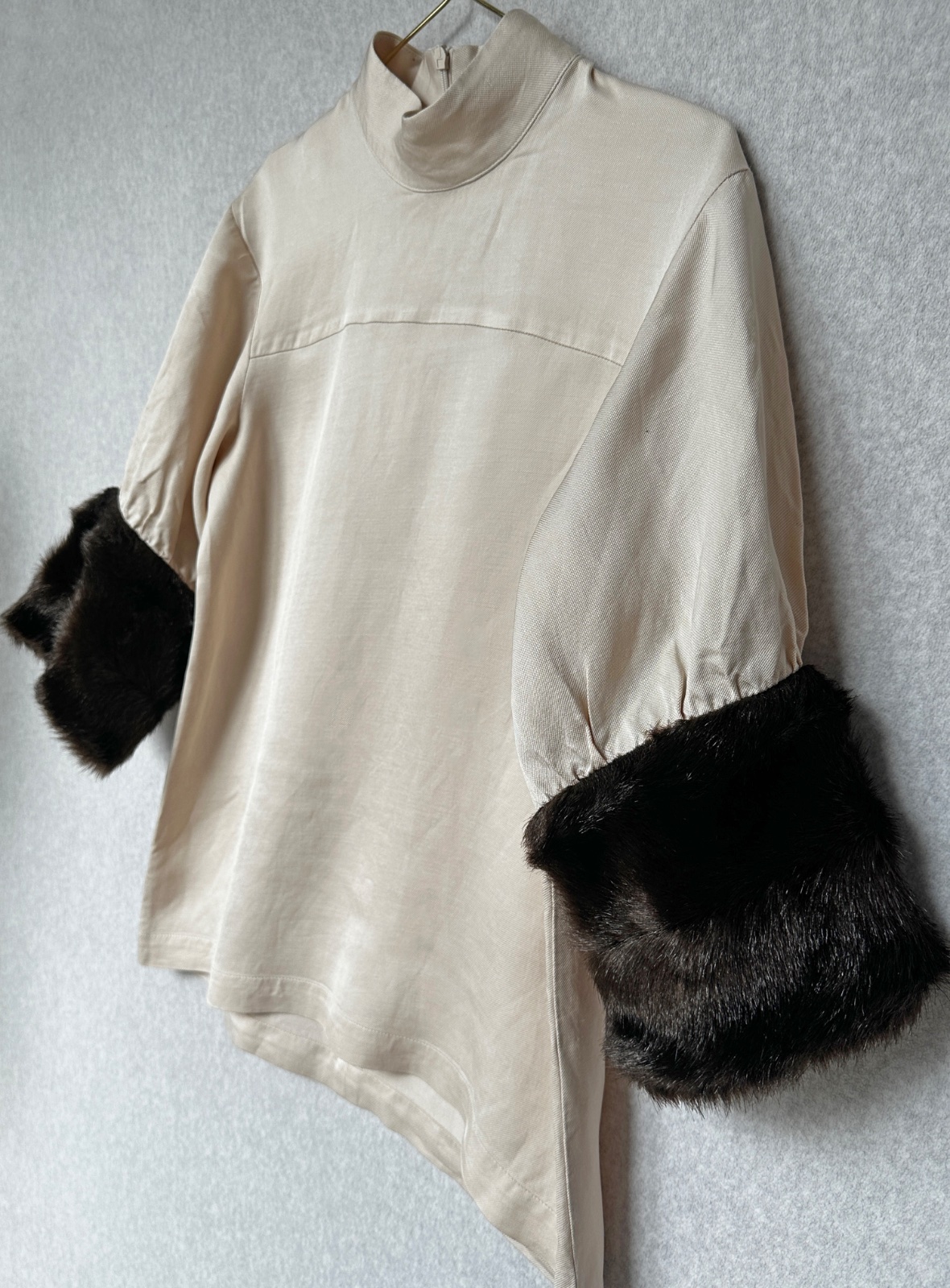 Štýlový top v smotanovej bielej farbe s hnedými kožušinovými manžetami. Materiál je pevný padavý, s perleťovým leskom. Oblečený pôsobí veľmi exkluzívne. Zapínanie je vzadu na zips pod krkom. V super stave, bez poškodení.