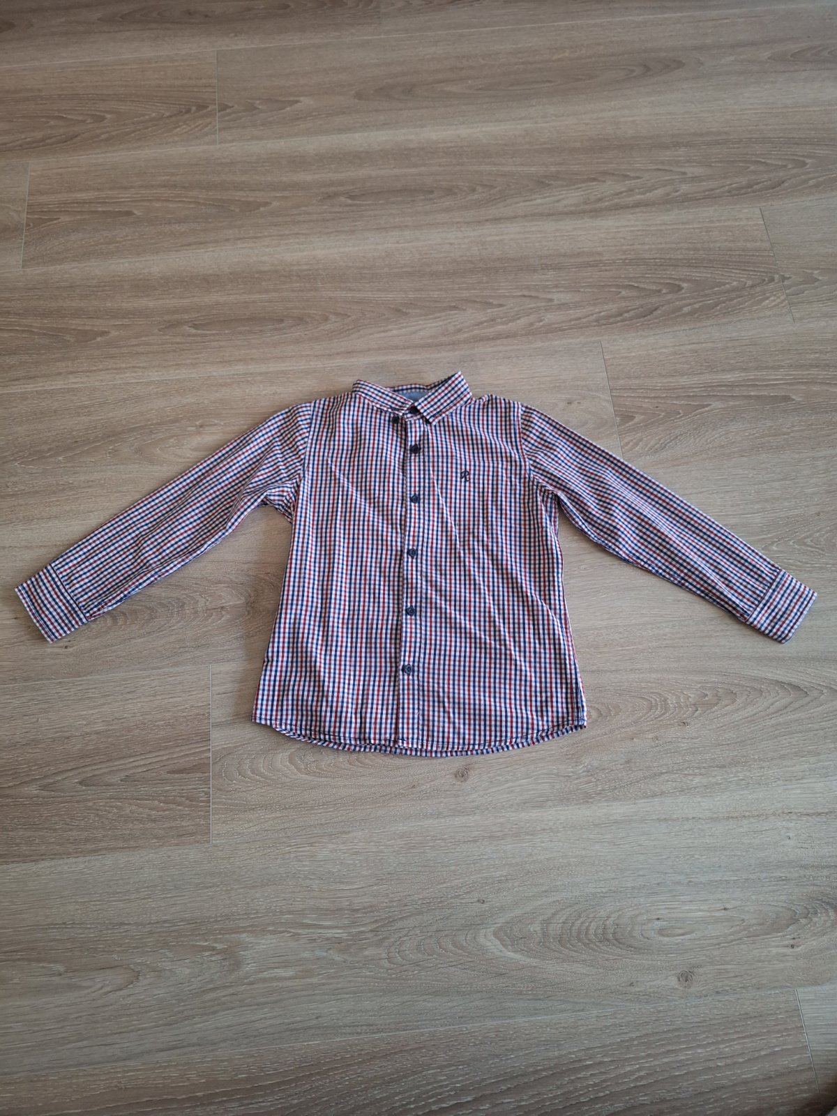 Bledomodrá košeľa s bodkami, len po mojom synovi, rukáv sa dá vypnúť na 3/4. Maly fliačik na rukáve, ktorý sa dá určite vyprat( ja už ho prať nebudem) zohľadnené v cene.