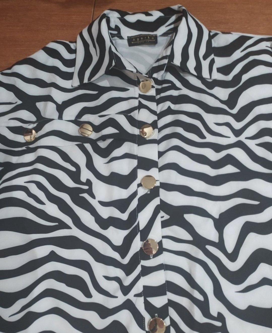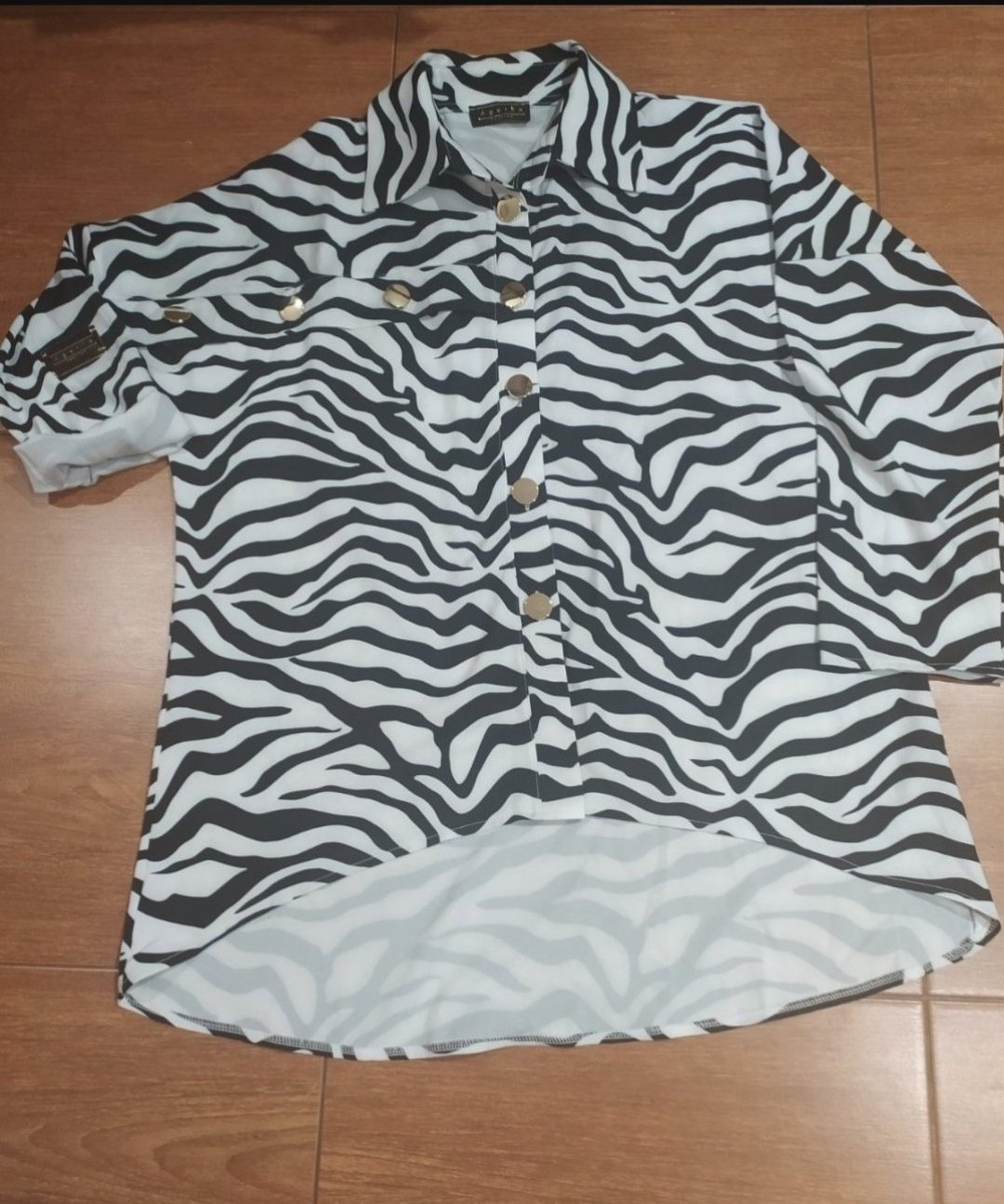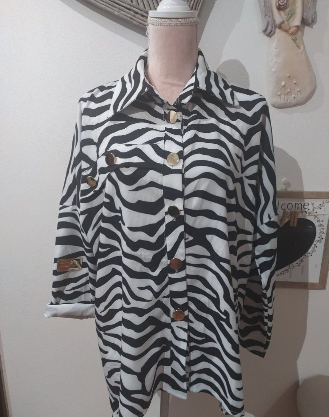 Štýlová košeľa,voľný strih,predný diel o niečo kratší,zapínanie na veľké zlaté gombíky.Vel Uni vhodné pre veľ M-Xl,top stav