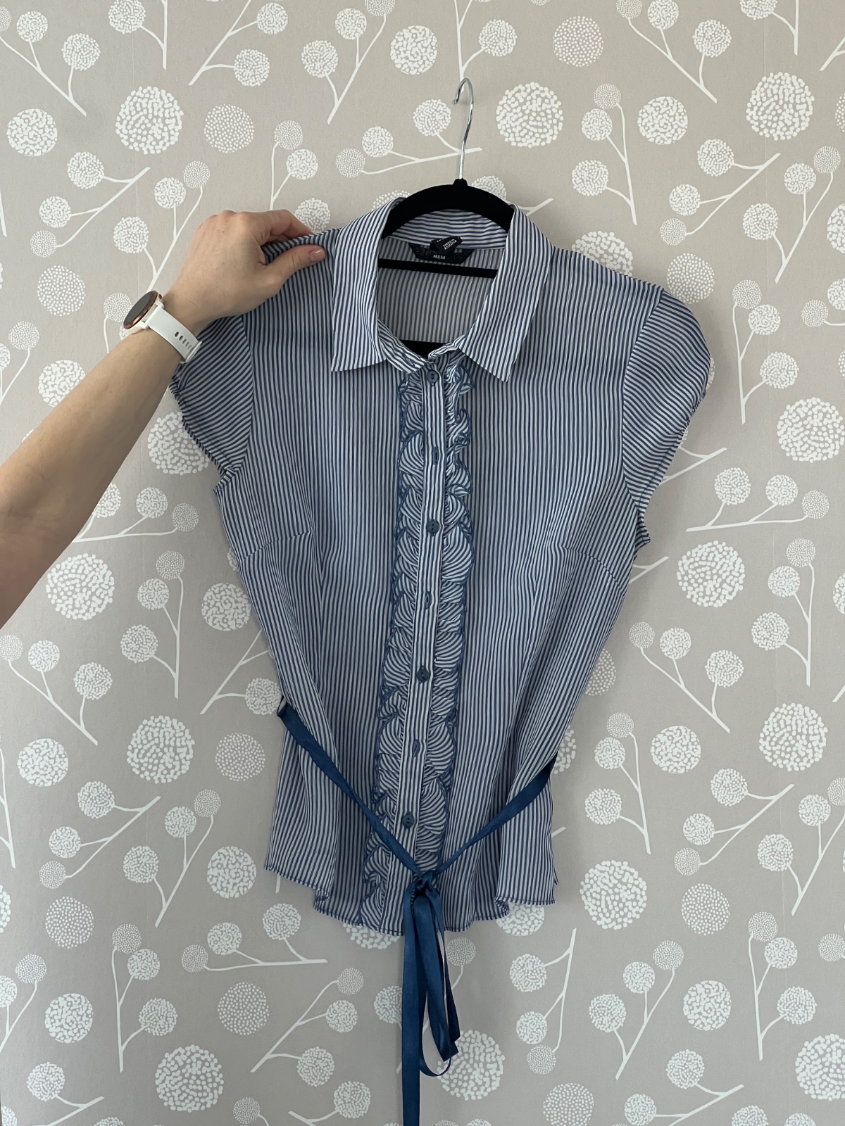 Veľmi málo nosená bielo-modrá bavlnená blúzka. Sedí na S alebo menšie M, keďže je z pevnejšieho materiálu.