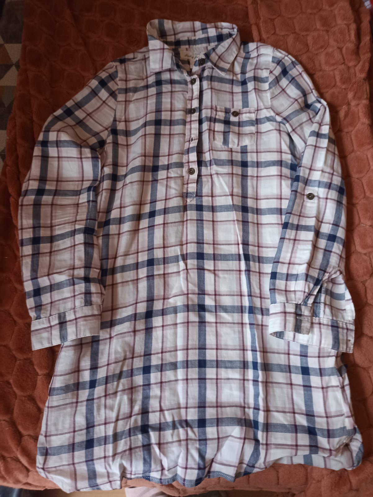 Predám dievčenskú košeľu - tuniku, odopínanie na gombíky dopoly hrudníka, vzadu trošku predĺžená, má malé vrecká na boku, rukávy sa dajú vypnúť na 3/4. opasok je k nej. Károvaná bielo-šedo-ružové káro. veľ.140, cena 5,-€ spolu s poštovným