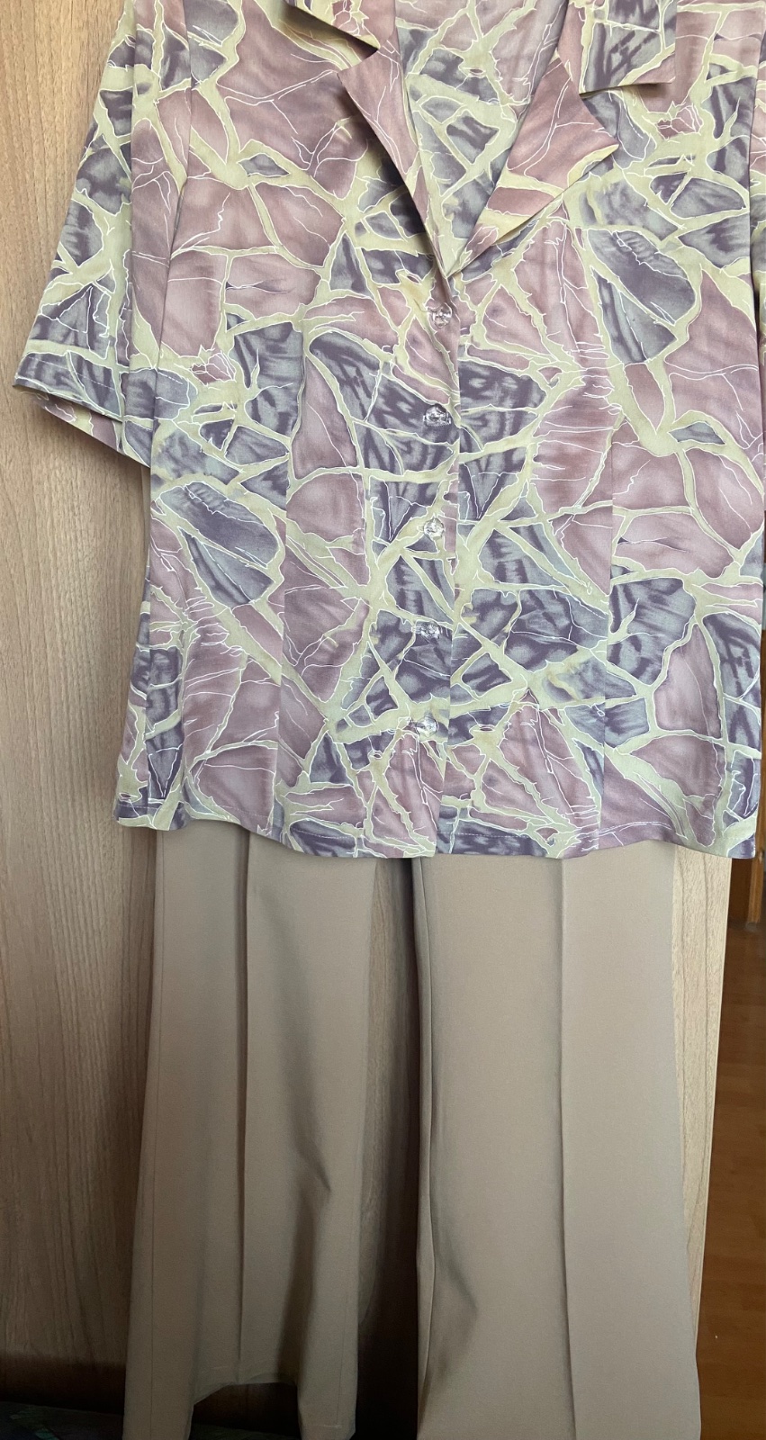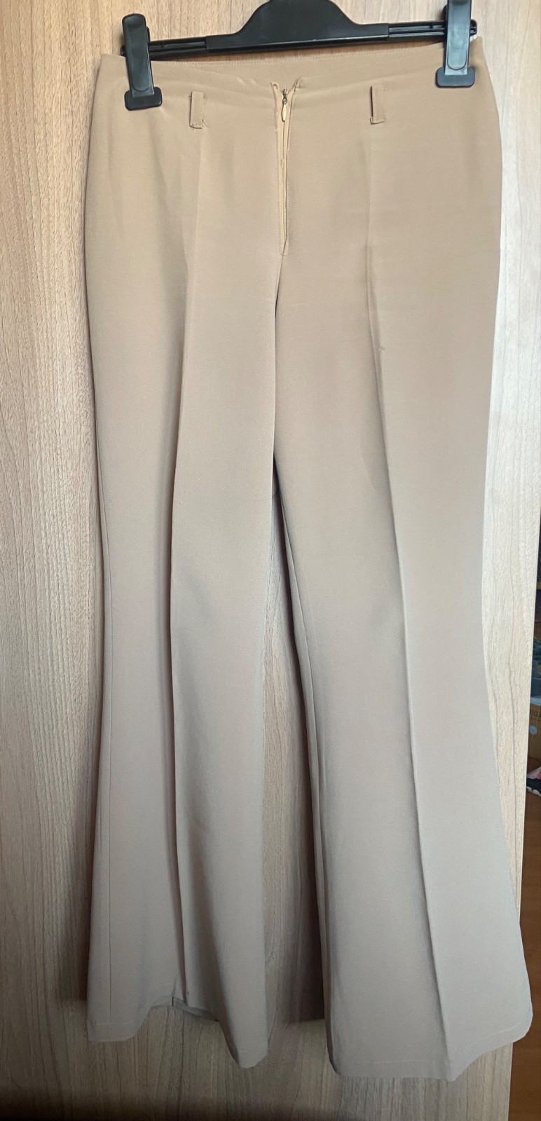 K blúzke ponúkam bledohnedé nohavice veľkosť 38. Tiež nekrčivý materiál. Pás šírka 35 cm, dĺžka K 96 cm. Boky šîrka 45 cm. Za 6 €.