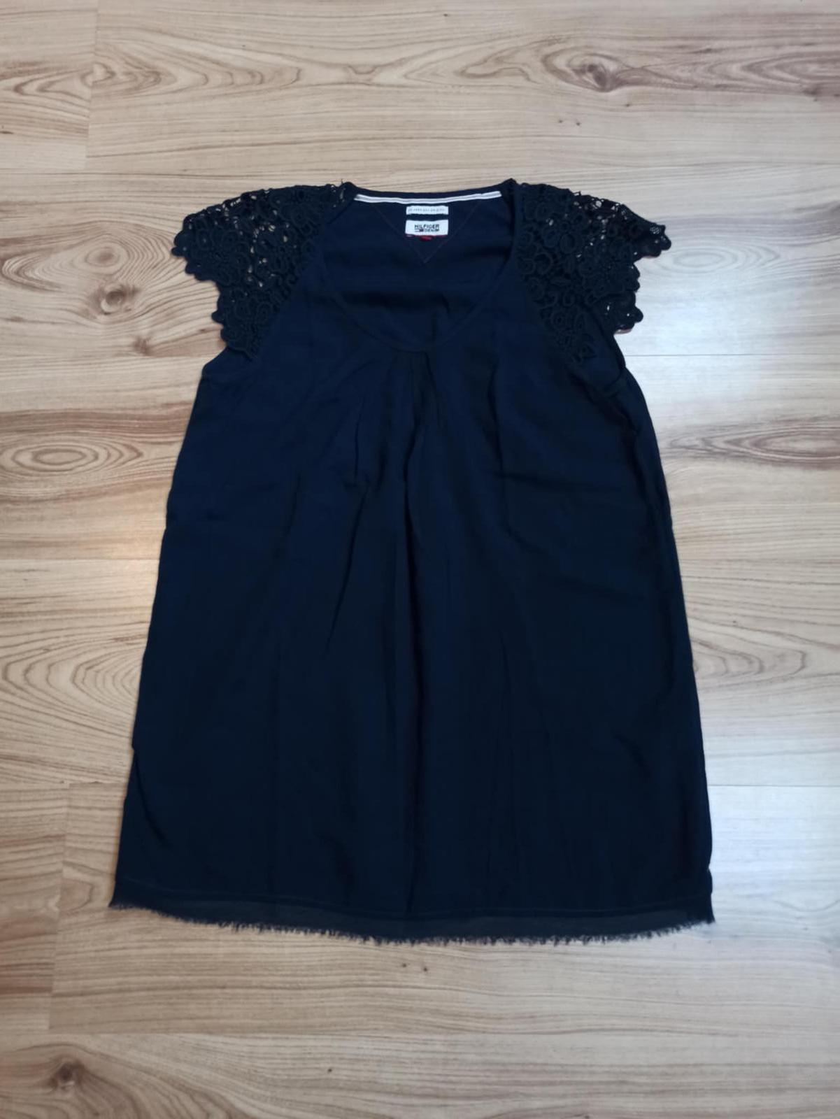 Tmavomodra, skoro az cierna farba, bezchybny stav. Bluzka je priesvitna, treba pod nu obliect este tielko. Hore sa da zapnut patentkou az ku krku. 100% polyester. Dlzka: 68cm Sirka: 49cm