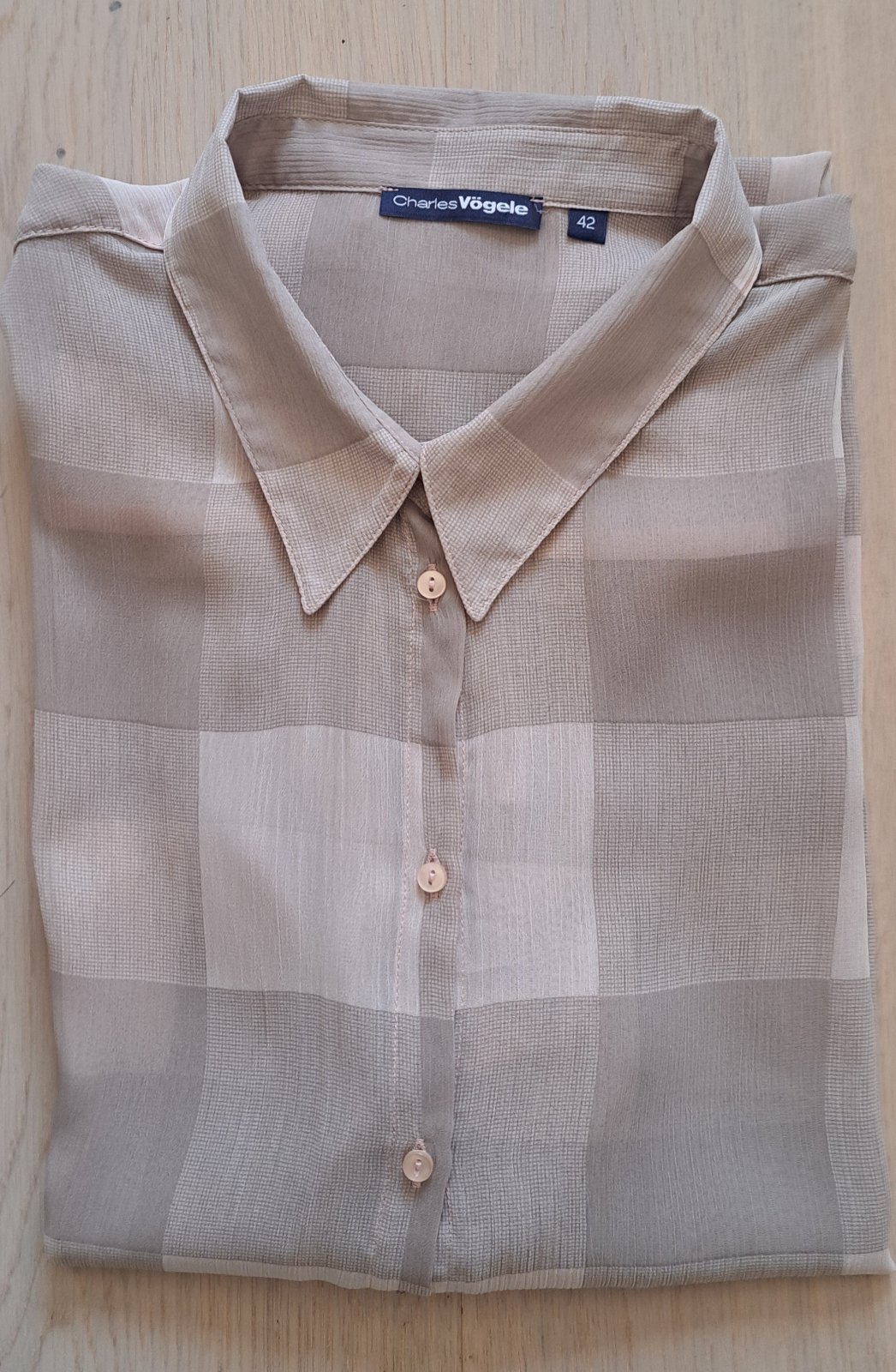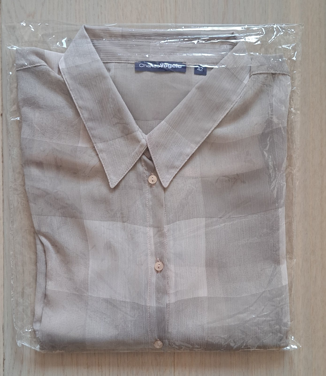 Nová priesvitná blúza veľ.42 , značka Charles Vögele, jemne vrúbkovaná štruktúra látky, po bokoch rázporky. Rozmery: cez prsia 2x 54cm, celková dĺžka 89 cm.