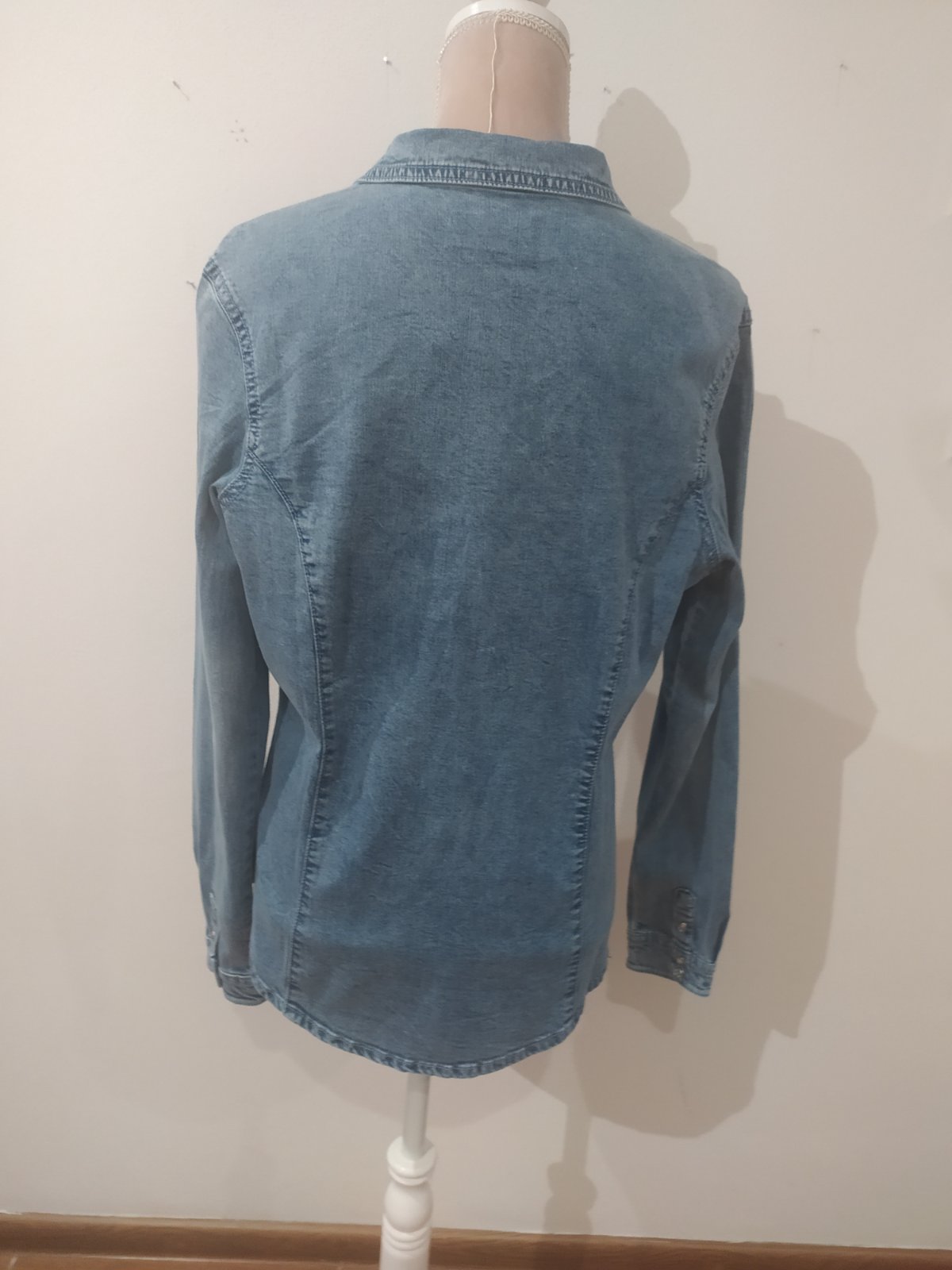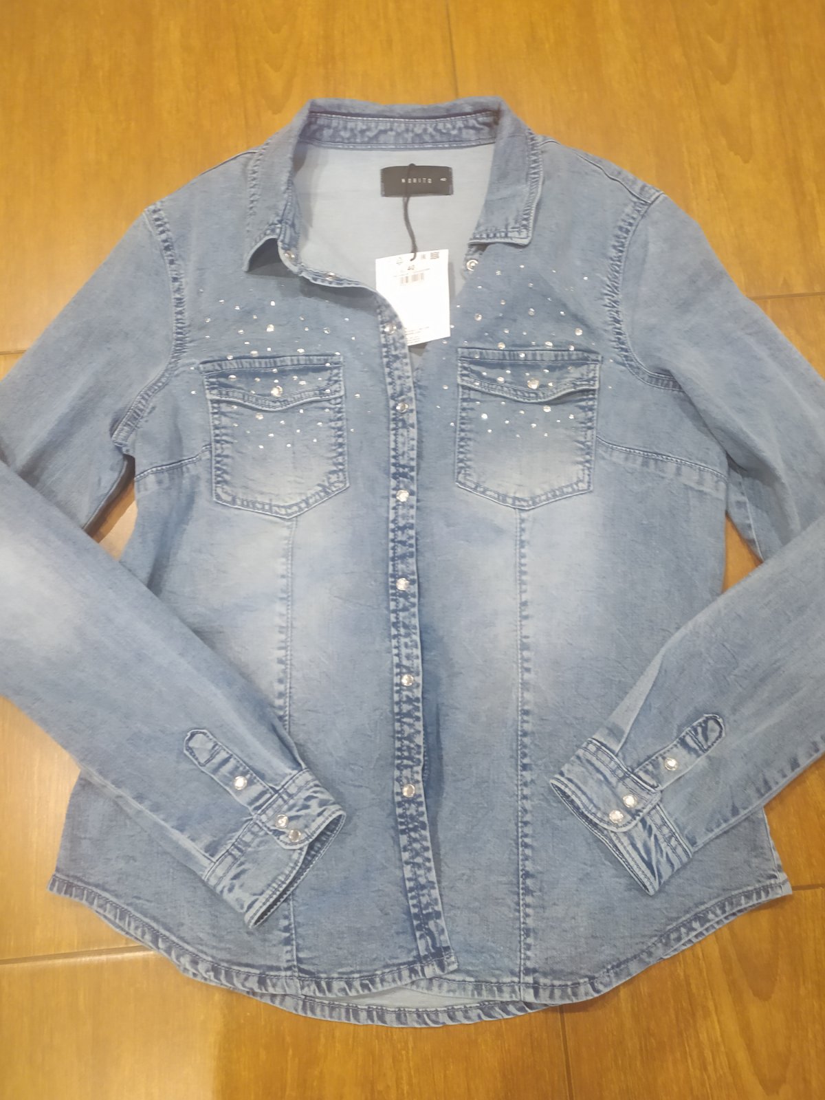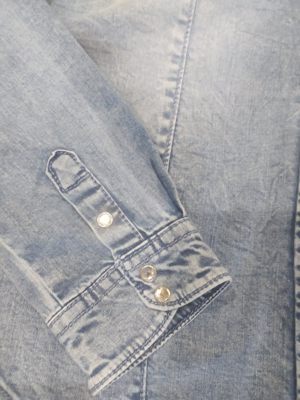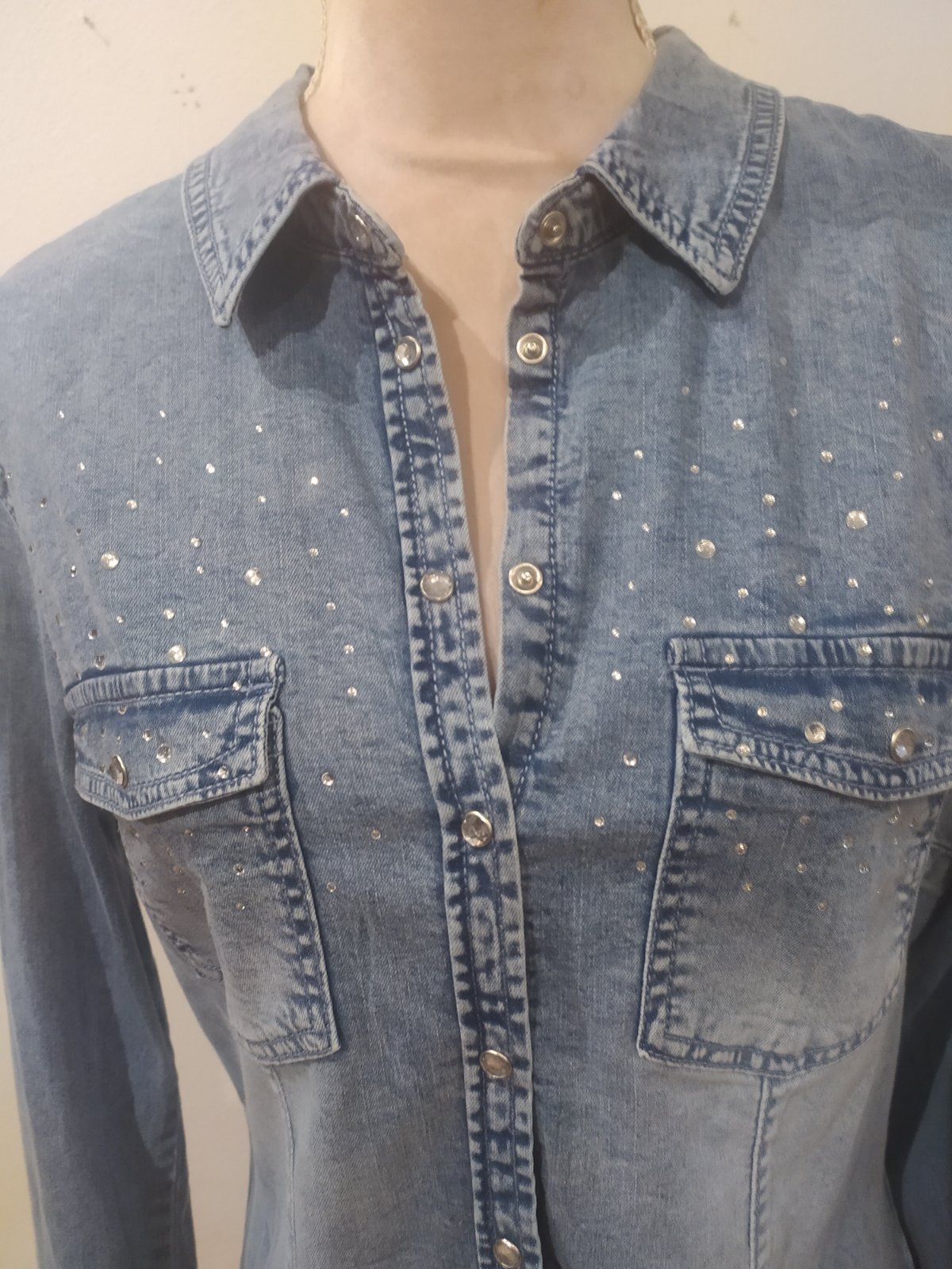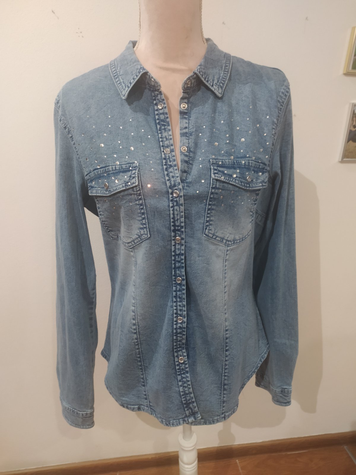Riflová košeľa zdobená kamienkami,elastická zapínanie na patenty so zirkónmi