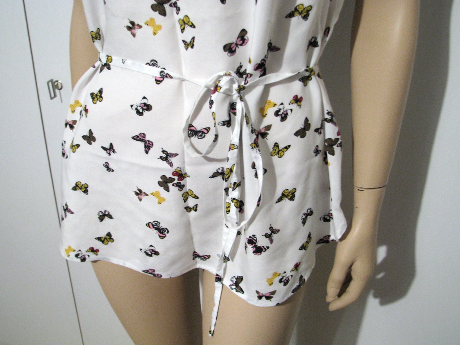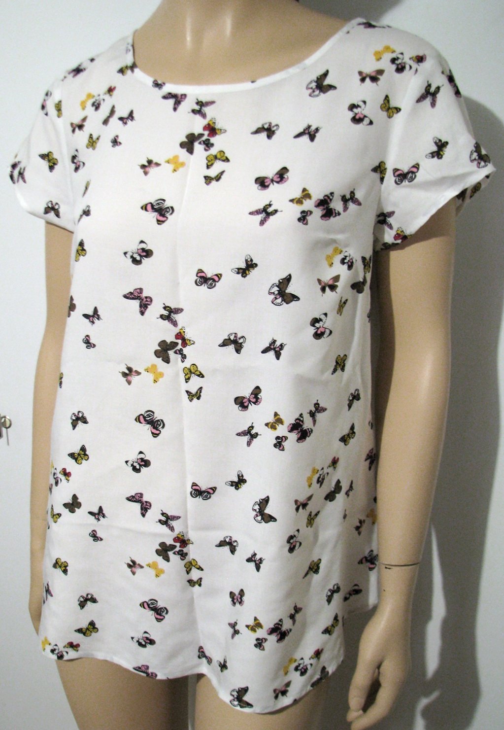 Krásny top - blúzka s farebnými motýlikmi na bielom podklade. Je k nej aj tenký opasok z rovnakej látky. Značka bpc. Výborne zachovalá, bez poškodení. Veľkosť je uvedená na štítku viď. foto, reálne zodpovedá asi L, no je to v podstate univerzálna veľkosť. Materiál je viskóza. V prípade záujmu premeriam.