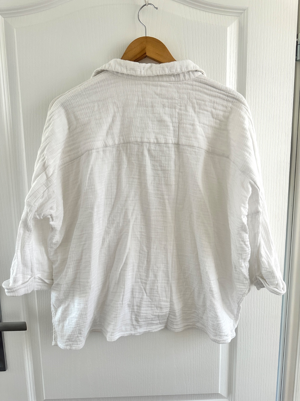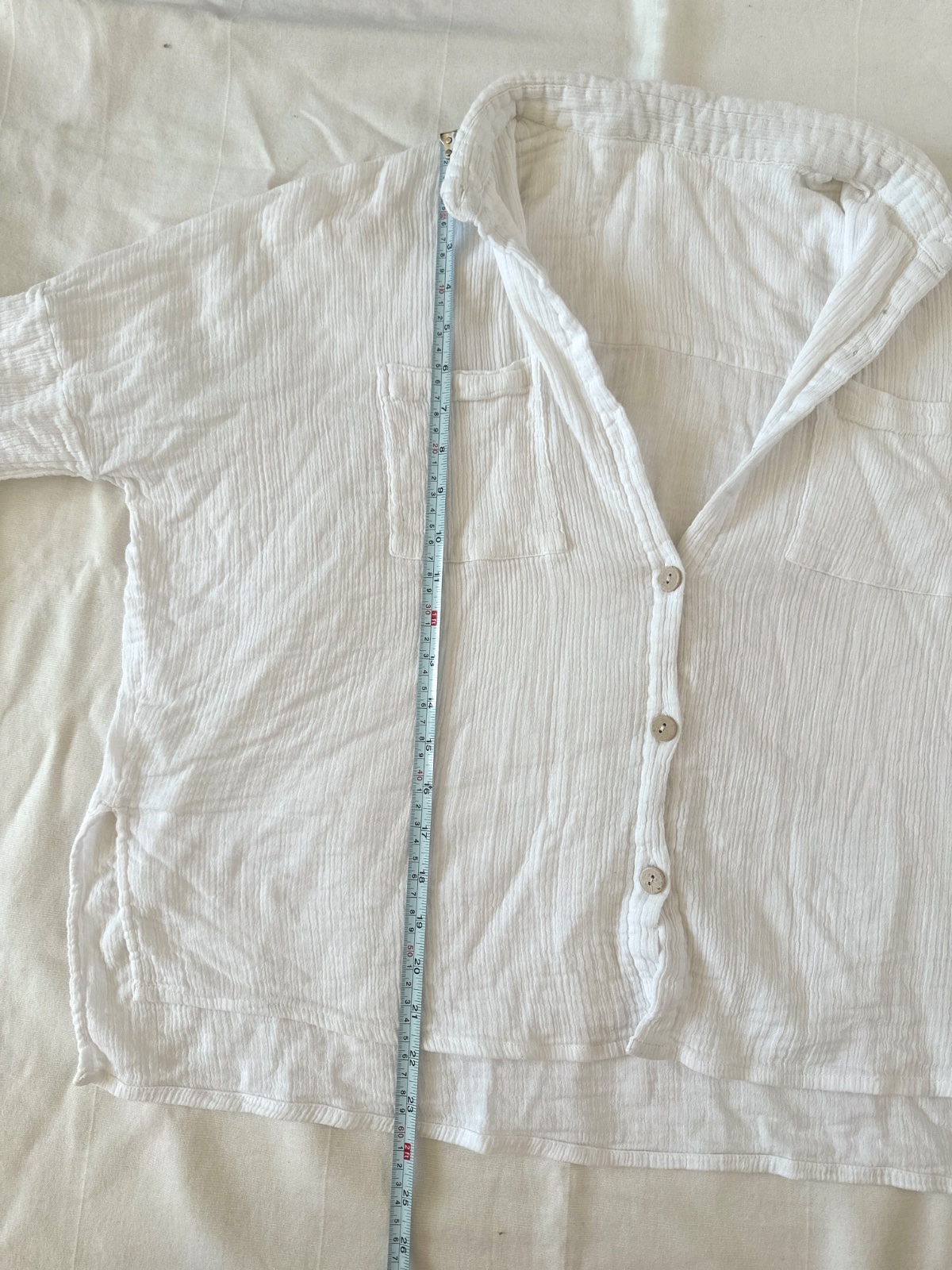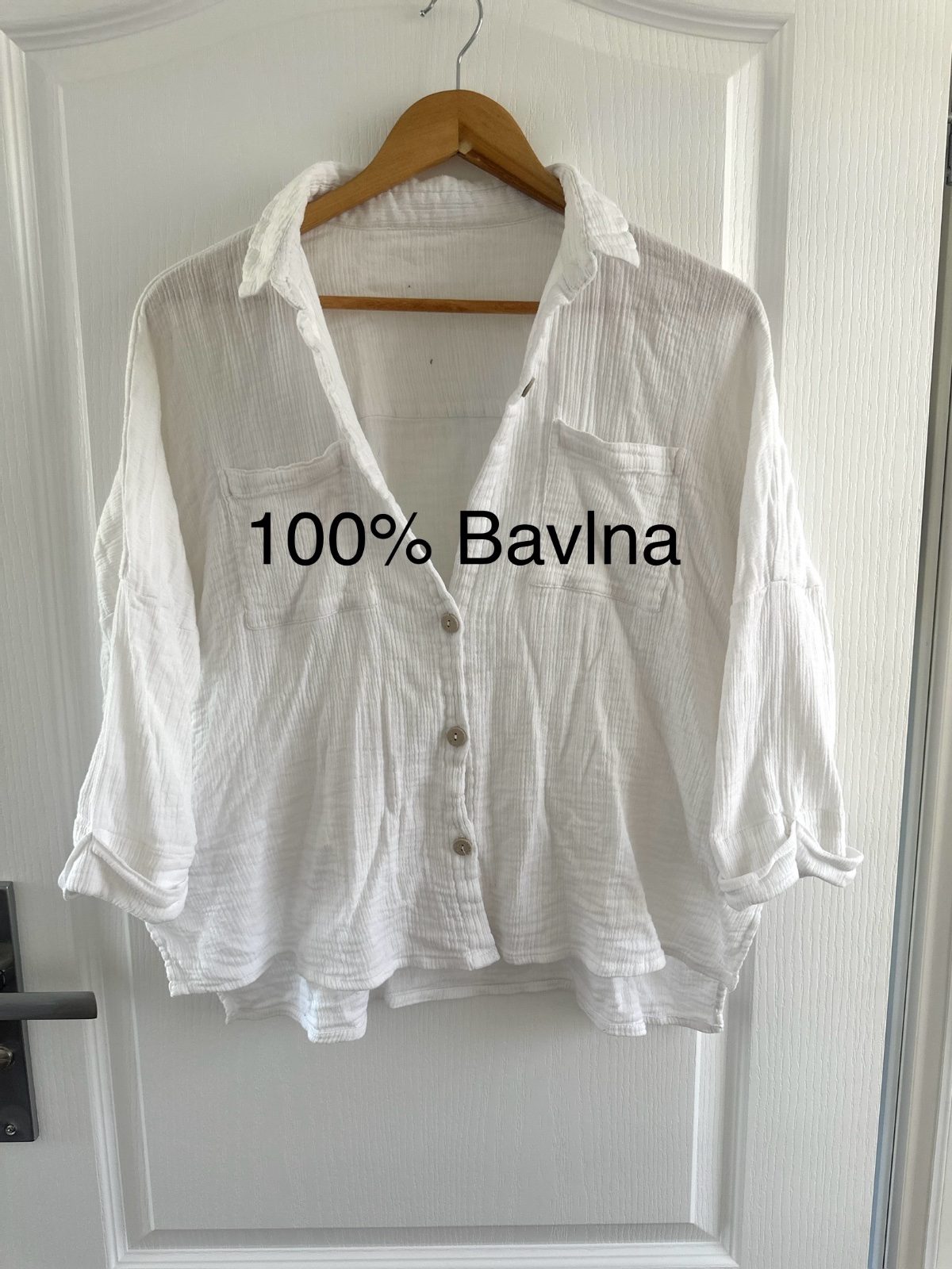 Biela mušelínová košeľa s 3/4 rukávmi. Košeľa má oversized strih so zníženými ramenami. Po bokoch má rozparky a predná časť je o niečo kratšia ako zadná. Zapína sa na malé gombíky. Bohužiaľ, jeden chýba, ako je vidieť na fotografiách, ale to neovplyvňuje jej nositeľnosť. Opísala by som ju ako univerzálnu veľkosť; všetky miery sú na fotografiách.