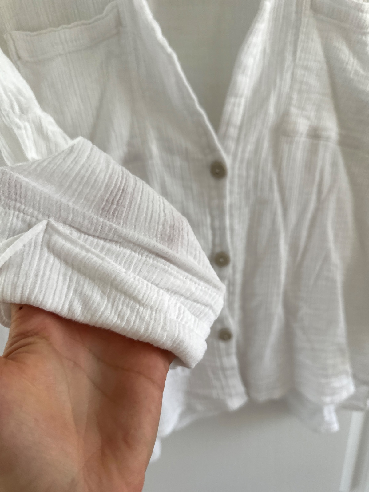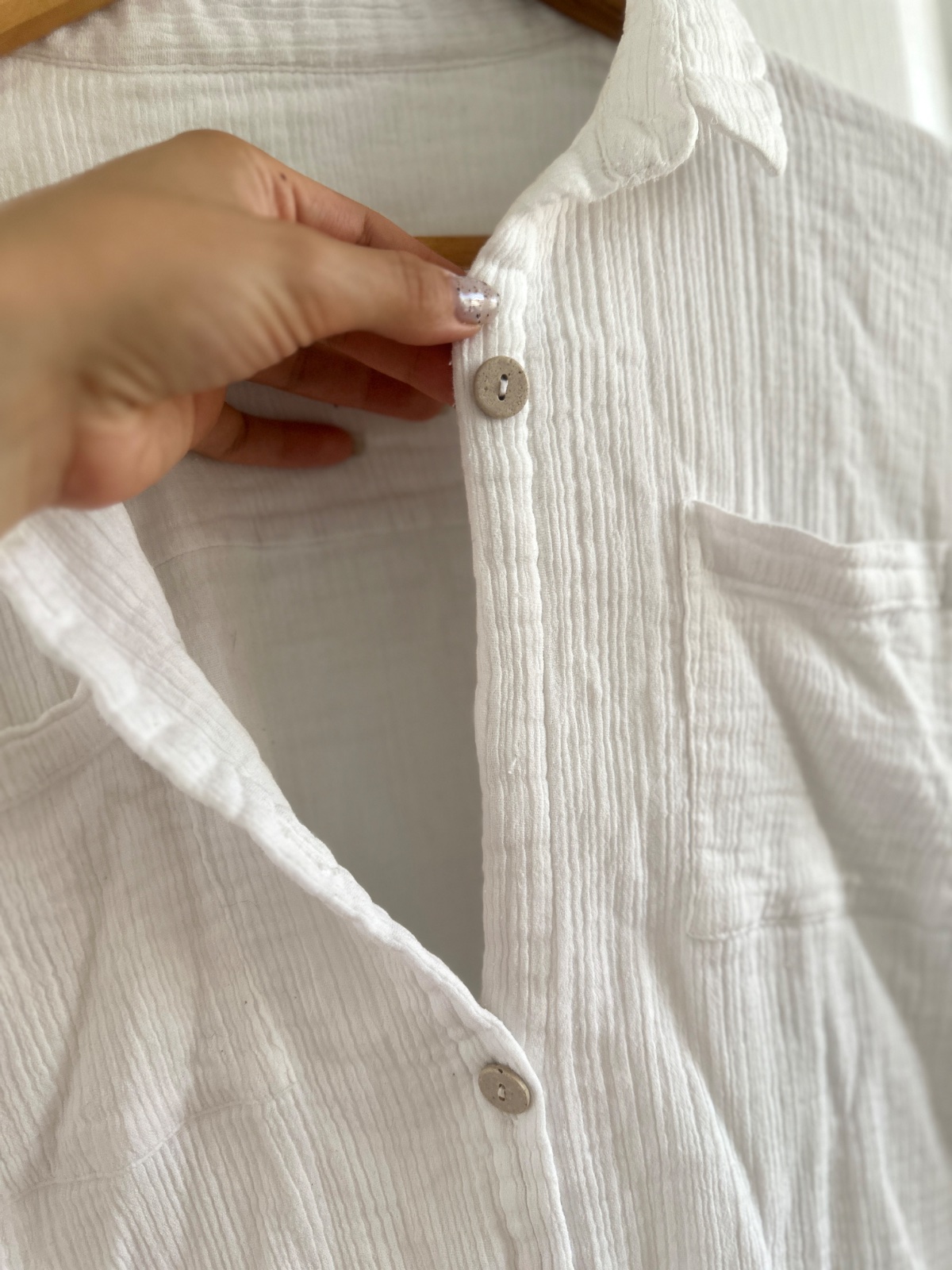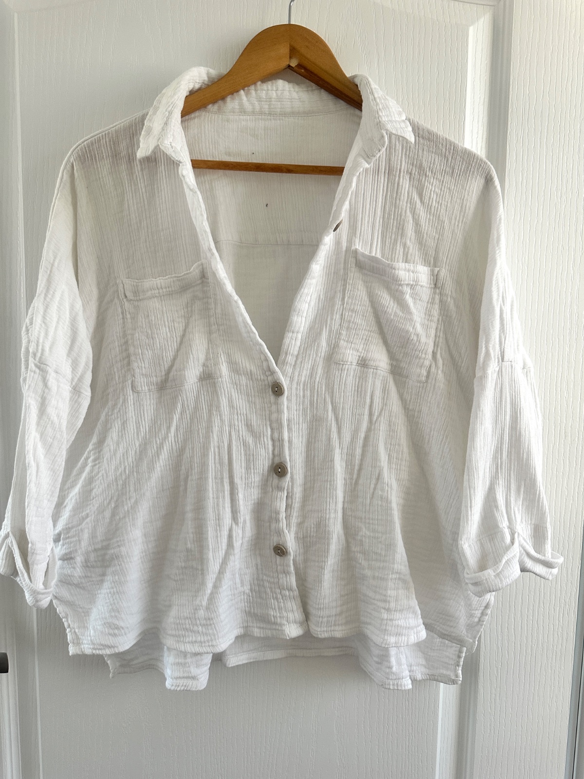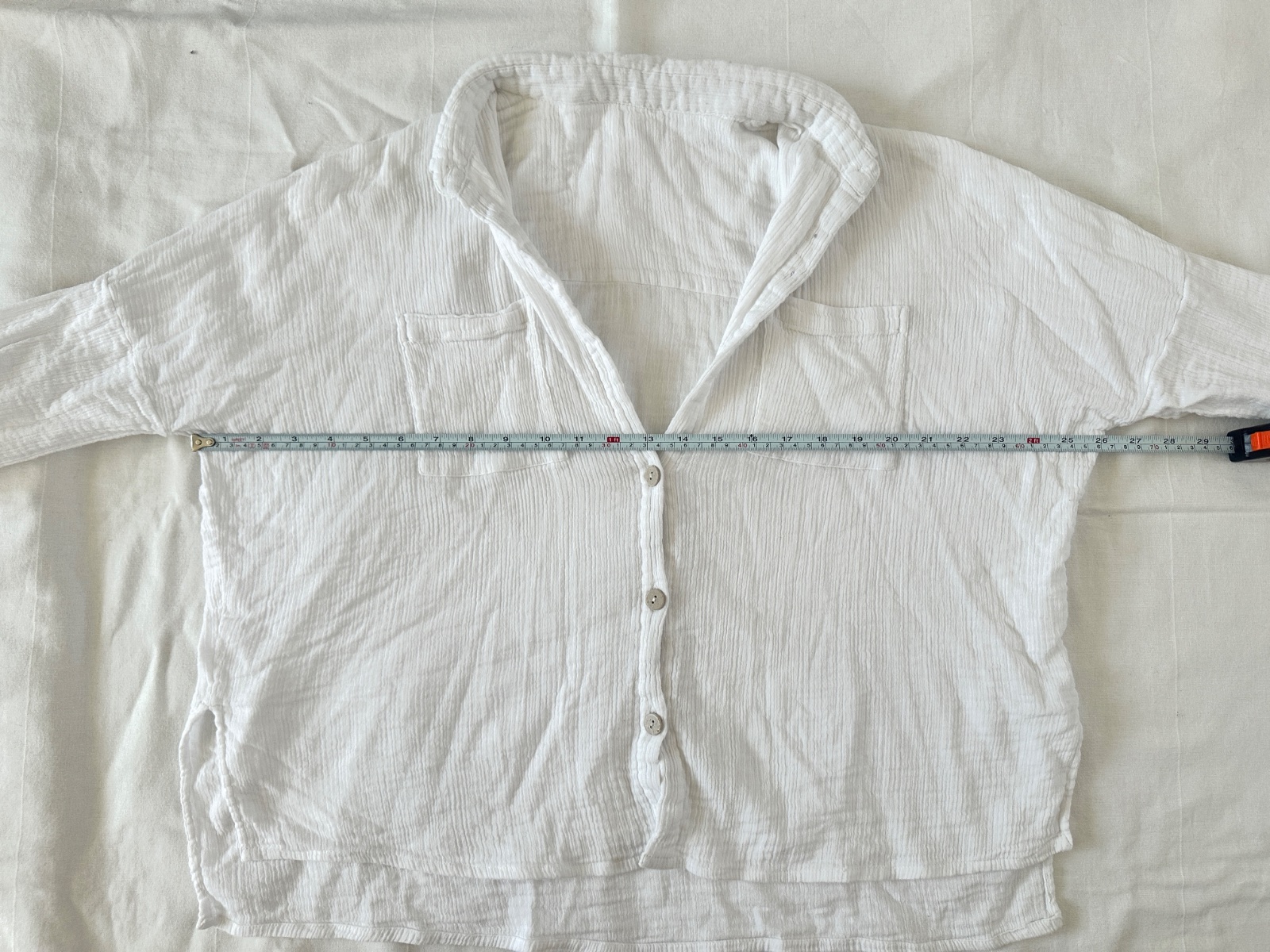 Biela mušelínová košeľa s 3/4 rukávmi. Košeľa má oversized strih so zníženými ramenami. Po bokoch má rozparky a predná časť je o niečo kratšia ako zadná. Zapína sa na malé gombíky. Bohužiaľ, jeden chýba, ako je vidieť na fotografiách, ale to neovplyvňuje jej nositeľnosť. Opísala by som ju ako univerzálnu veľkosť; všetky miery sú na fotografiách.
