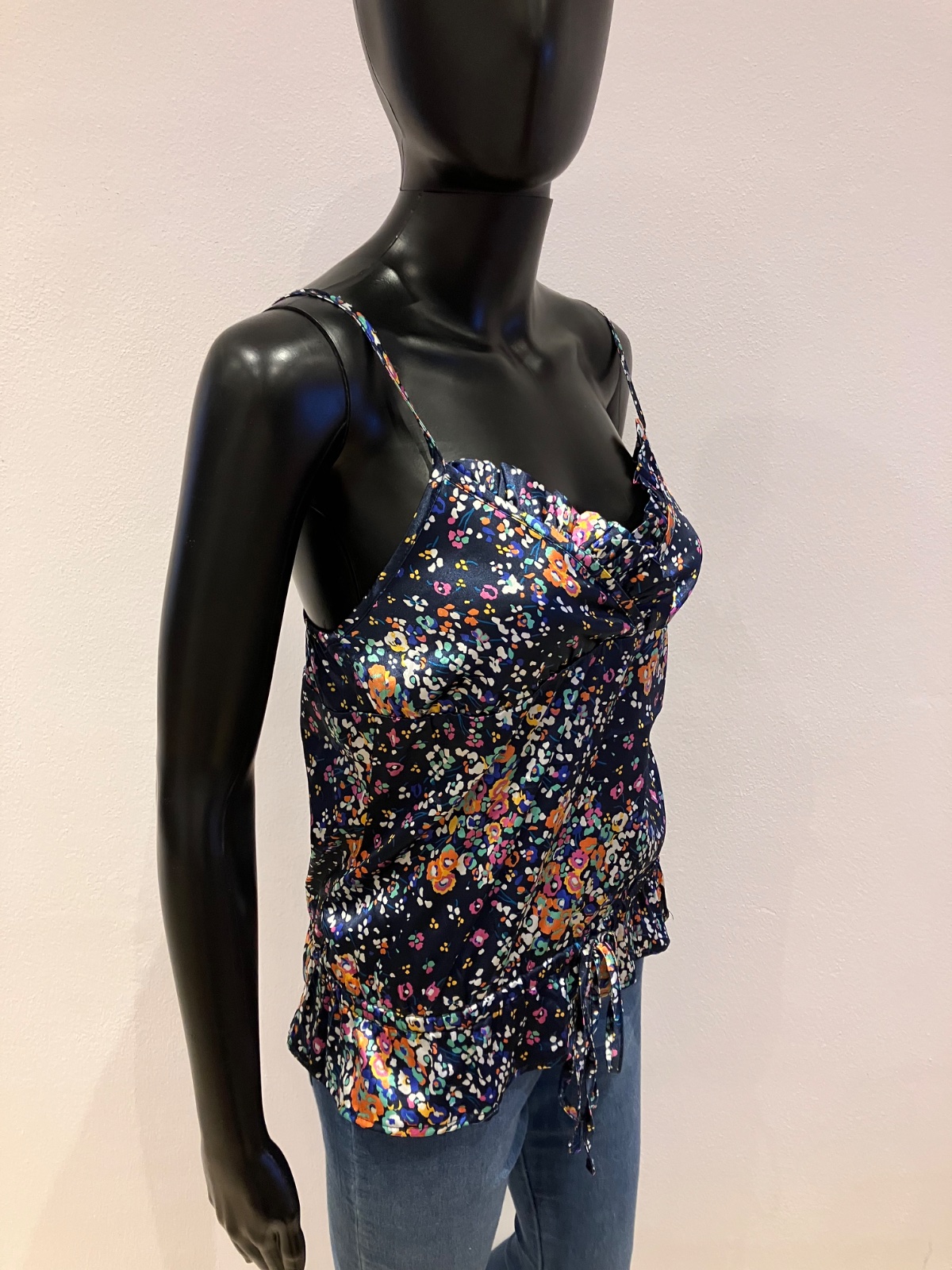 Dámsky top na tenké ramienka, ramienka sú nastaviteľné, vzadu na chrbáte a na páse na gumičku, blúzka nie je elastická, zapínanie na boku na zips. Veľkosť cca M.