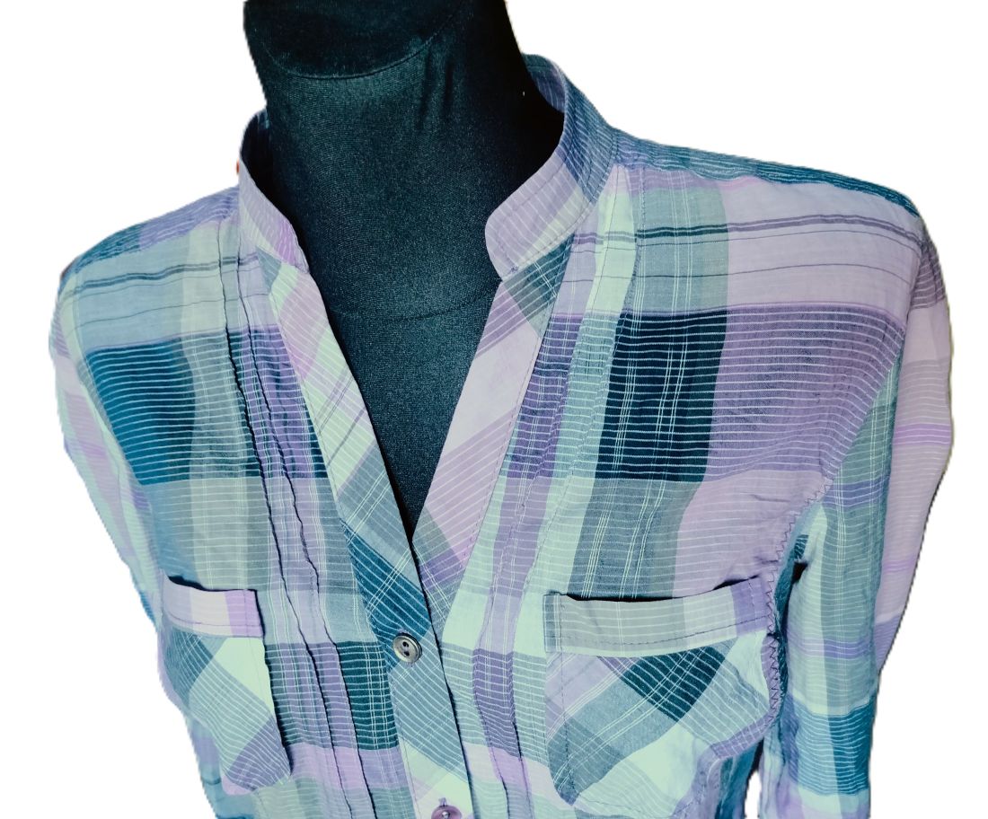 Pekná blúzočka v odtieňoch sivej a fialovej. Má mierne pokrčený vzhľad, ľahká vzdušná bavlna. Miery: pod pazuchami 50*2, dĺžka 65cm, v spodnej časti akoby volánik. V top stave, takmer nenosená. Nemecká značka Bonita.