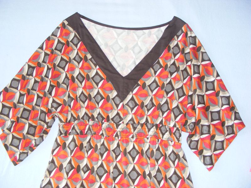 Dámska tunika, výstrih do V-čka, pod prsiami gumička, strih, ktorý zakryje malé nedostatky.
