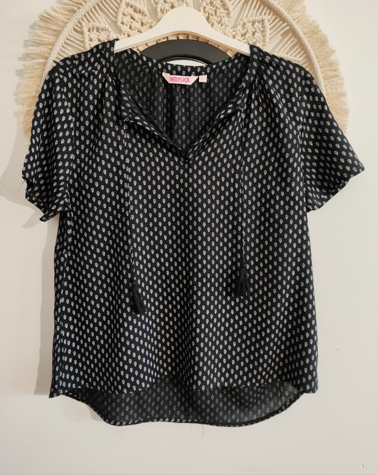 🖤 Košeľová blúzka značky N&P NUOPAI 👚 Veľkosť: L ✨ Krátky rukáv, jemne priesvitné vzory po celej blúzke 🔸 Ľahučký materiál – 100 % polyester, priedušná a pohodlná na nosenie 🌸 Elegantný a univerzál...