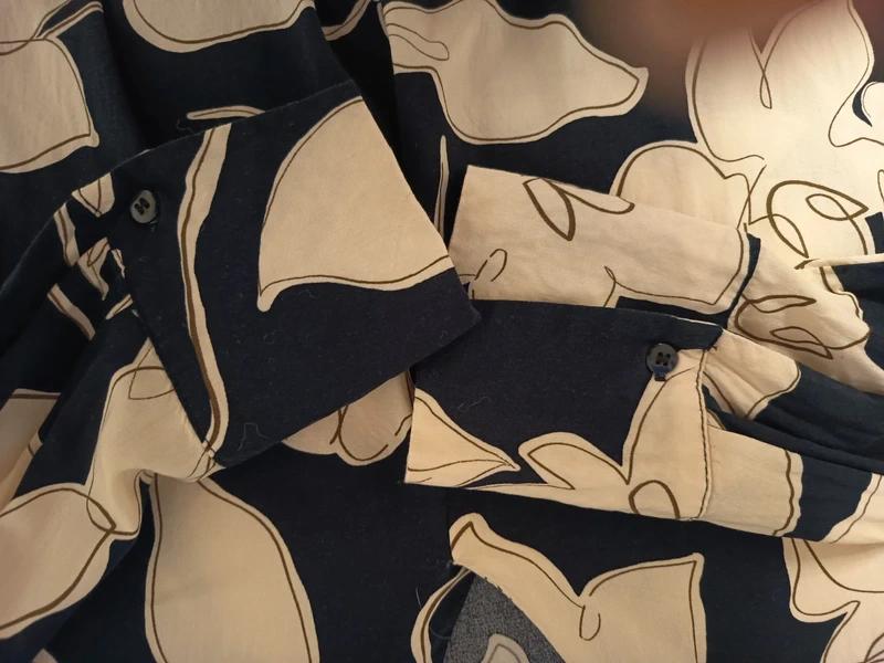 Zaoblený spodný okraj, večkový výstrih s ozdobným zahybom a klasickým golierom, dlhé rukávy so širokou manžetou.