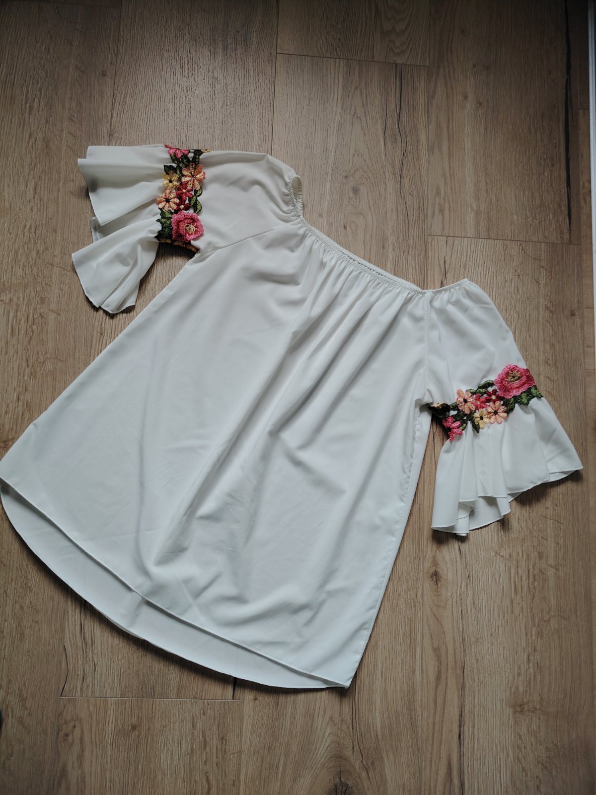 Blúzka oblečená pár krát. Je vo veľmi dobrom stave. Šírka pod pazuchami 54cm, dĺžka 64cm. Štítok vystrihnutý, veľkosť je len odhad.