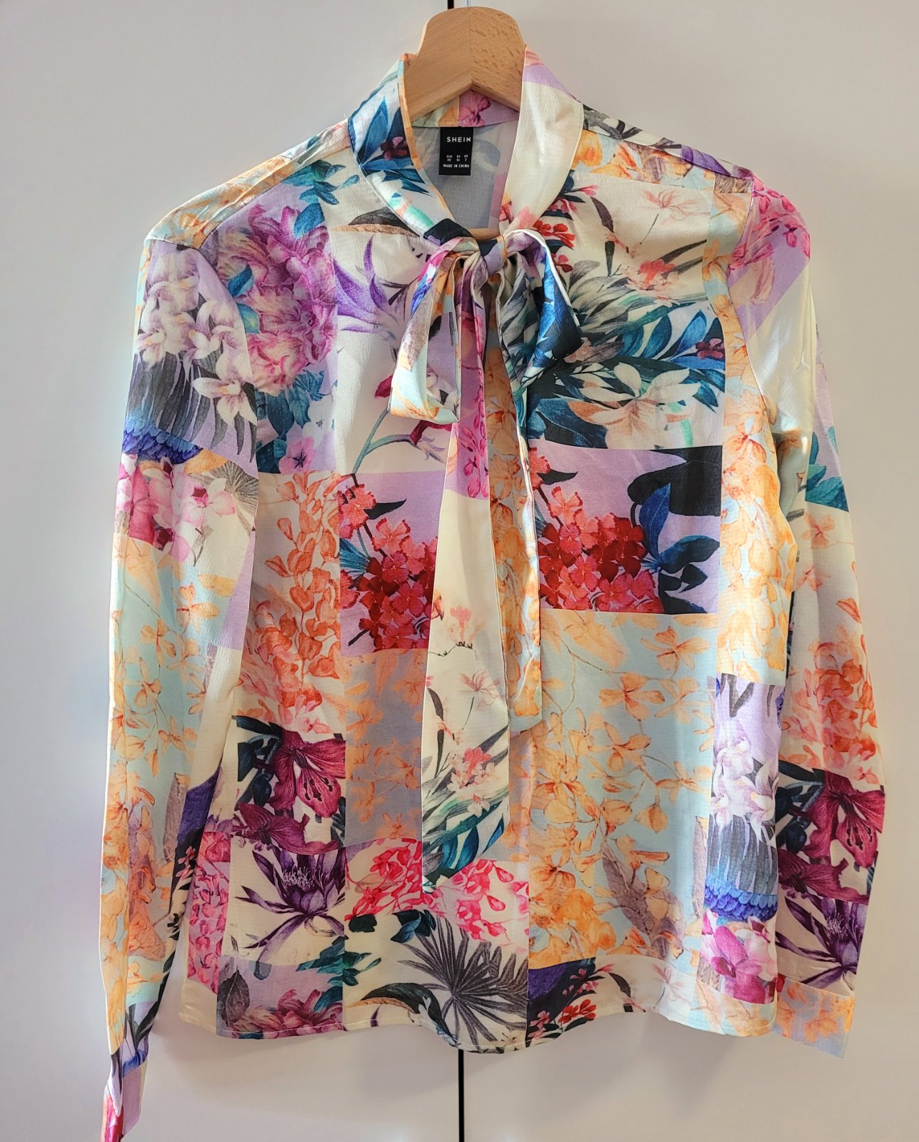 Jemná kvetová blúzka, krásny vzor, dlhý rukáv ukončený gumičkou,fodrou. Vvýstrih, okolo neho fodrička a gombíky. Rozmer: rukáv od gol.:57cm,prsia š:46cm max.,dĺžka:55cm,zadná d:57cm.