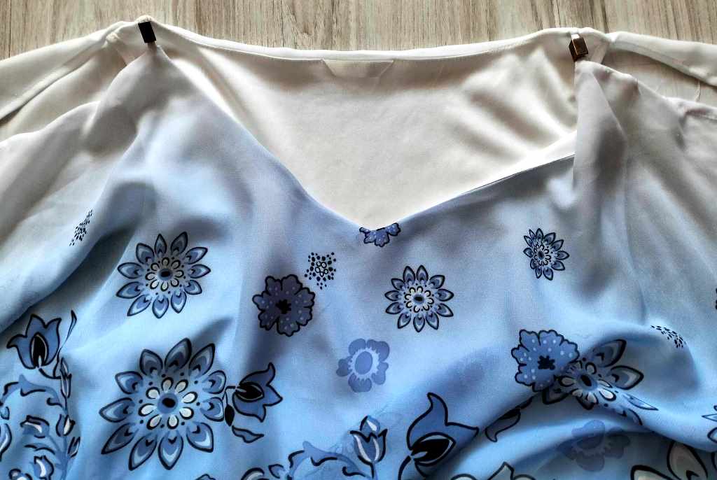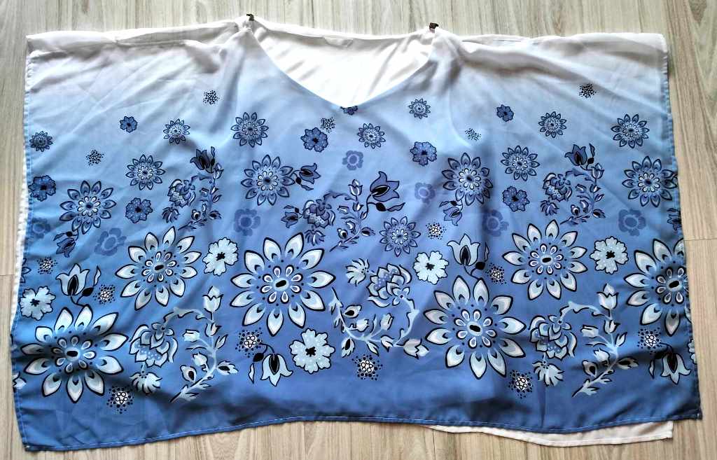 Predná časť je skôr bledomodrá so vzorom kvietkov, zadná časť je biela.