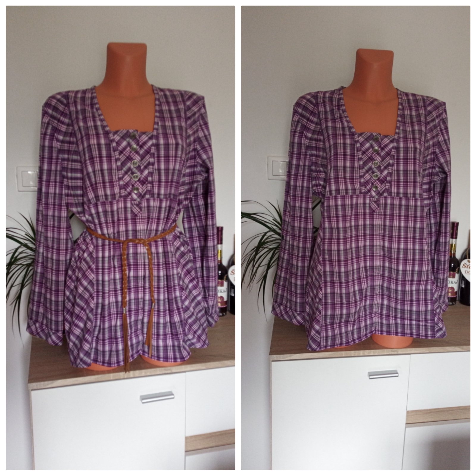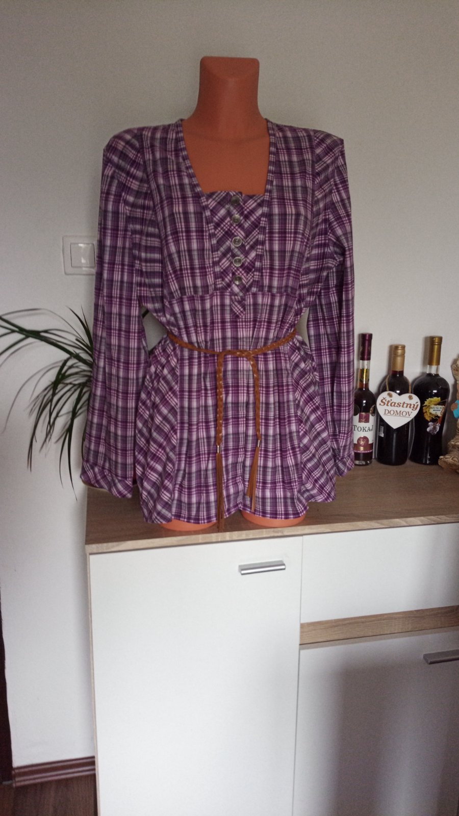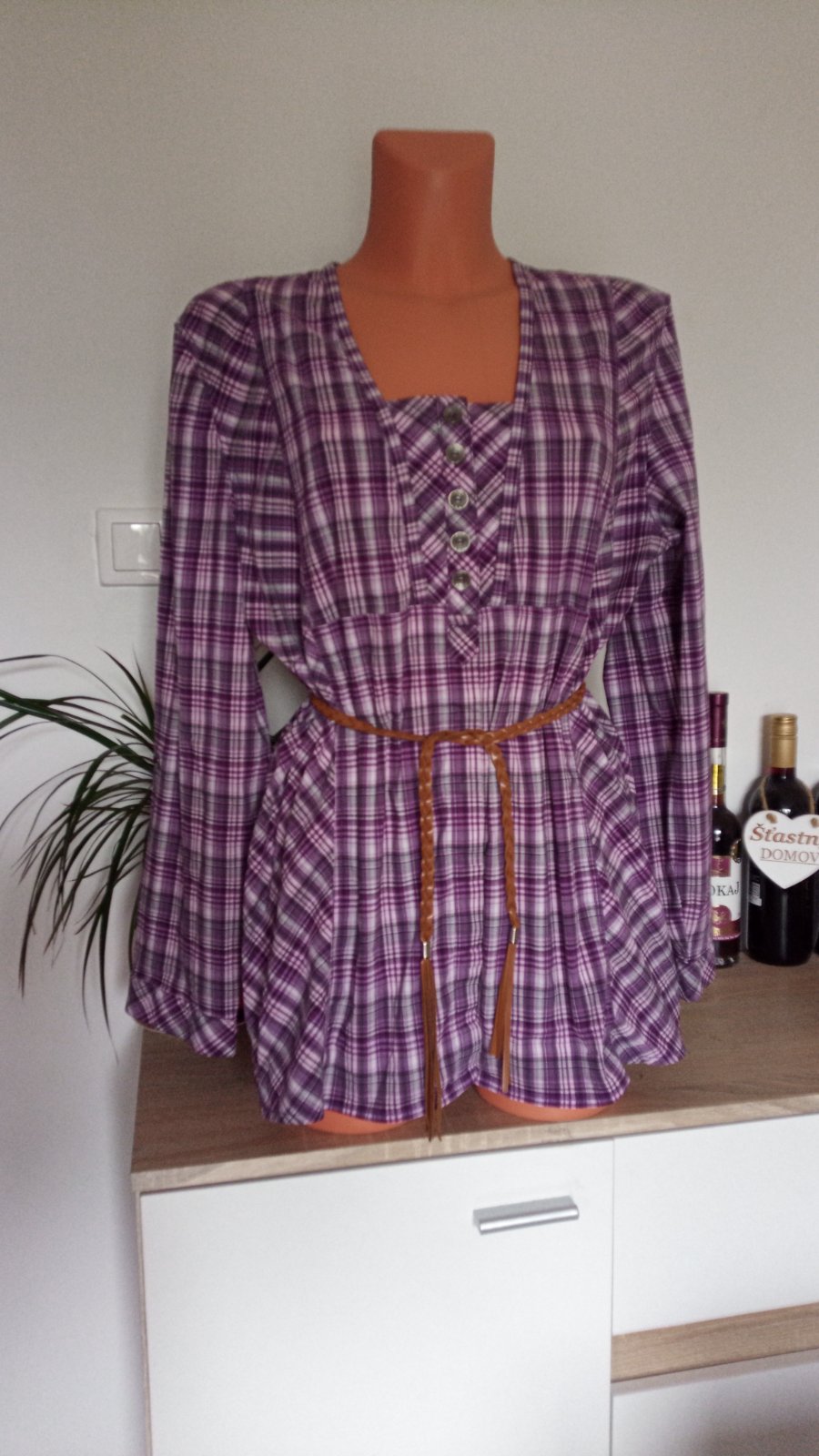 Výborný stav. Veľkosť udáva XL, ale oblečie aj XXL,XXXL,je dosť široká. Vhodná aj v tehotenstve. Predávané BEZ OPASKU.